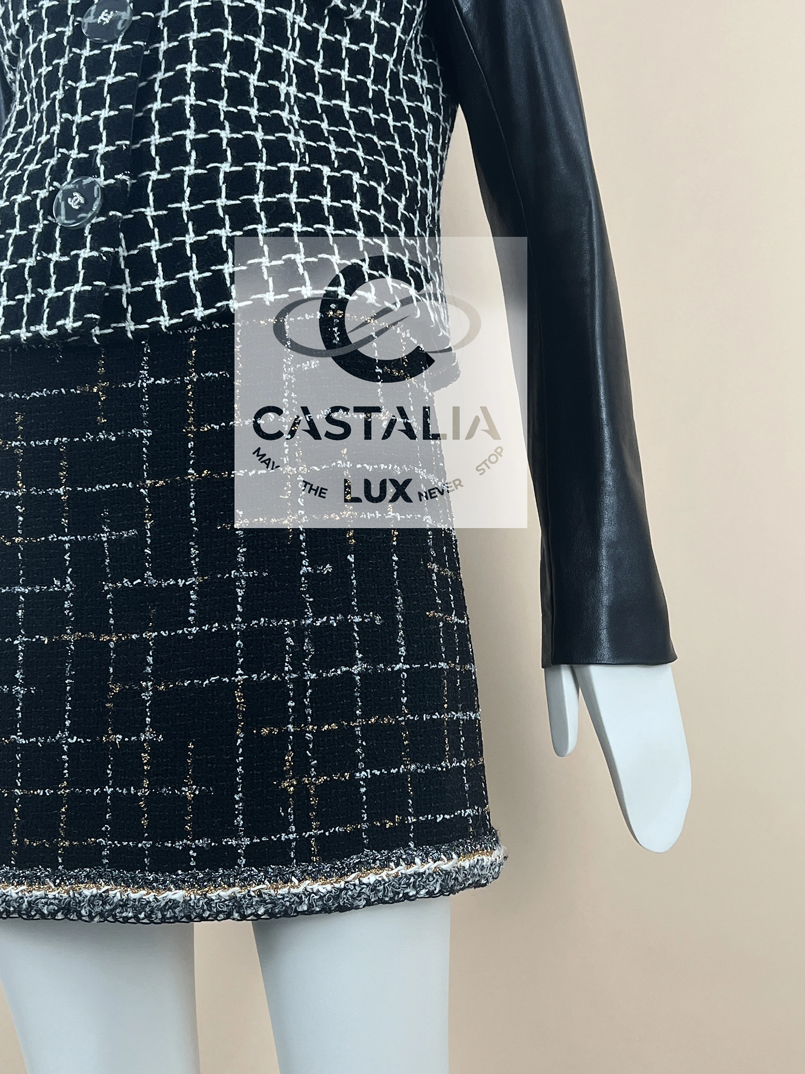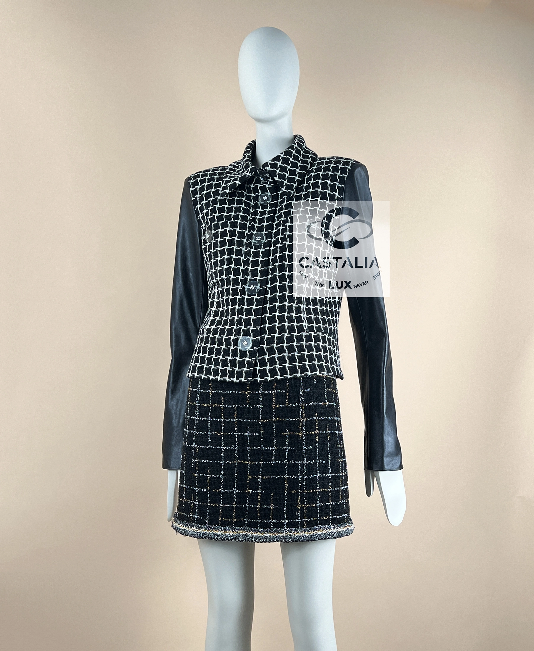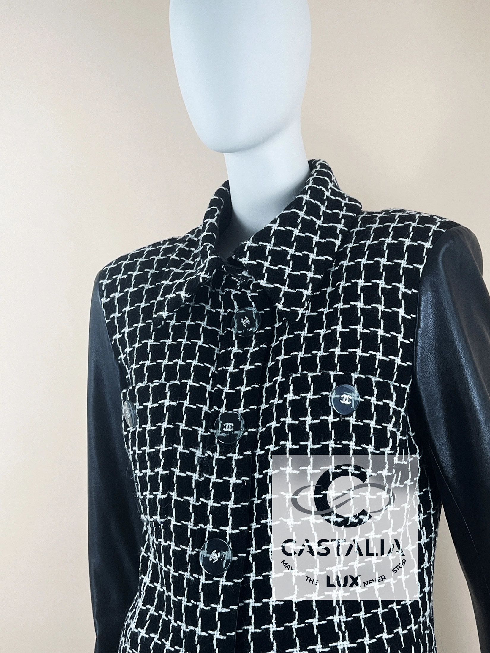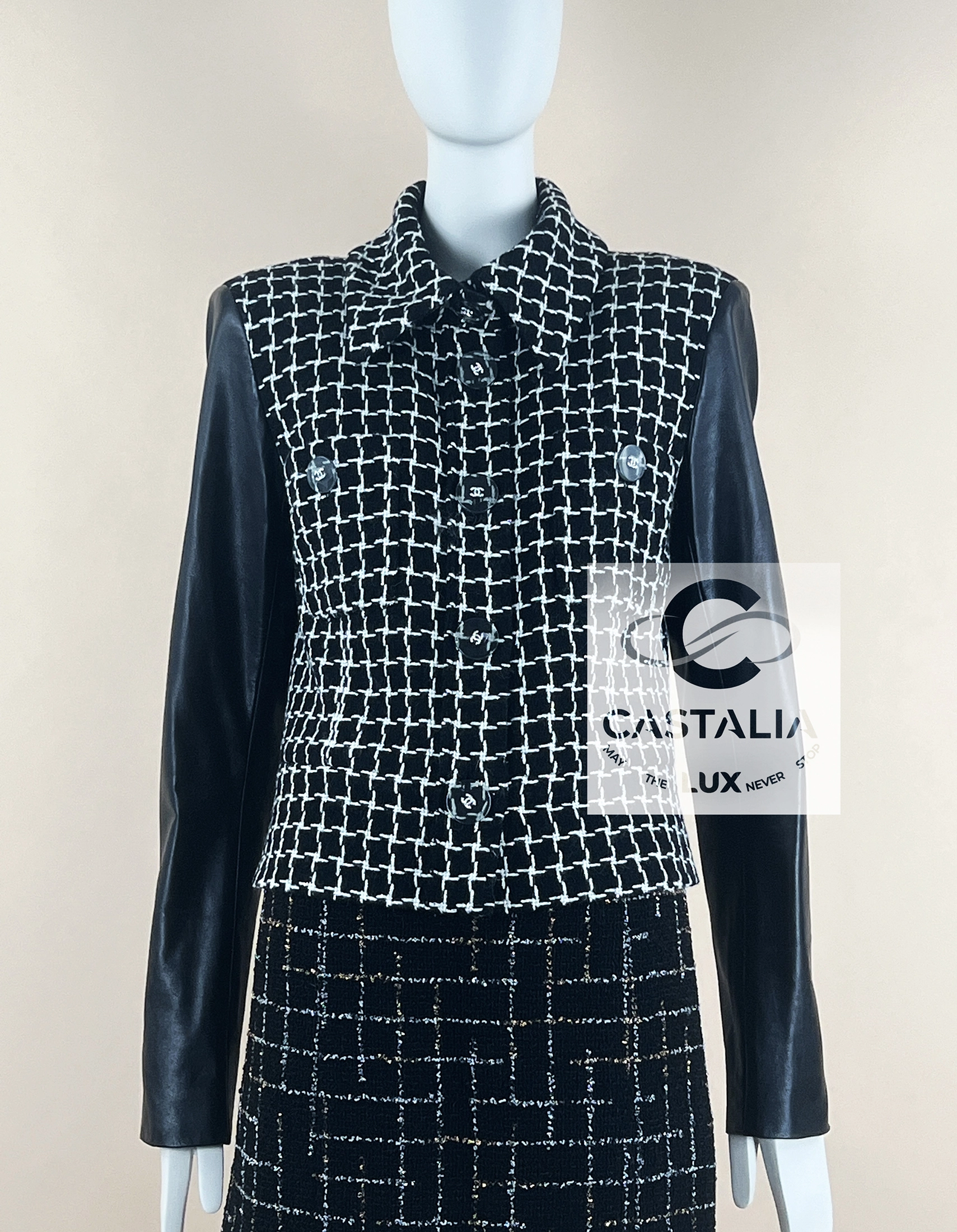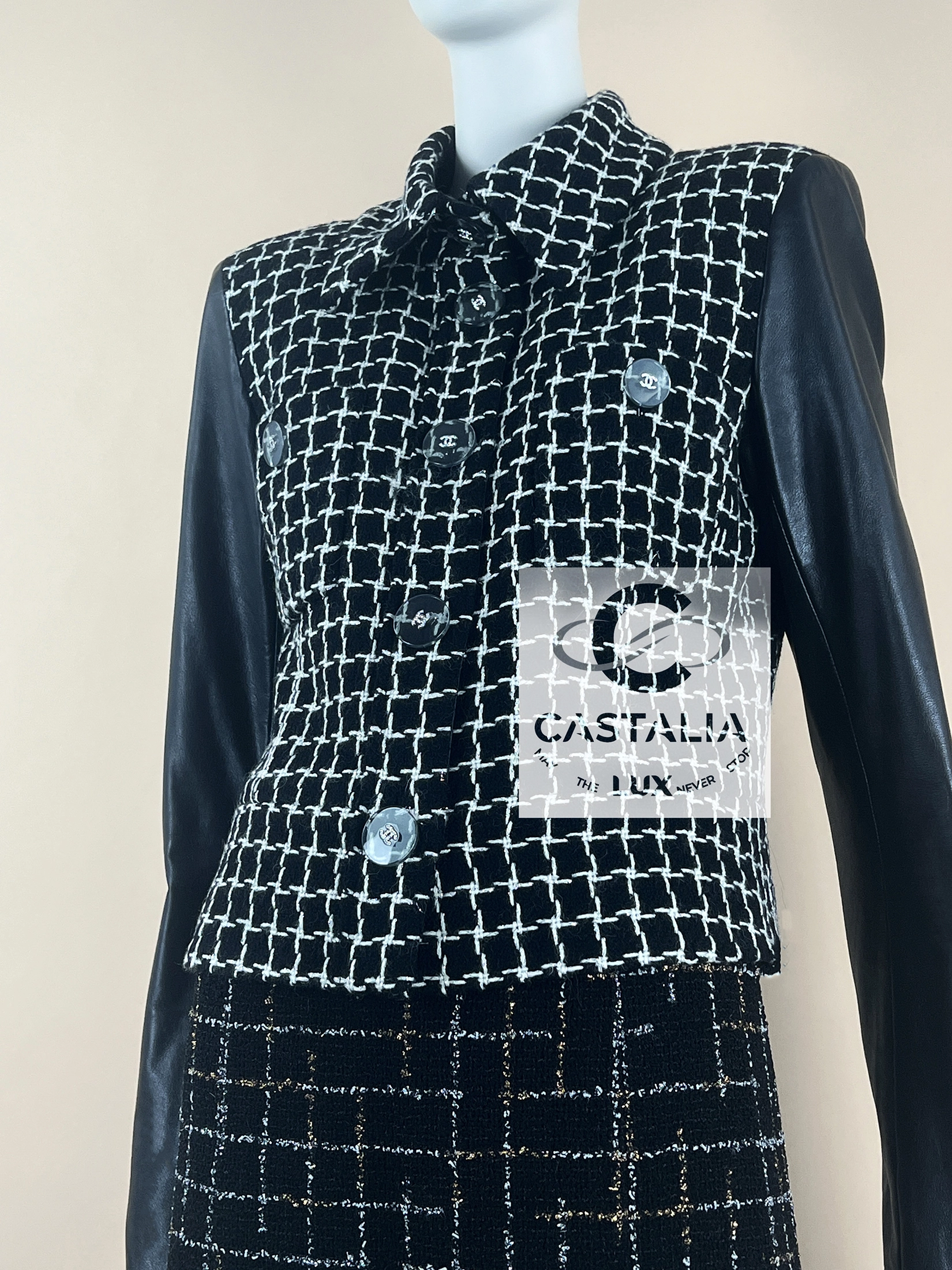 Chanel Black Shimmer Tweed Jacket with Leather Sleeves — Relic of the Paris / COSMOPOLITE 2017 Métiers d’Art Collection Boutique value: over $13,000 ~ A relic of the Maison’s metaphysical vocabulary — at once an armor for the Cosmopolite Urban Huntress and an oracle’s mantle, bearing the eternal axis of shimmer and shadow // Size mark 40 FR / Condition: never worn // — Woven in a celestial grid of black and white, the checkered tweed shimmers with interlaced threads, as though mapping the constellations of a cosmopolitan night sky — sharpened by black lambskin sleeves, a dialogue between the softness of couture tradition and the precision of modern craft — translucent Gripoix jewel buttons crowned with the iconic CC, each closure gleams like an astral seal of Chanel mythology — Within, the secret luxury of black silk lining and the maison’s discreet chain link hem offer weight, drape, and whispered resonance of couture ritual