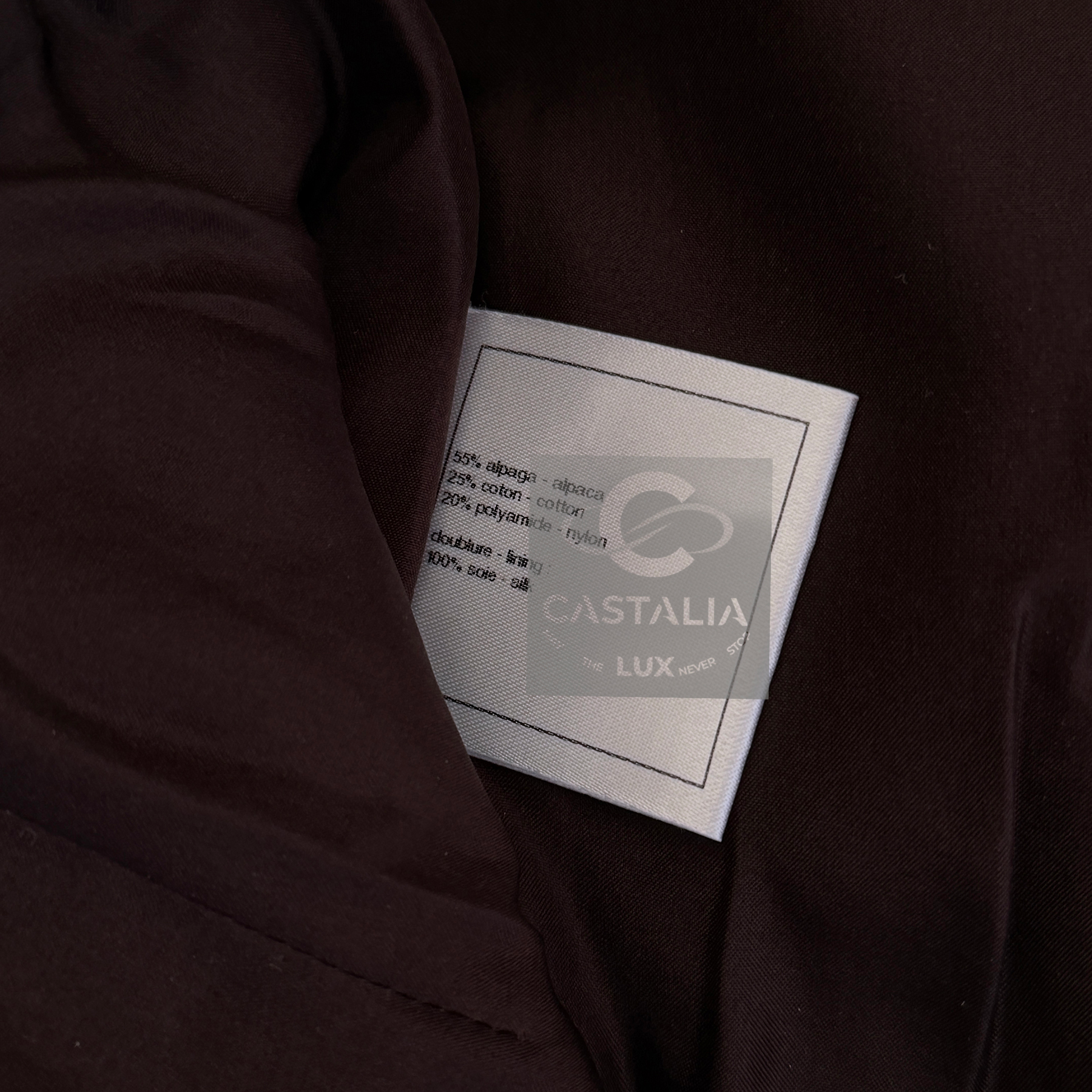 — Woven from precious alpaca tweed in shades of black and deep purple, its surface carries the softest, most ethereal texture — a fabric at once cloudlike and enduring