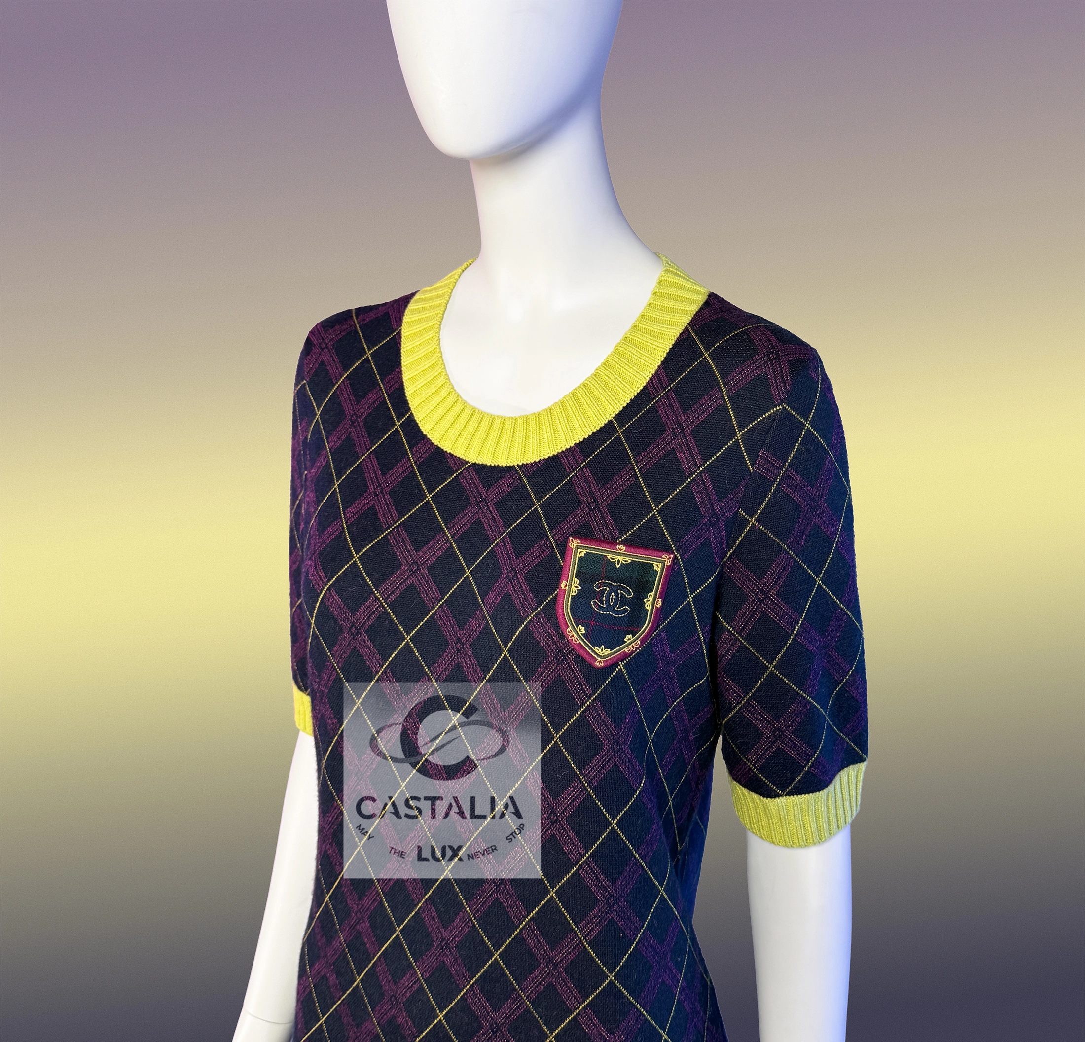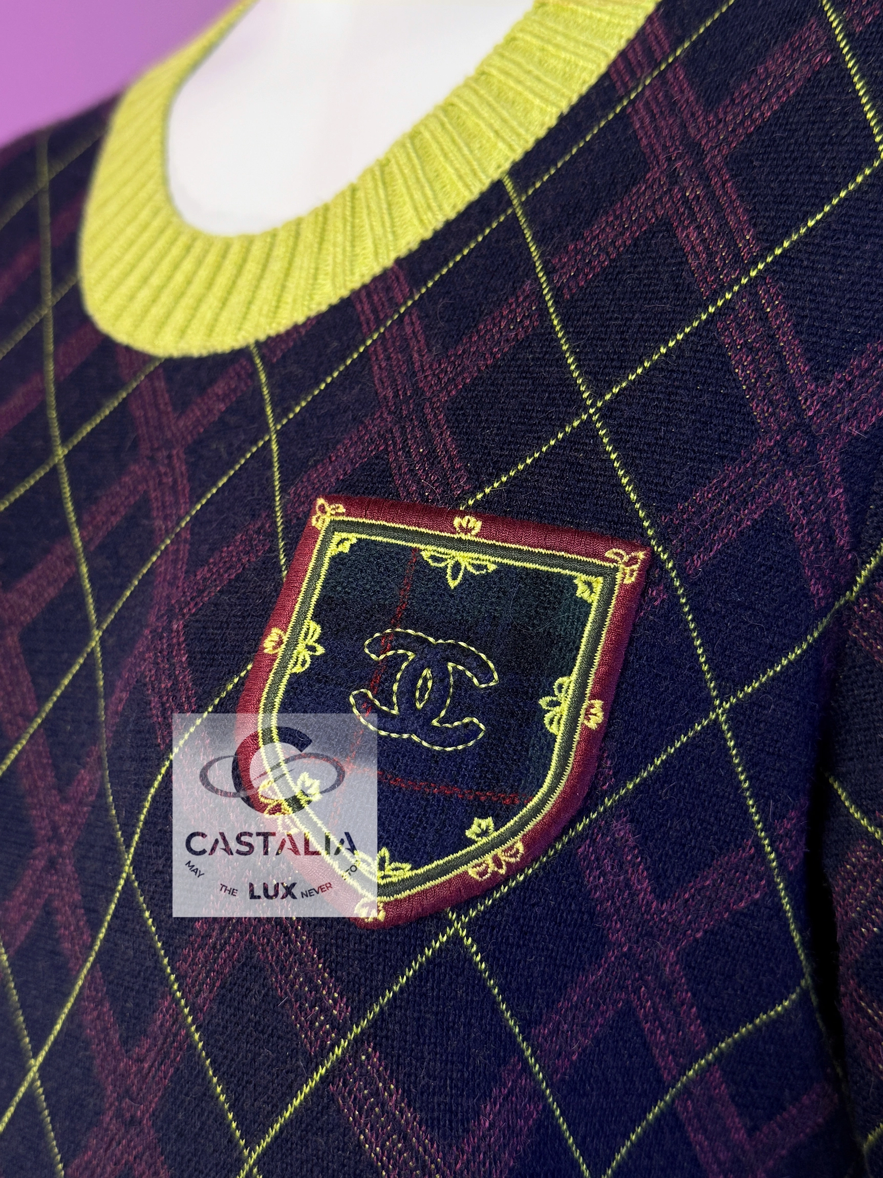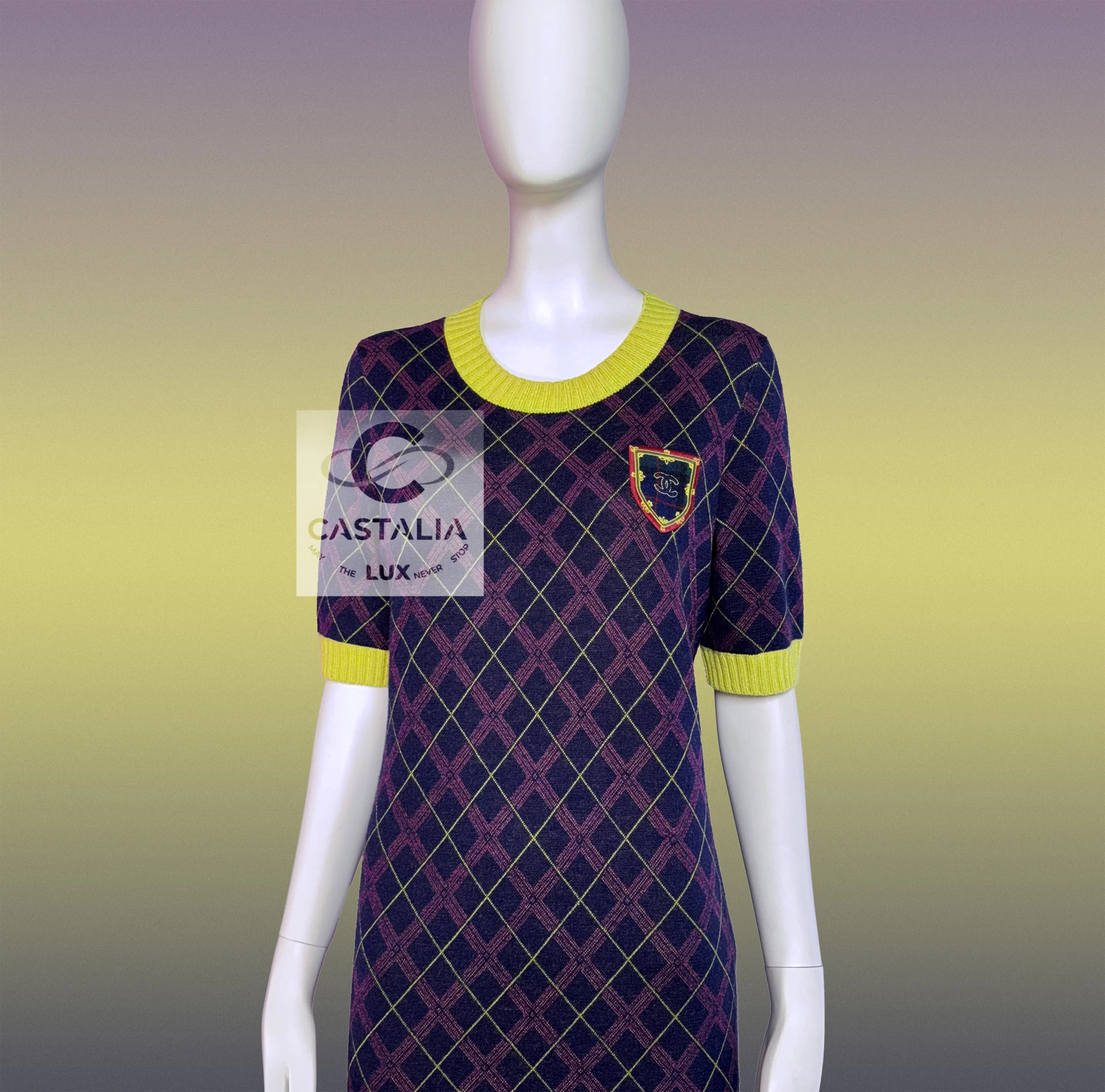 Chanel Tartan Cashmere Dress with CC Logo Patch — Paris / EDINBURGH 2013 Metiers d’Art Collection by Karl Lagerfeld ~ More than a garment, it is a woven narrative — the discipline of Chanel’s ateliers meeting the romance of ancient clans, each fibre breathing history, light, and permanence ~ A masterpiece to be worn as both attire and talisman. // Size mark 40 FR / Condition: never worn // — Crafted in an exquisite blend of cashmere and silk, it bears the iconic tartan pattern — deep colours interlaced with yellow, ivory, , each thread a brushstroke in a living tapestry — At the chest, a CC logo patch crowns the composition, framed with an inset with miniature tartan, as if holding the Highlands within its borders — The ribbed yellow collar and cuffs lend a fresh counterpoint, recalling Scottish fields meeting a storm-lit sky