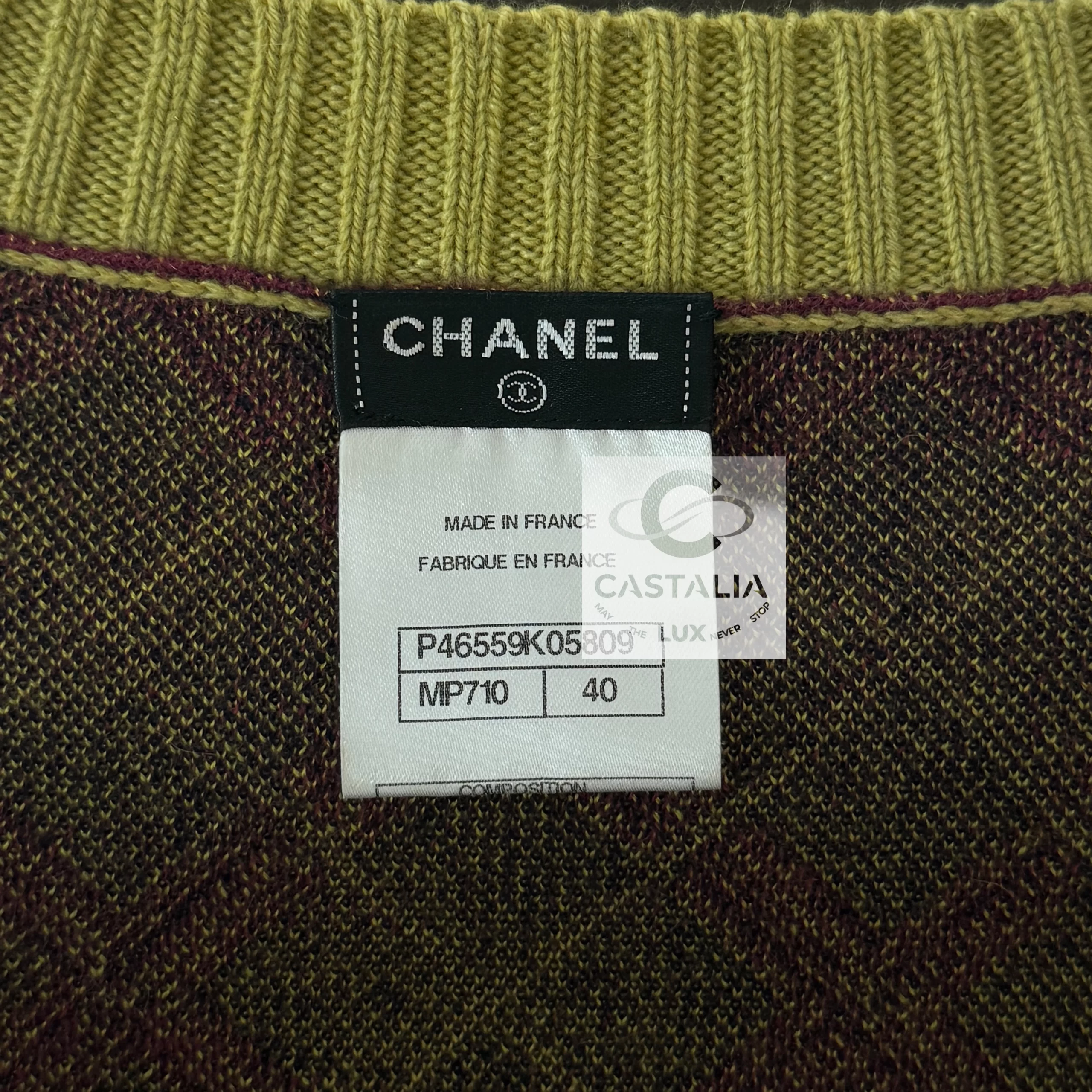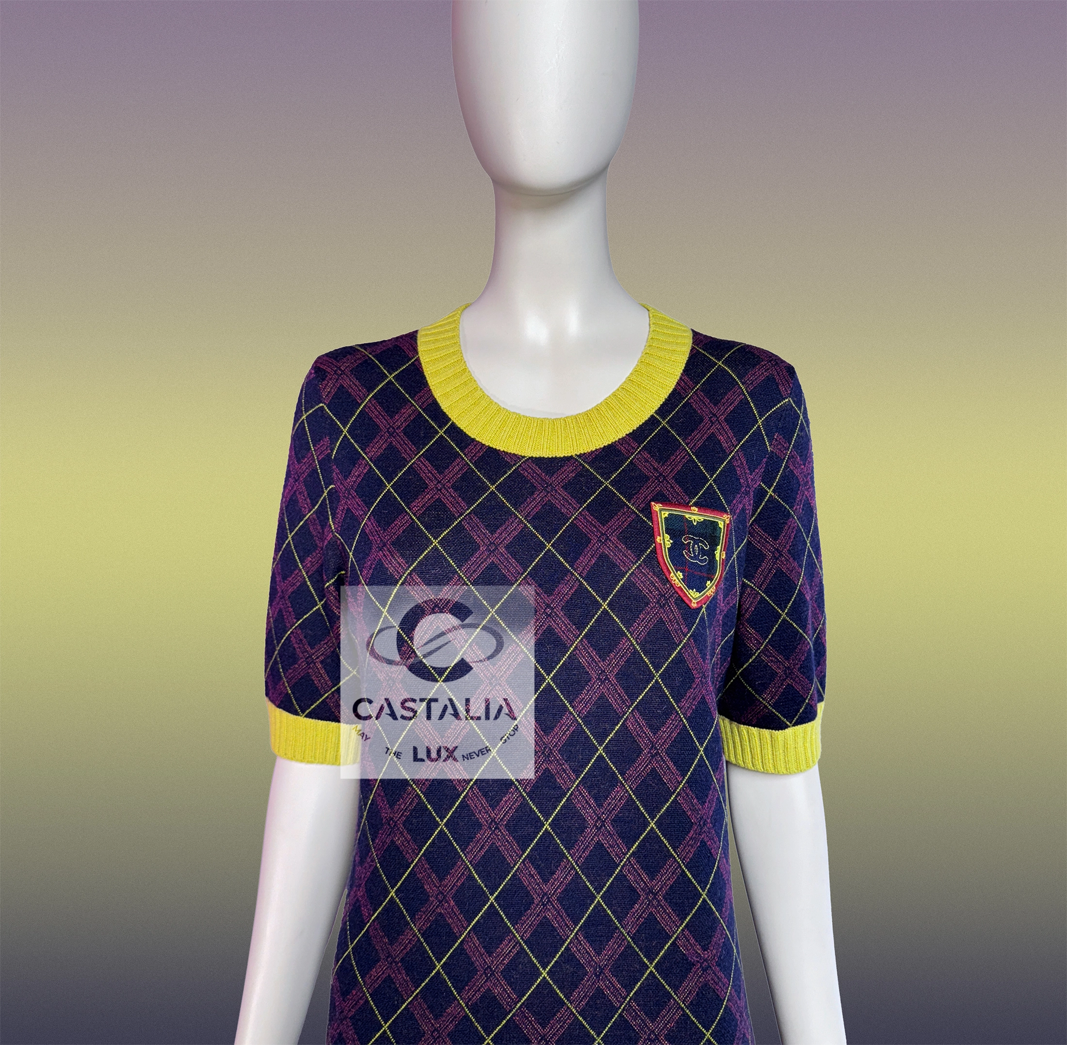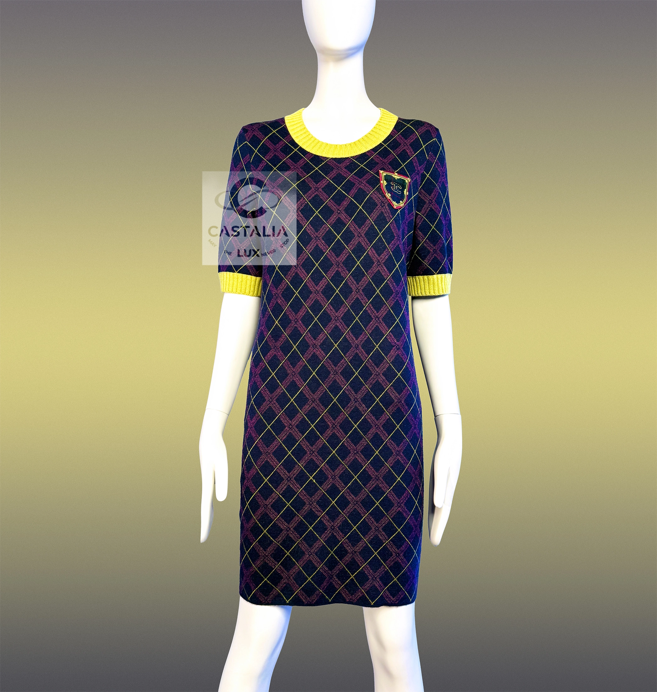 Chanel Tartan Cashmere Dress with CC Logo Patch — Paris / EDINBURGH 2013 Metiers d’Art Collection by Karl Lagerfeld ~ More than a garment, it is a woven narrative — the discipline of Chanel’s ateliers meeting the romance of ancient clans, each fibre breathing history, light, and permanence ~ A masterpiece to be worn as both attire and talisman. // Size mark 40 FR / Condition: never worn // — Crafted in an exquisite blend of cashmere and silk, it bears the iconic tartan pattern — deep colours interlaced with yellow, ivory, , each thread a brushstroke in a living tapestry — At the chest, a CC logo patch crowns the composition, framed with an inset with miniature tartan, as if holding the Highlands within its borders — The ribbed yellow collar and cuffs lend a fresh counterpoint, recalling Scottish fields meeting a storm-lit sky
