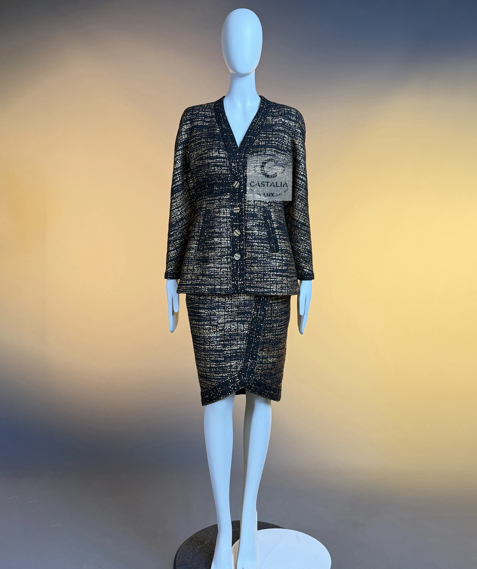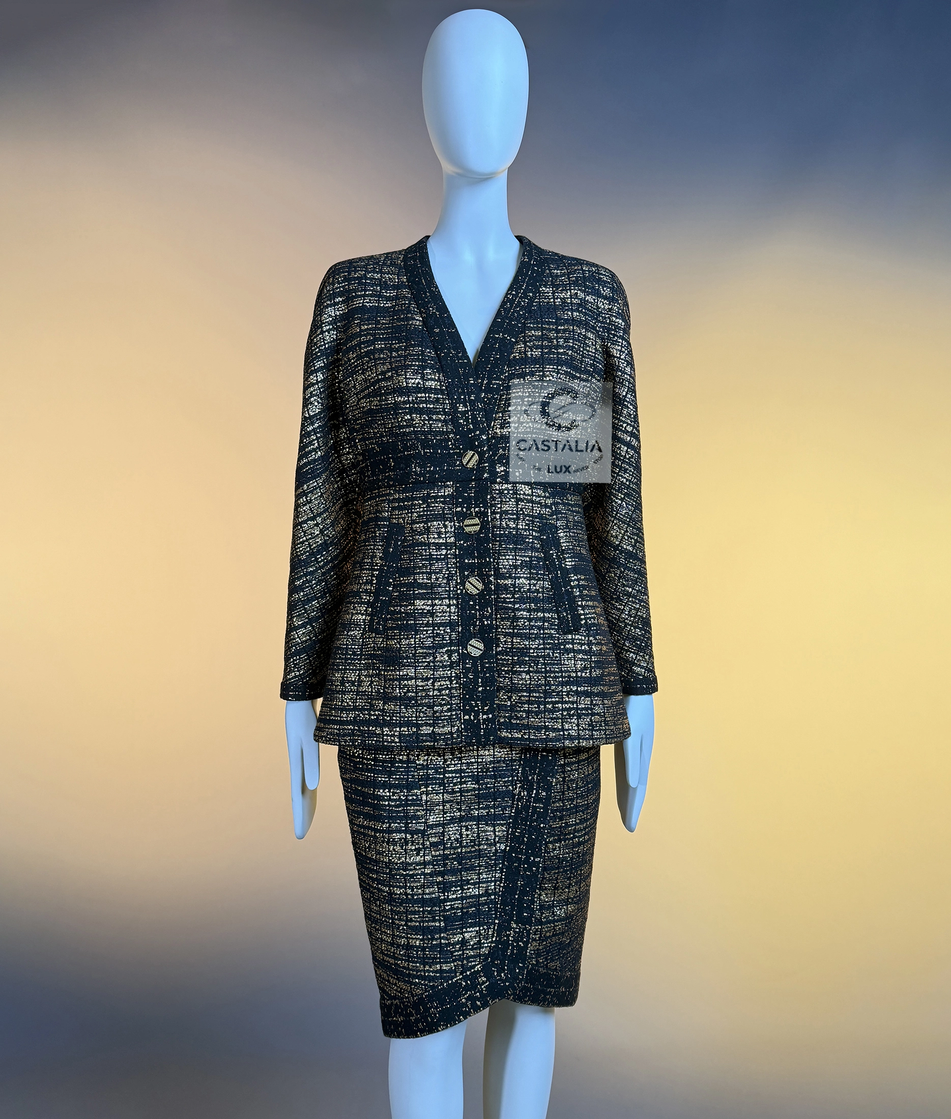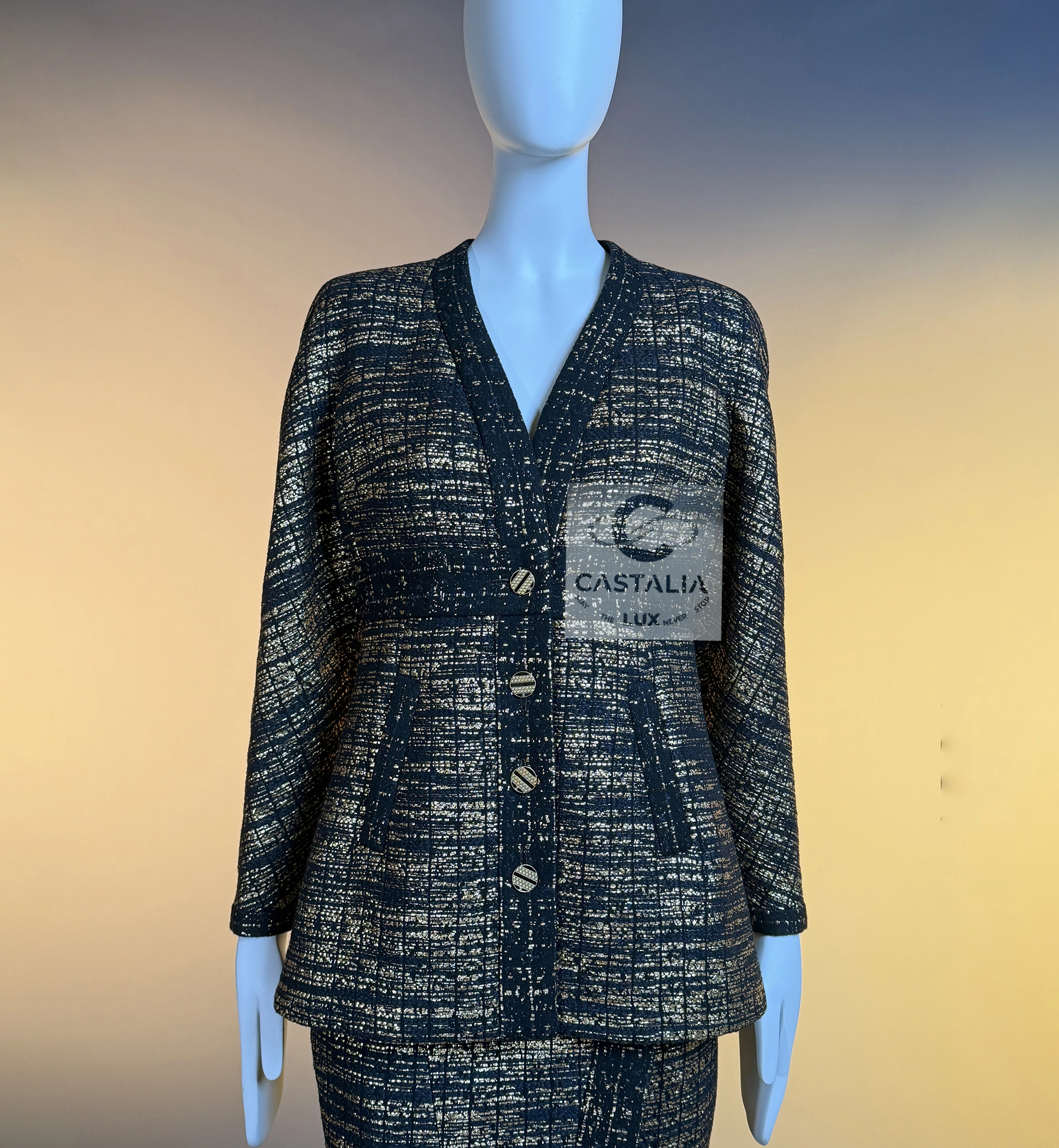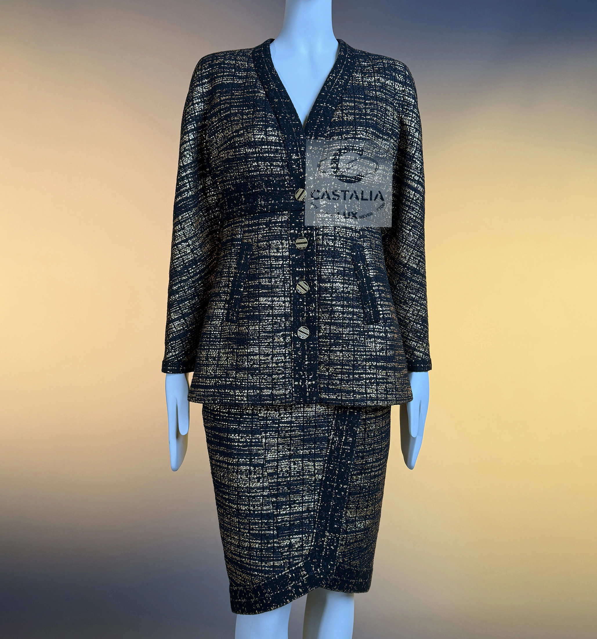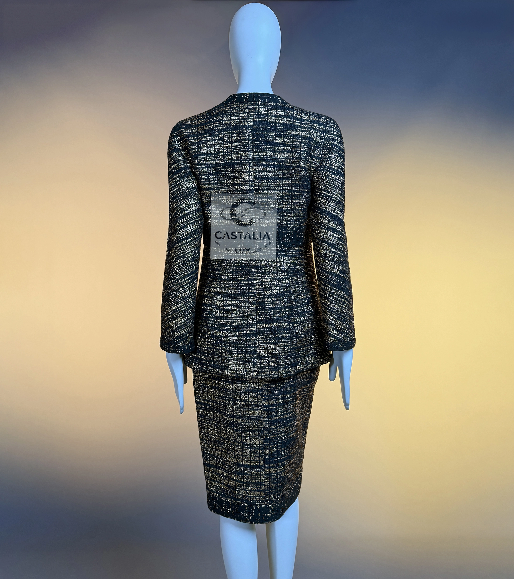 — this Chanel black and gold tweed jacket and skirt ensemble stands as a sartorial tribute to the splendor of