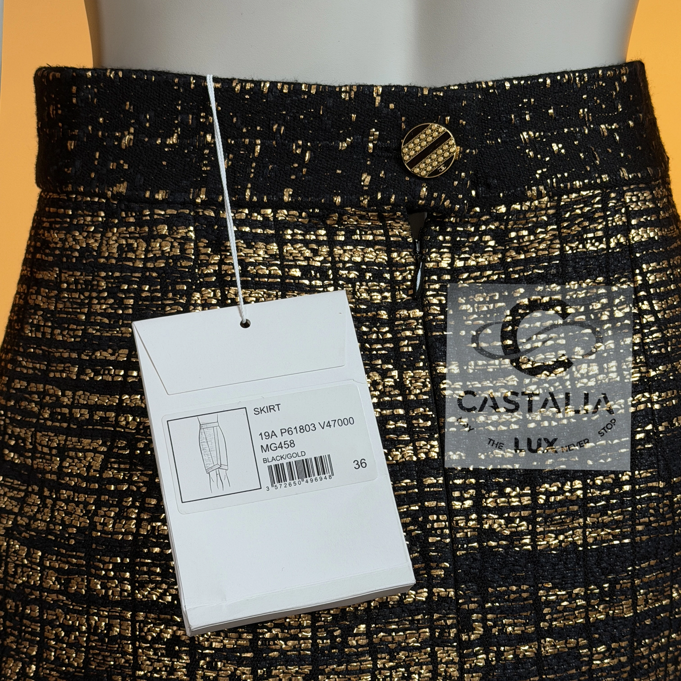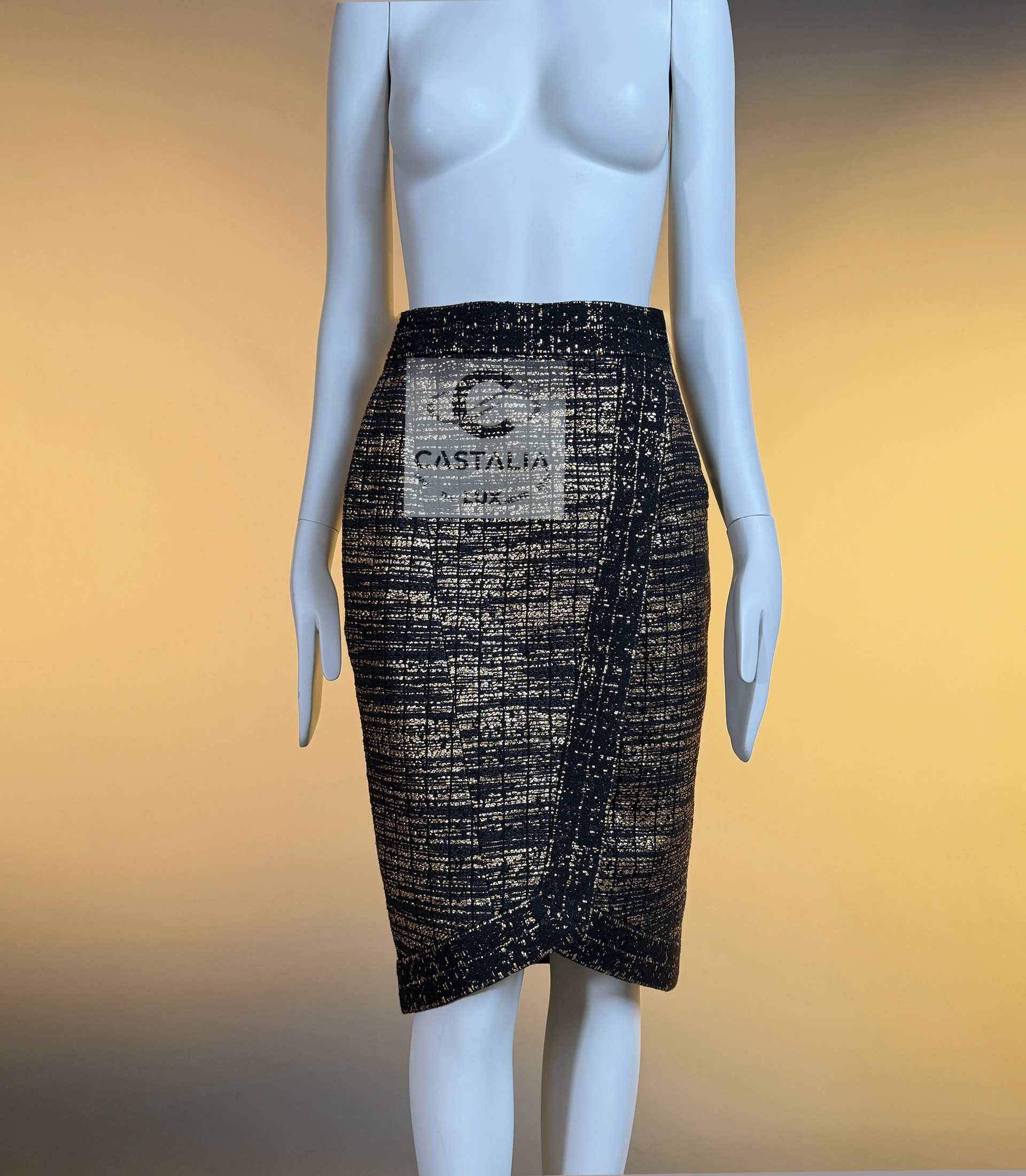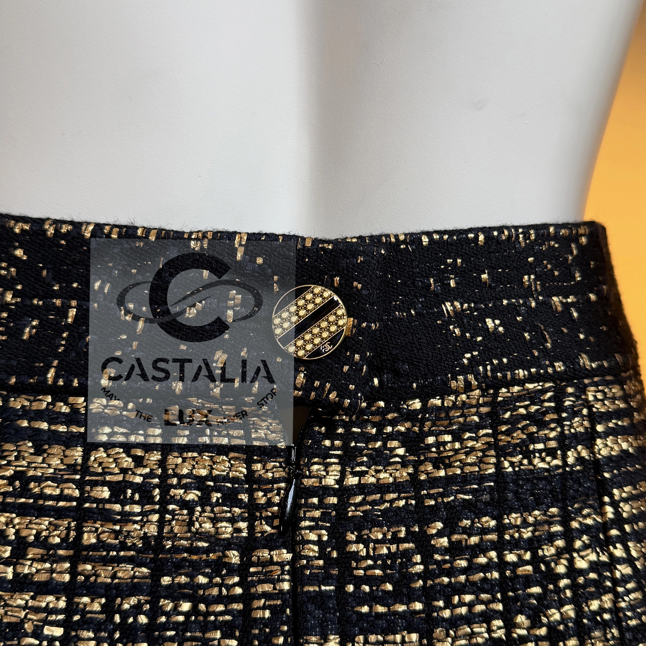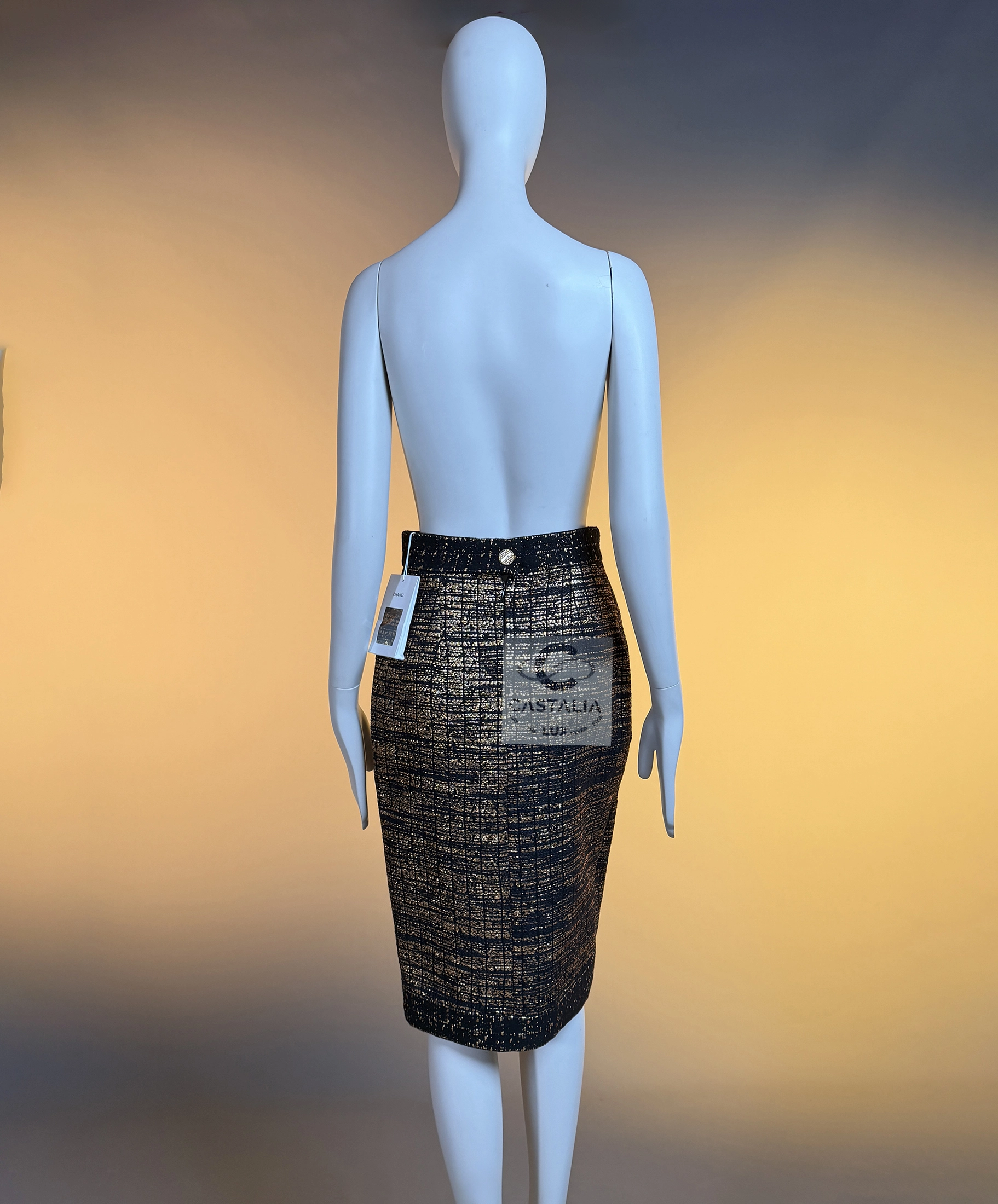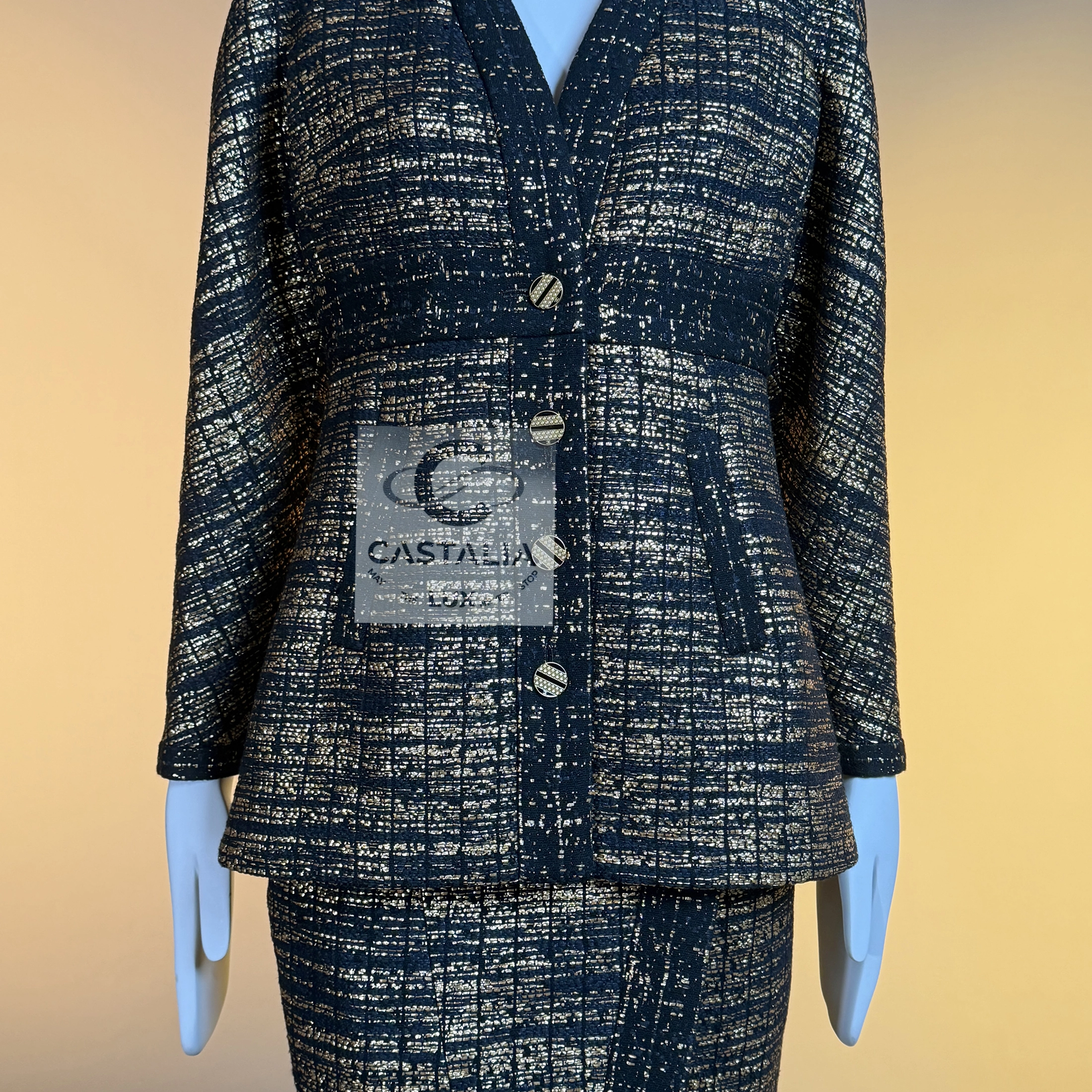 — this Chanel black and gold tweed jacket and skirt ensemble stands as a sartorial tribute to the splendor of