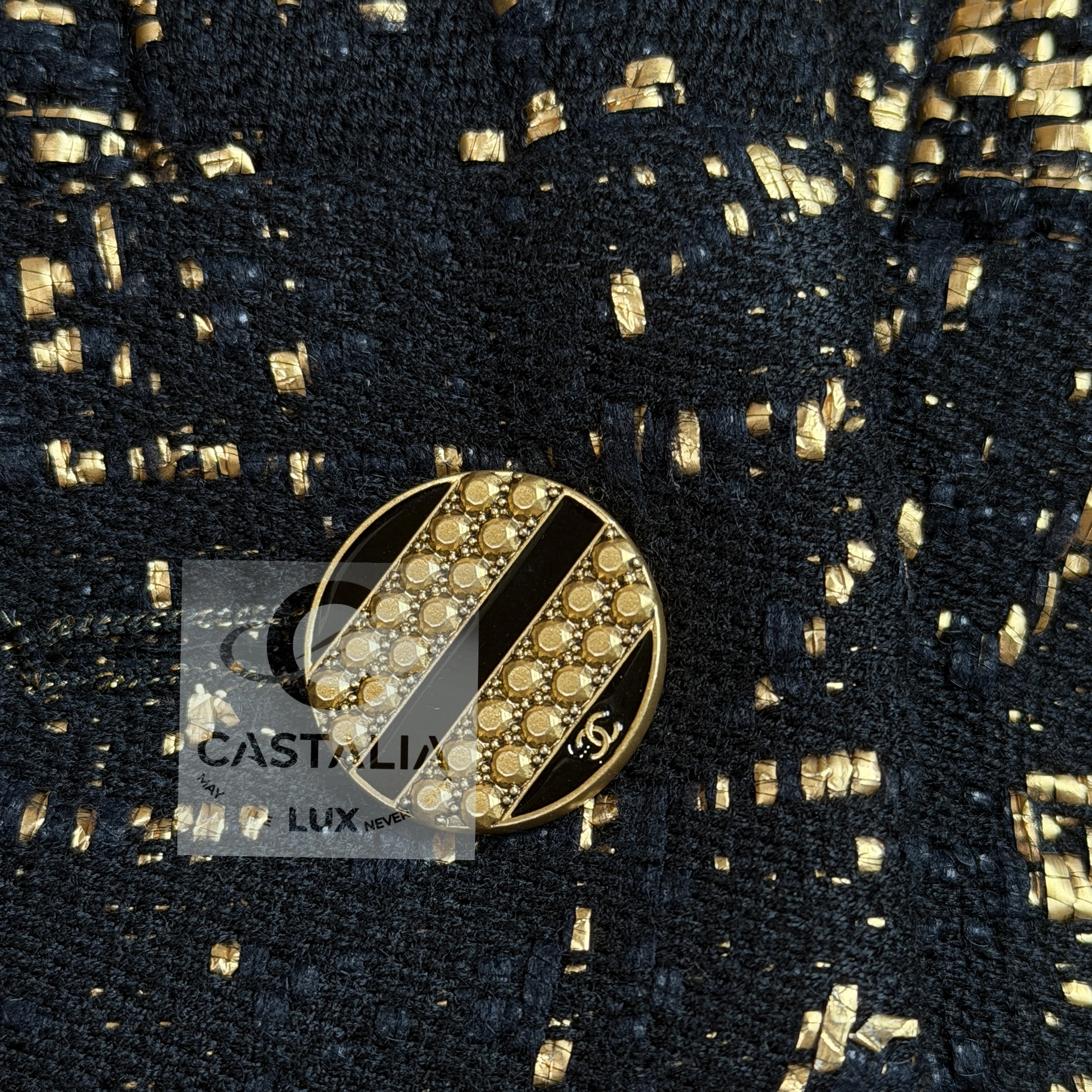 — Crafted from precious Lesage ribbon tweed in deep black interwoven with radiant gold threads, the textile