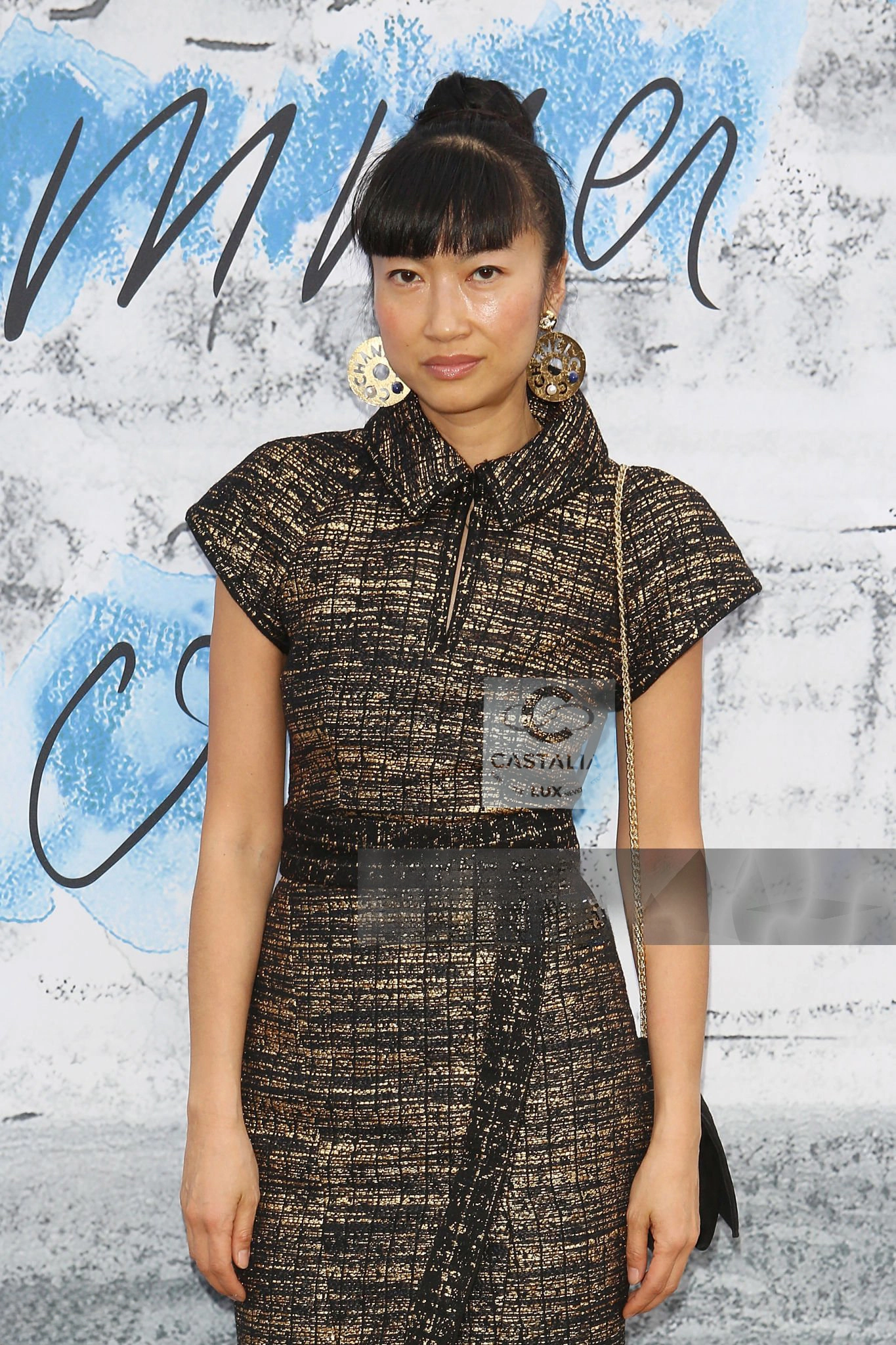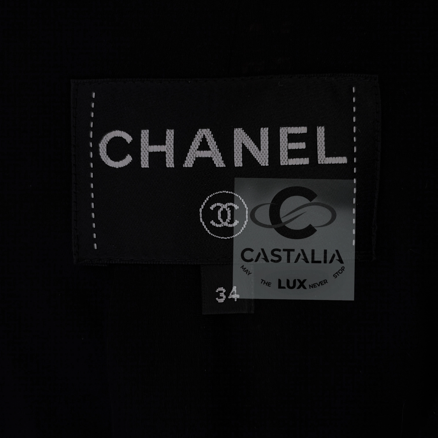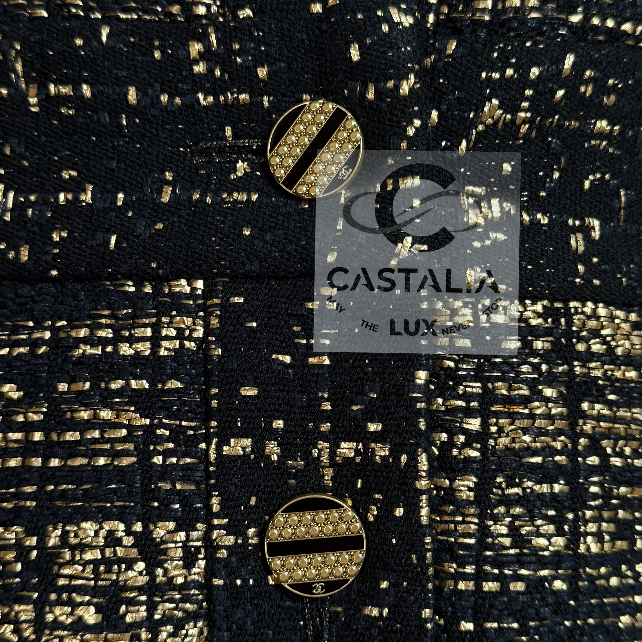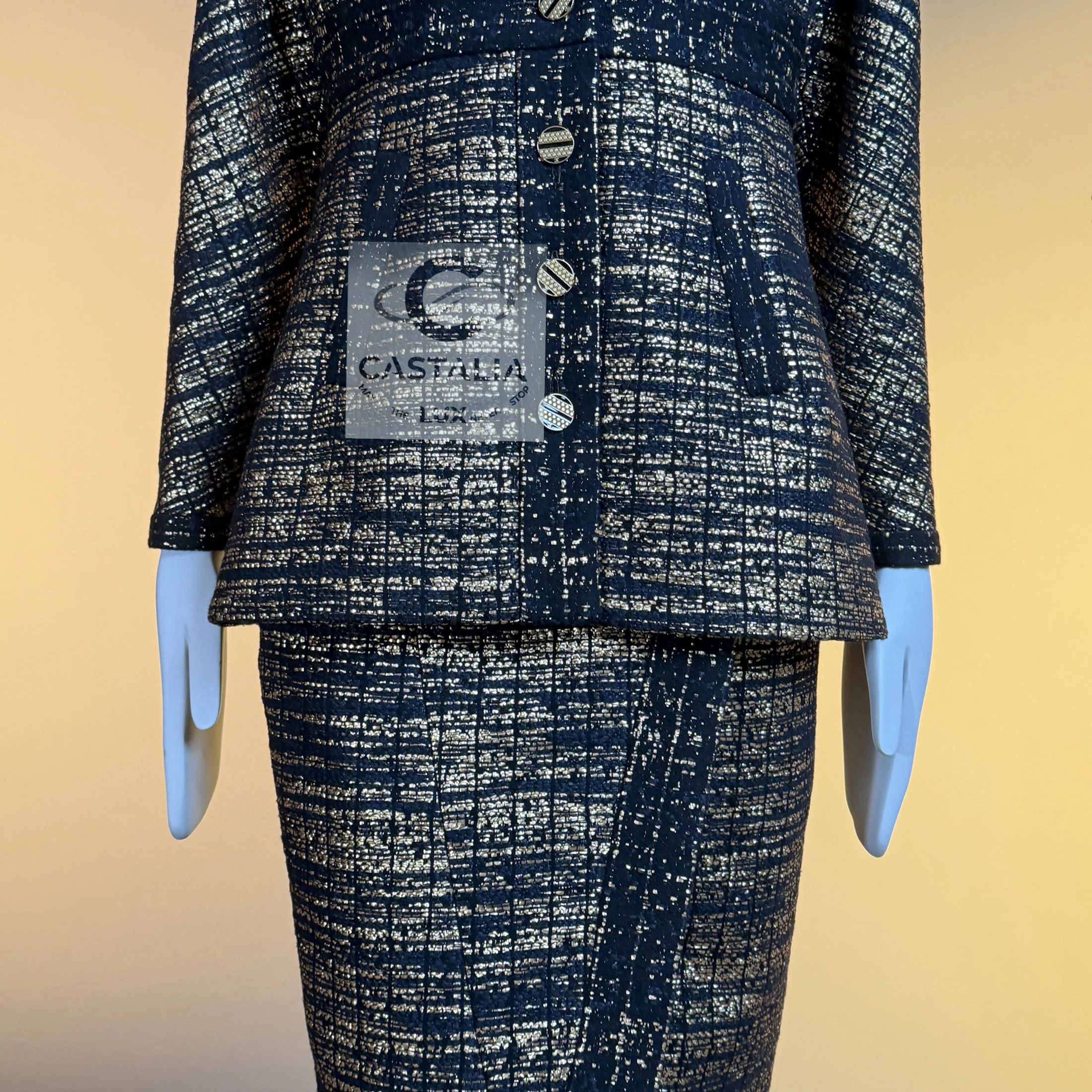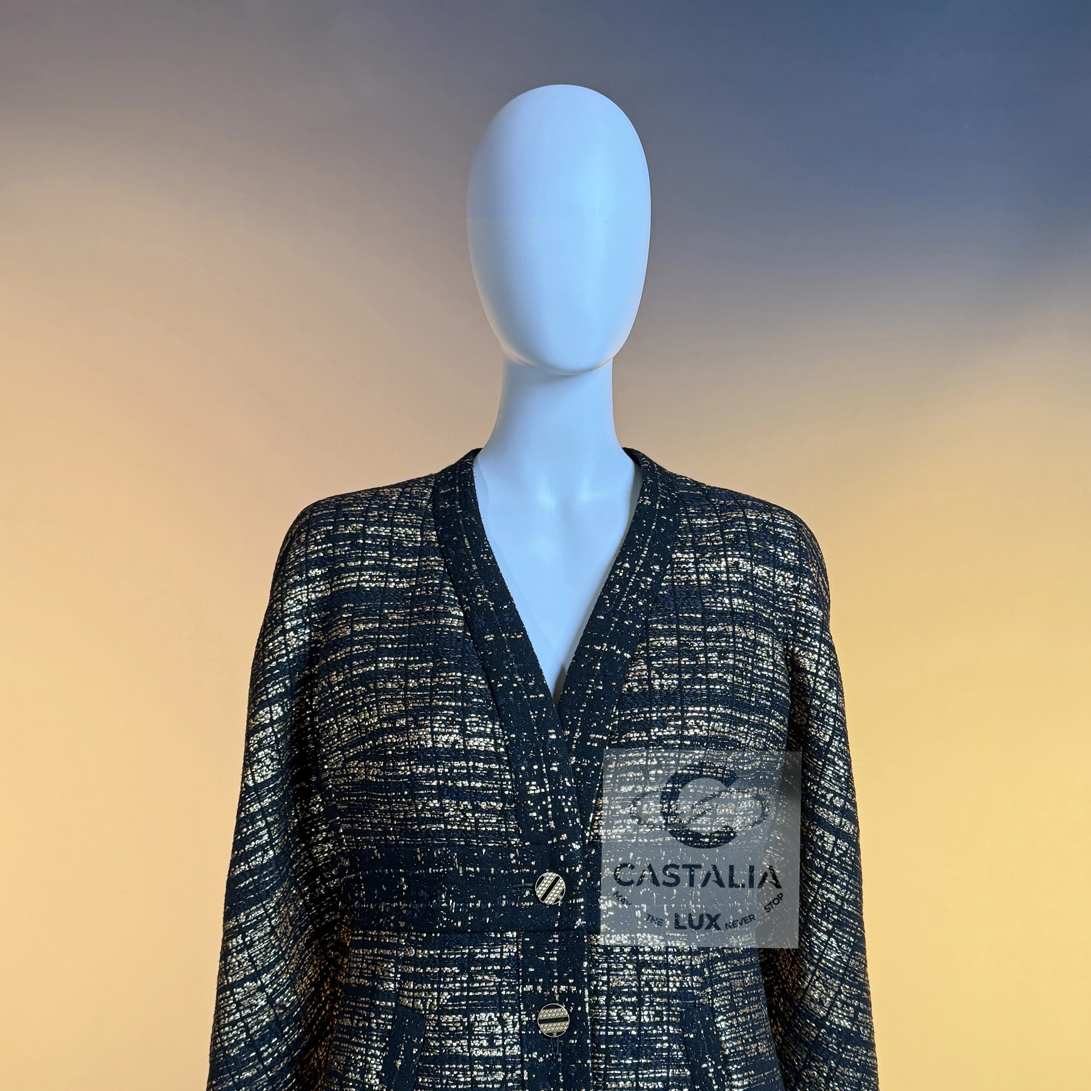— The jacket features CC logo jewel buttons along the front, mirrored by matching button at the back of the skirt, glinting like relics of a bygone dynasty rediscovered under modern light