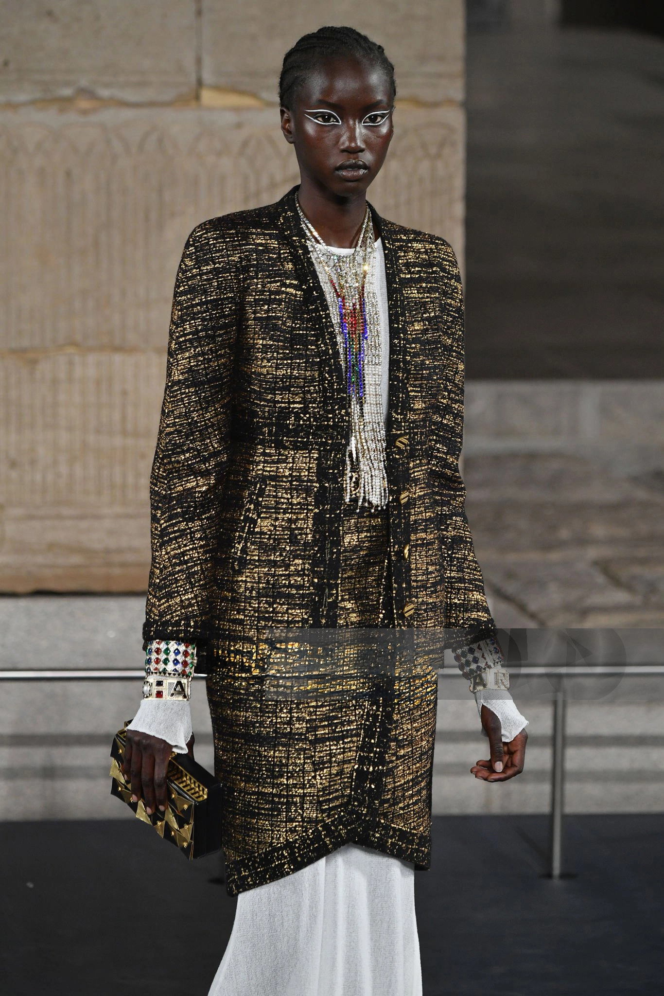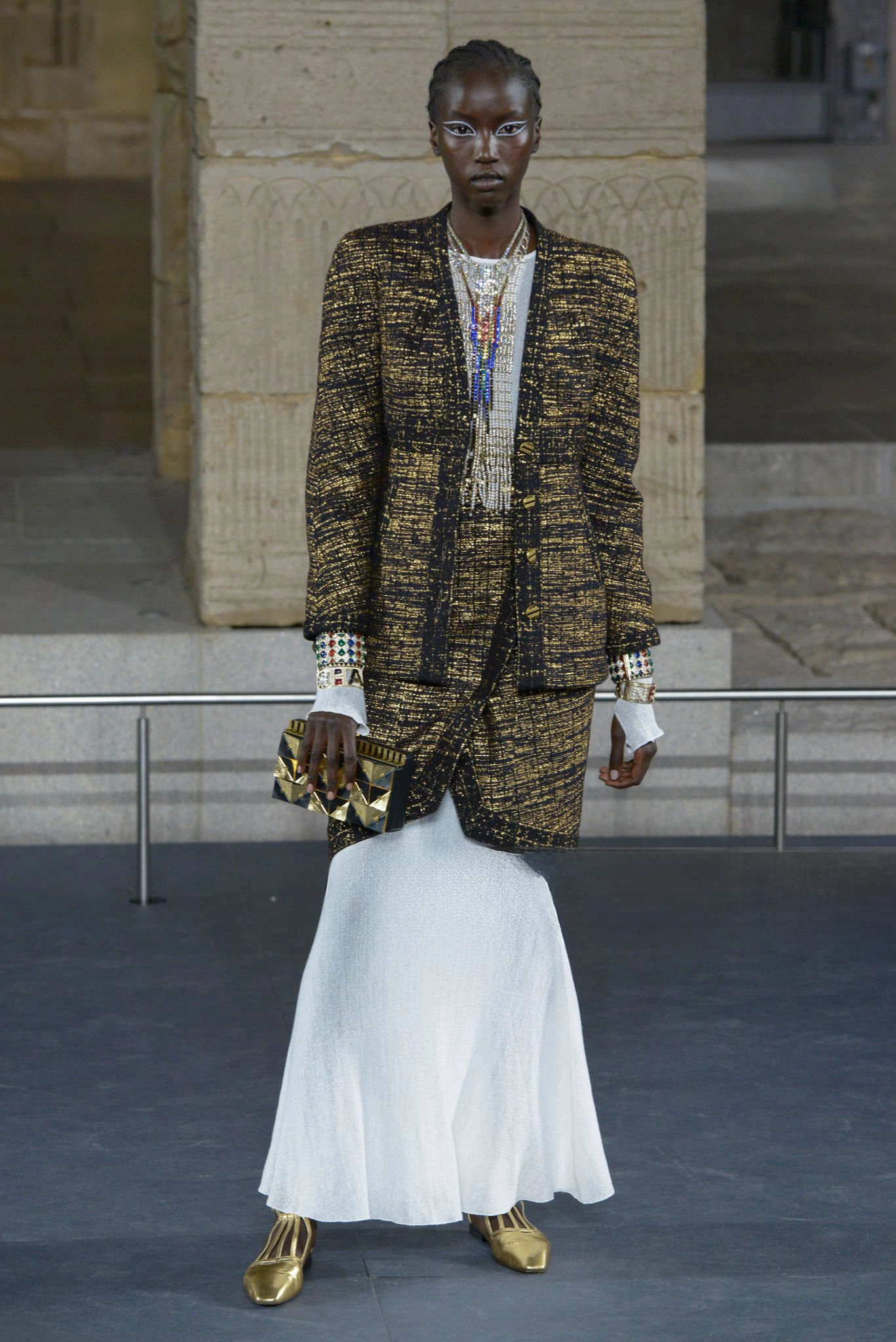 — this Chanel black and gold tweed jacket and skirt ensemble stands as a sartorial tribute to the splendor of ancient Egypt reimagined through the prism of Parisian couture