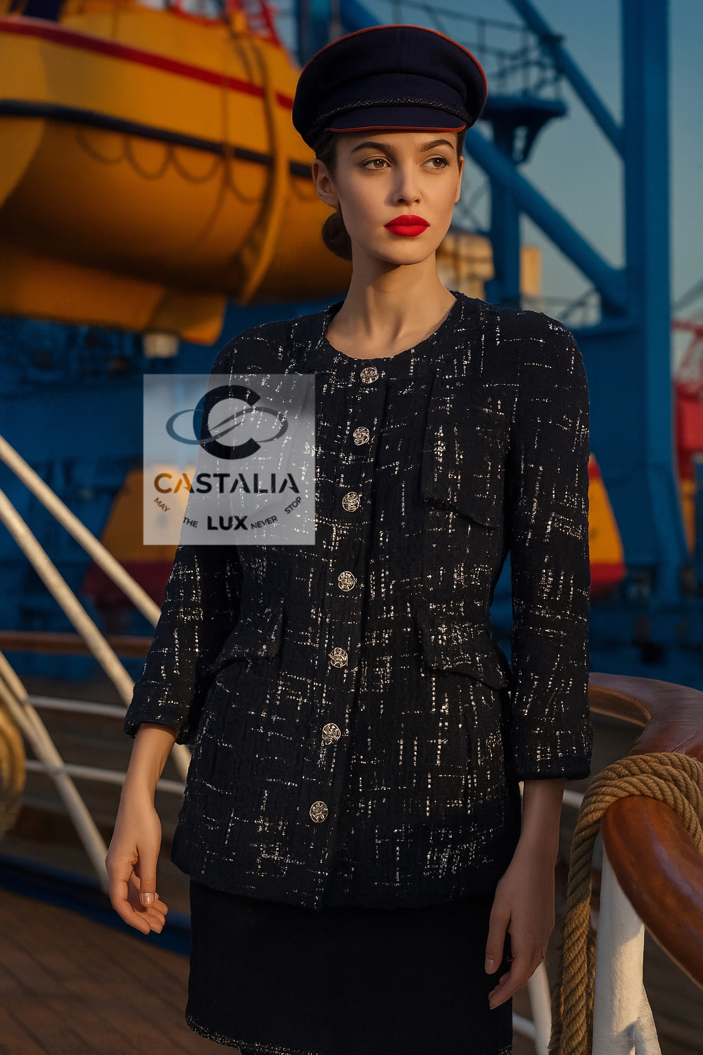 — Woven by Lesage in deep black tweed interlaced with contrasting threads, the fabric suggests both the rigging lines of ships at harbor and the constellations above the Elbe