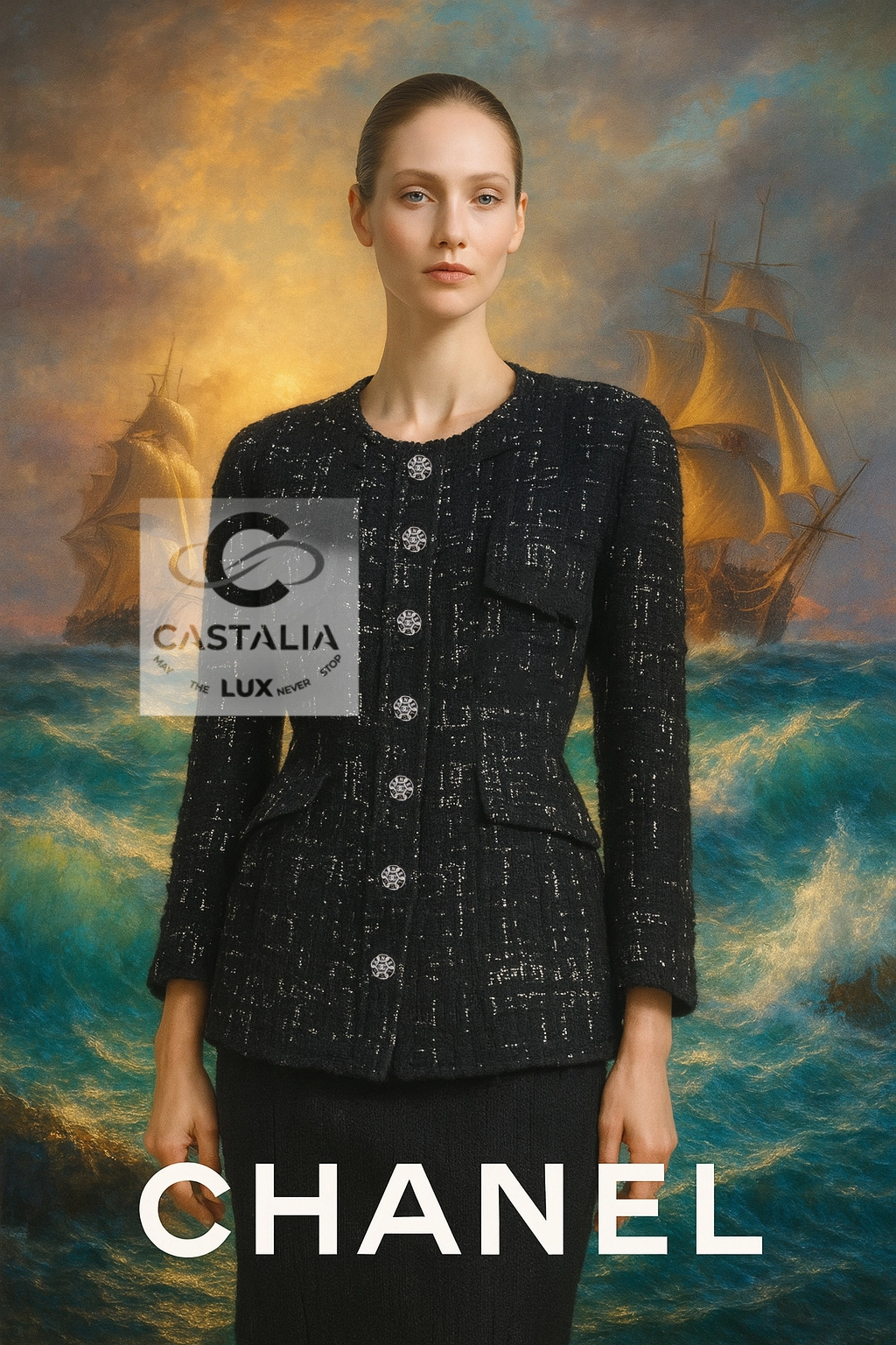 ~ An eternal silhouette, wrought in the master’s hand — this Chanel Timeless Black Tweed Jacket embodies the maritime gravity and port-city mystery of Hamburg, home town of by Karl Lagerfeld reimagined in 2018