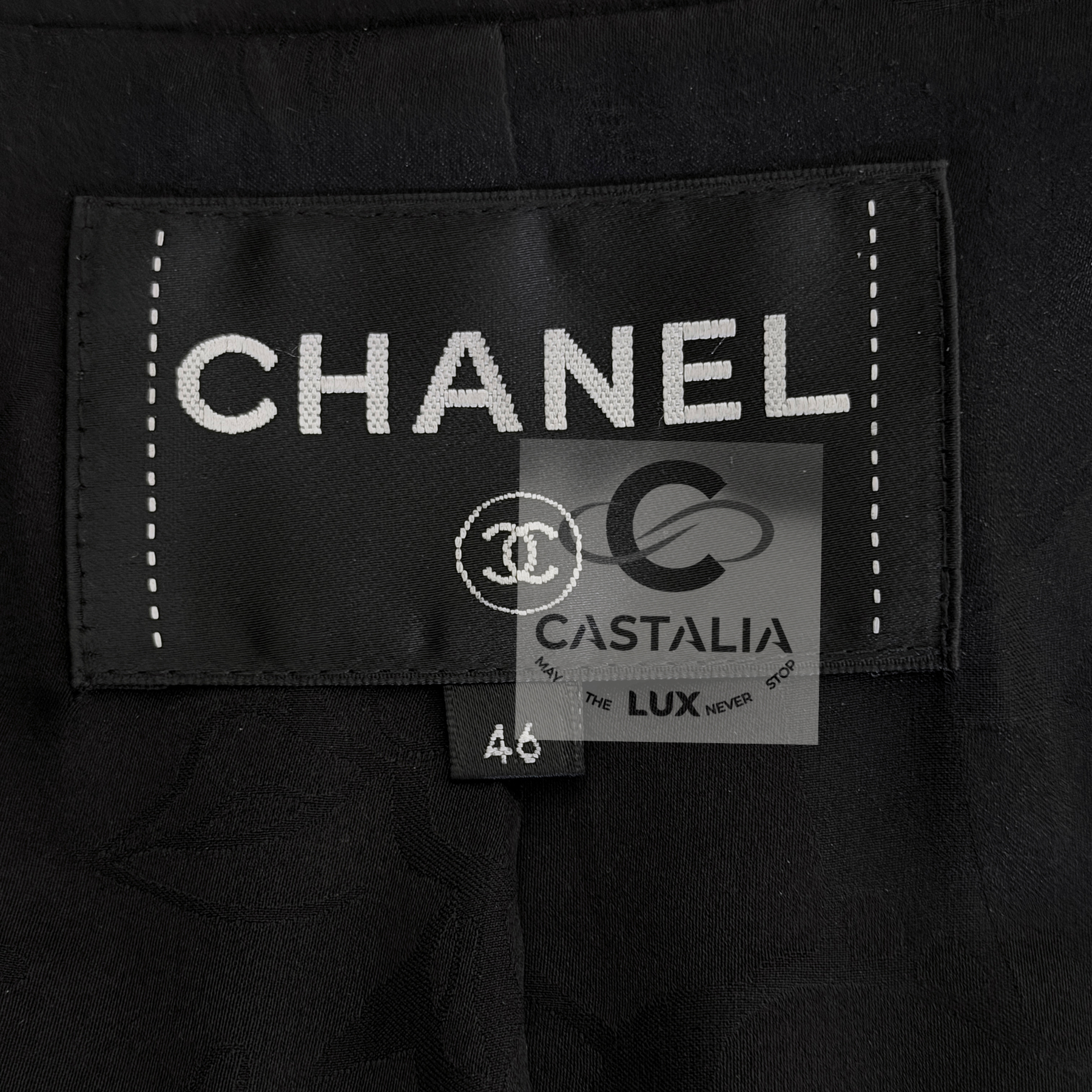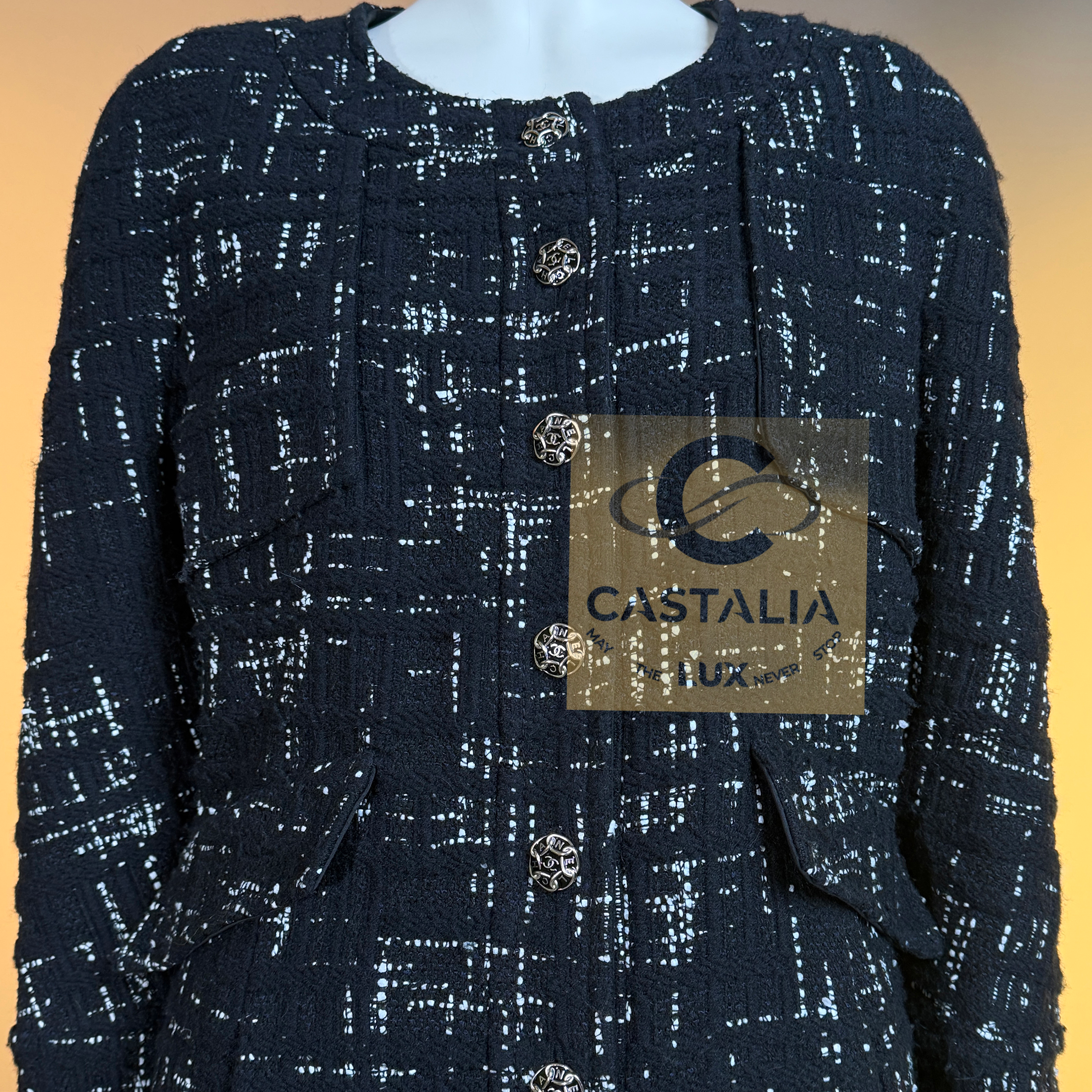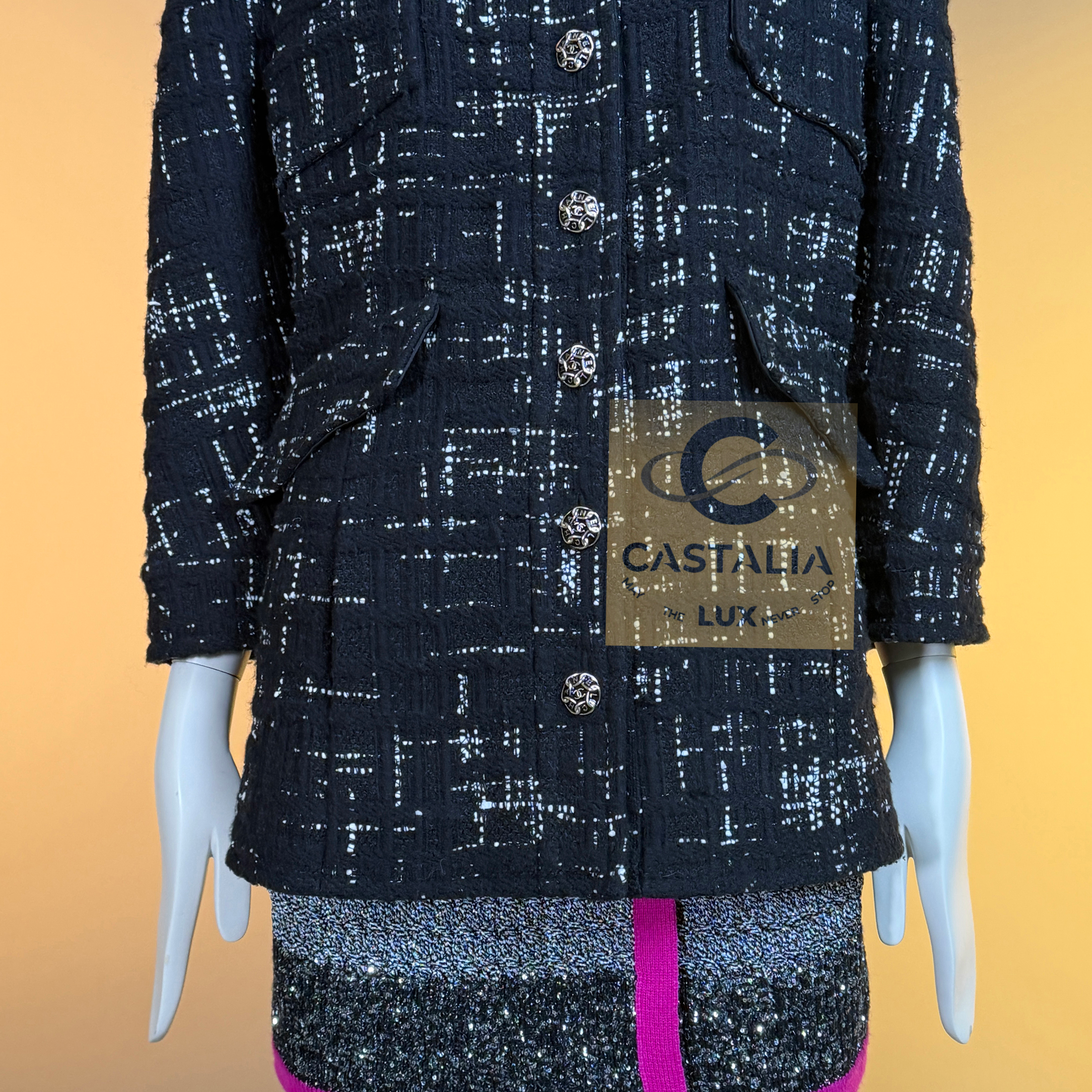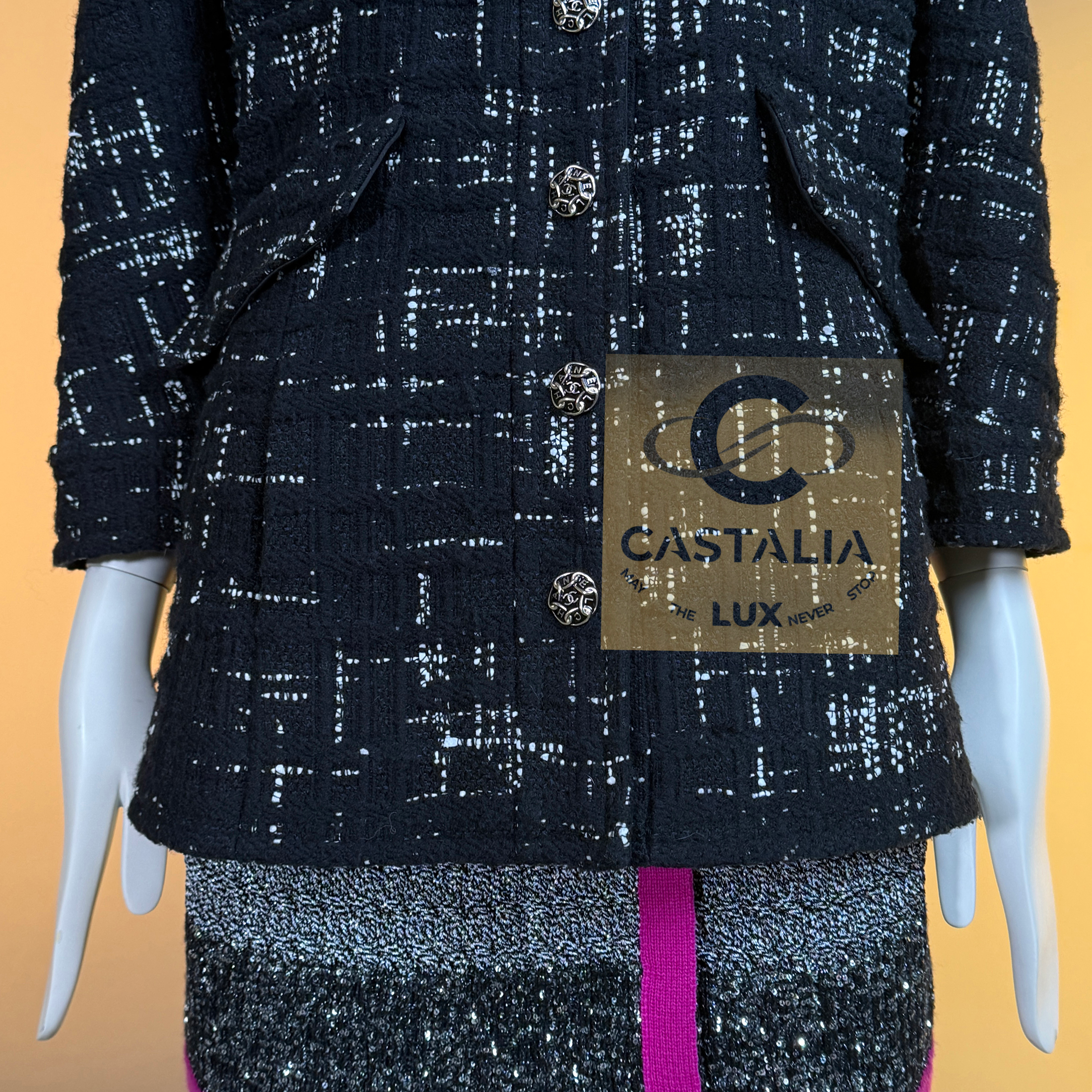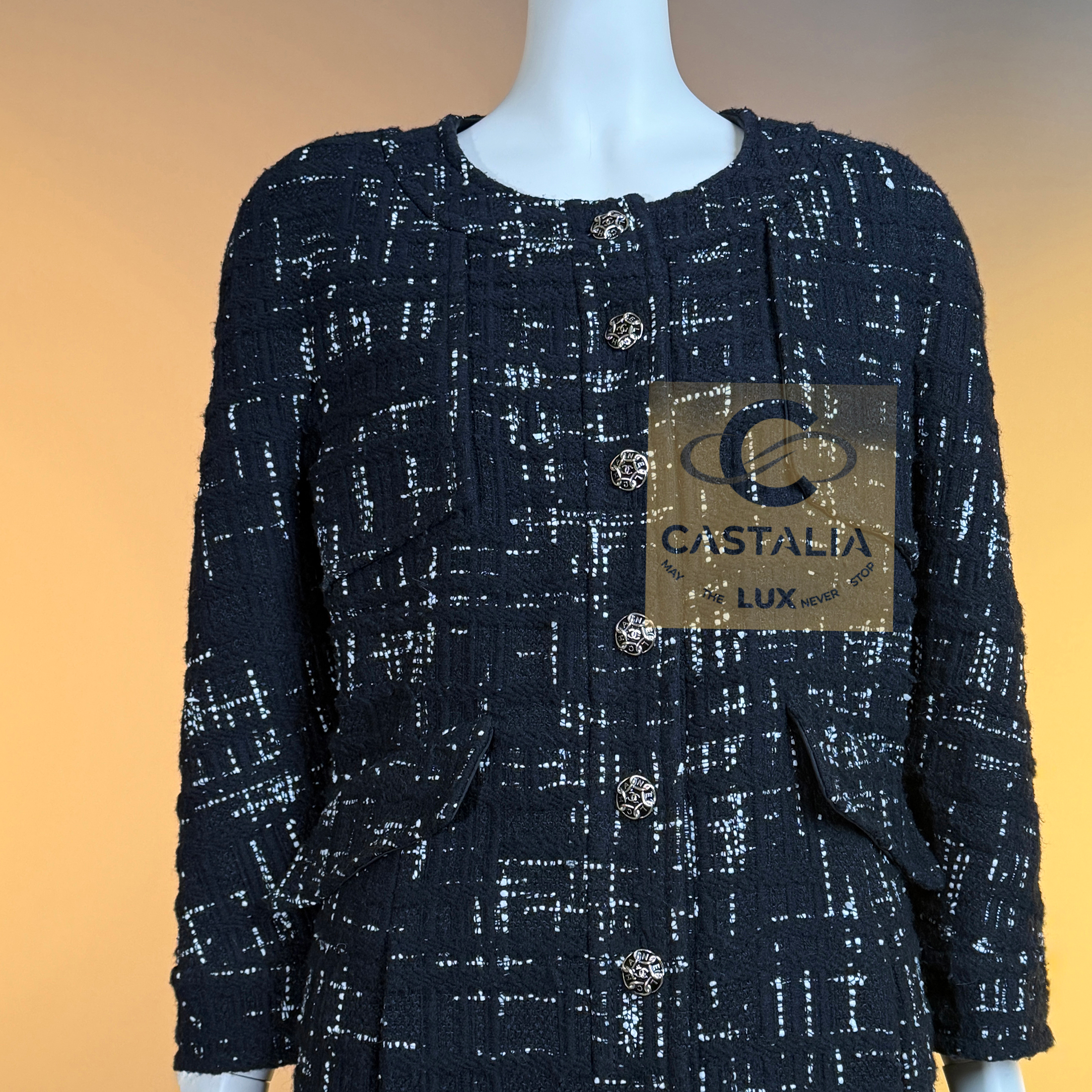 CHANEL Timeless Black Tweed Jacket Paris / HAMBURG Collection, 2018 Métiers d’Art by Karl Lagerfeld ~ An eternal silhouette, wrought in the master’s hand — this Chanel Timeless Black Tweed Jacket embodies the maritime gravity and port-city mystery of Hamburg, home town of by Karl Lagerfeld reimagined in 2018 // Size mark 46 FR / Condition: never worn // — Woven by Lesage in deep black tweed interlaced with contrasting threads, the fabric suggests both the rigging lines of ships at harbor and the constellations above the Elbe — Its four-patched pocket construction echoes the house’s enduring codes, balancing function with grace —At its axis, a series of masterpiece chain-link buttons engraved with the CHANEL lettering gleam like rivets of couture armor — jewels that fasten history to the present moment — Inside, a pure black silk lining lends fluidity and discretion, as if the garment conceals a secret chamber of elegance