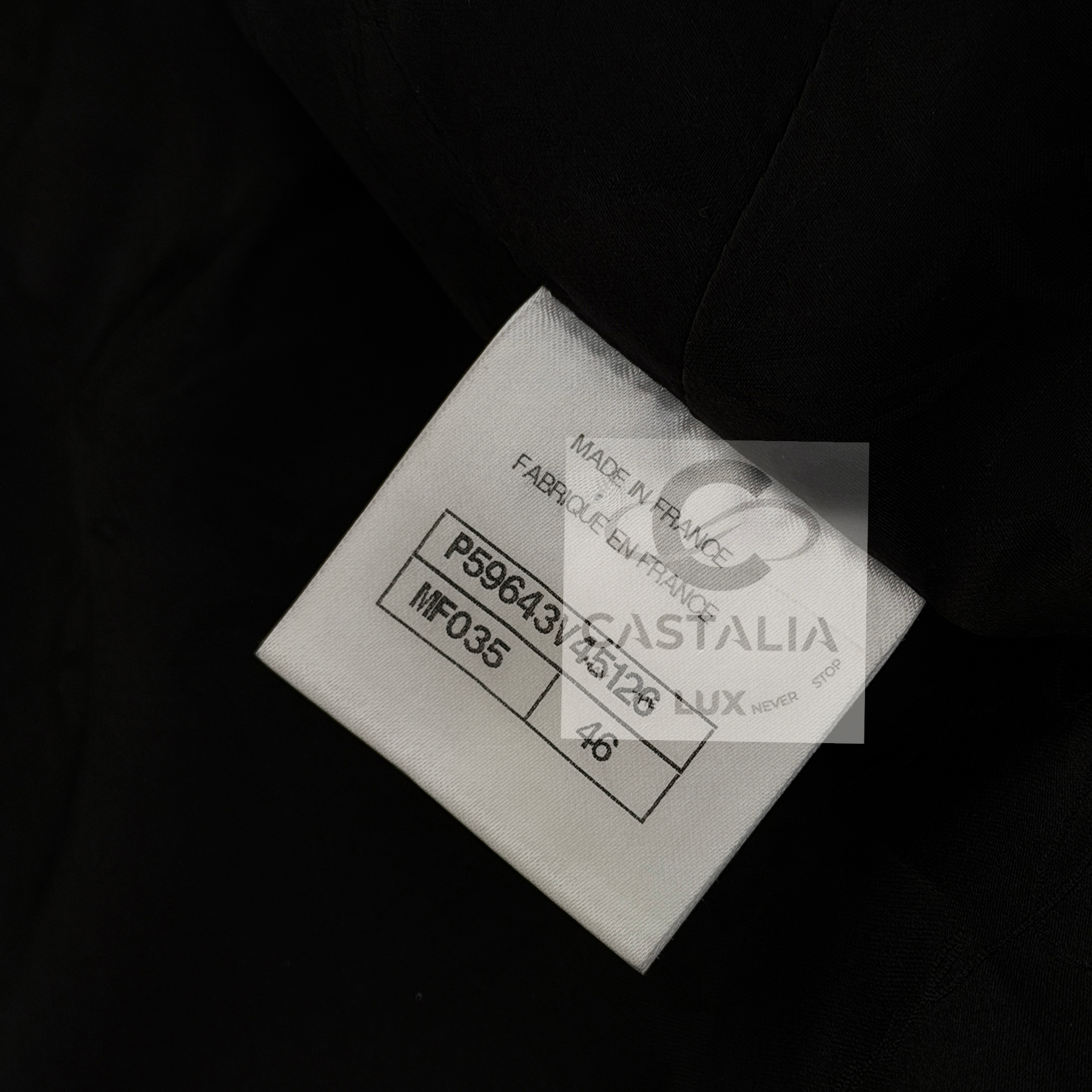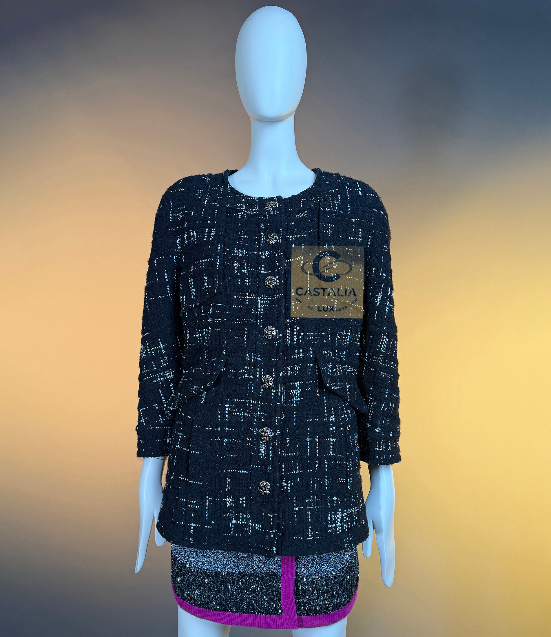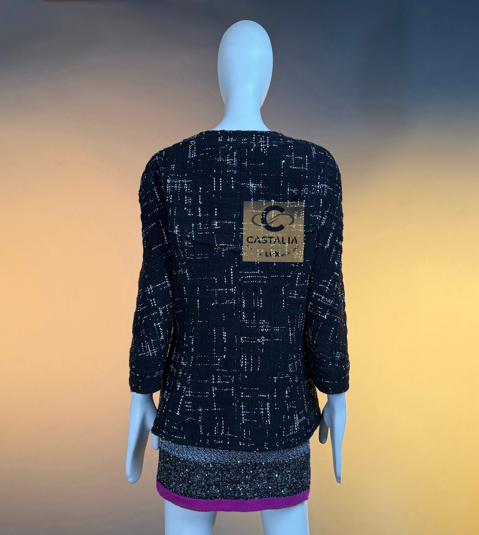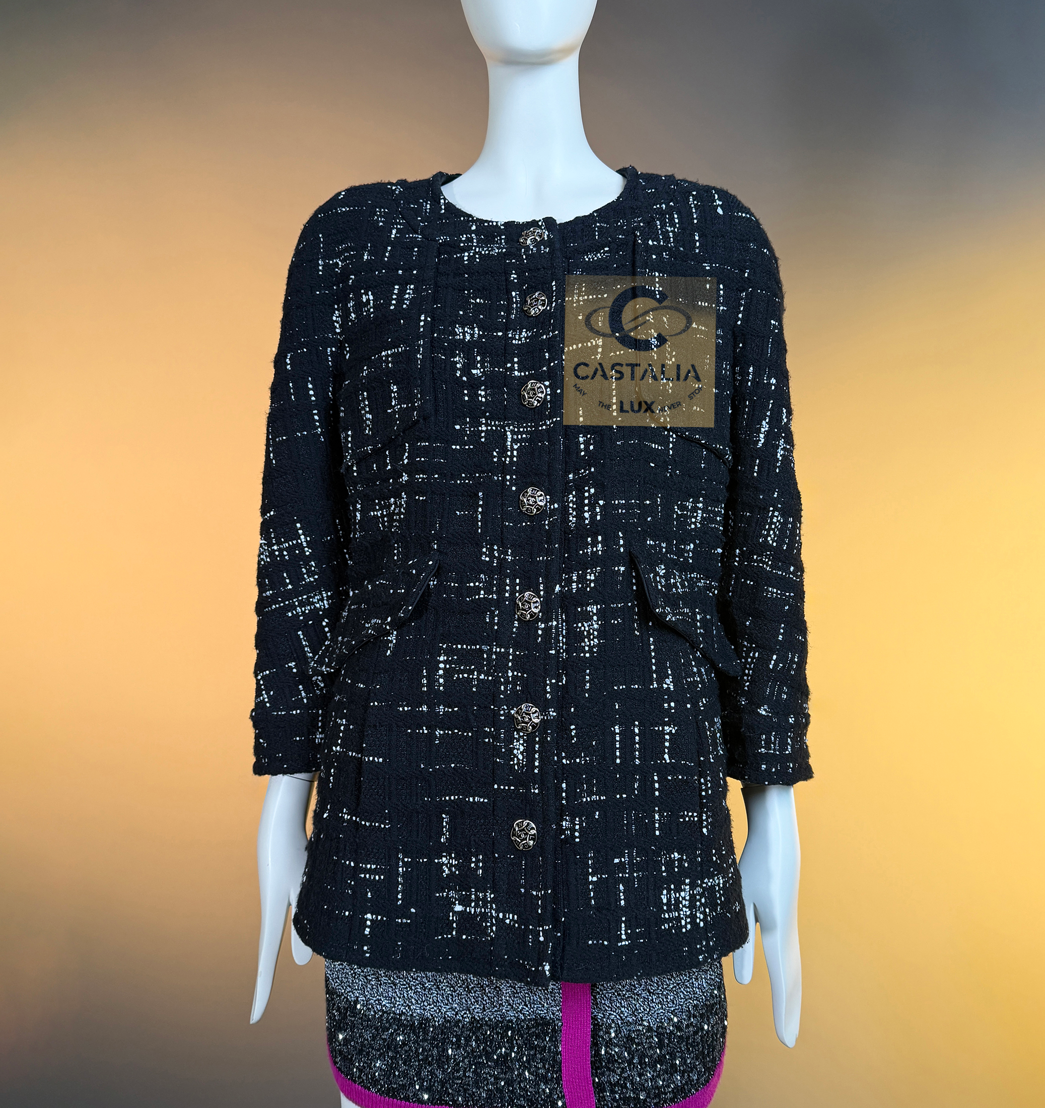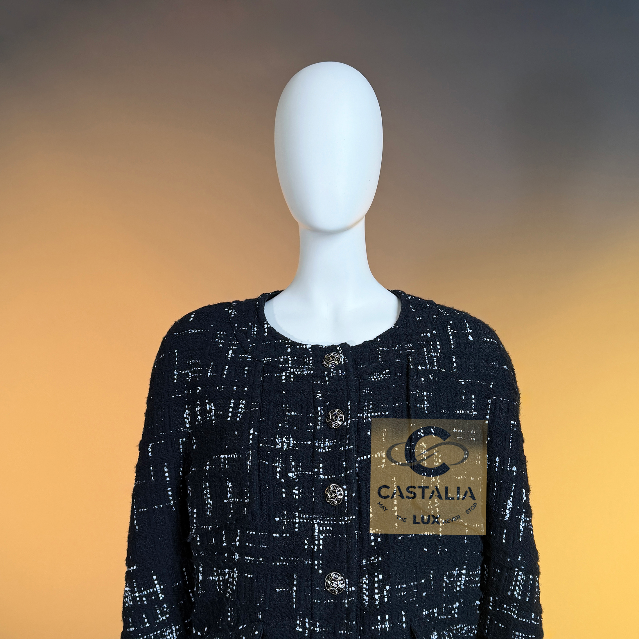 CHANEL Timeless Black Tweed Jacket Paris / HAMBURG Collection, 2018 Métiers d’Art by Karl Lagerfeld ~ An eternal silhouette, wrought in the master’s hand — this Chanel Timeless Black Tweed Jacket embodies the maritime gravity and port-city mystery of Hamburg, home town of by Karl Lagerfeld reimagined in 2018 // Size mark 46 FR / Condition: never worn // — Woven by Lesage in deep black tweed interlaced with contrasting threads, the fabric suggests both the rigging lines of ships at harbor and the constellations above the Elbe — Its four-patched pocket construction echoes the house’s enduring codes, balancing function with grace —At its axis, a series of masterpiece chain-link buttons engraved with the CHANEL lettering gleam like rivets of couture armor — jewels that fasten history to the present moment — Inside, a pure black silk lining lends fluidity and discretion, as if the garment conceals a secret chamber of elegance