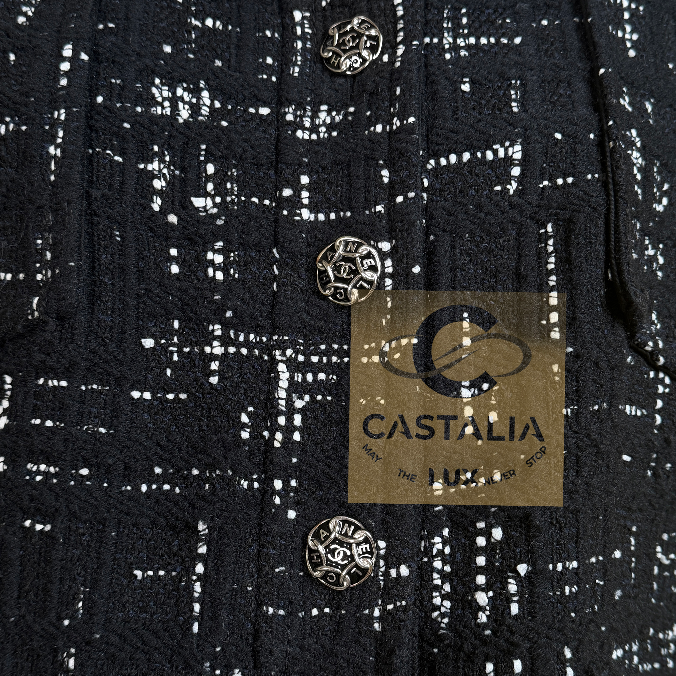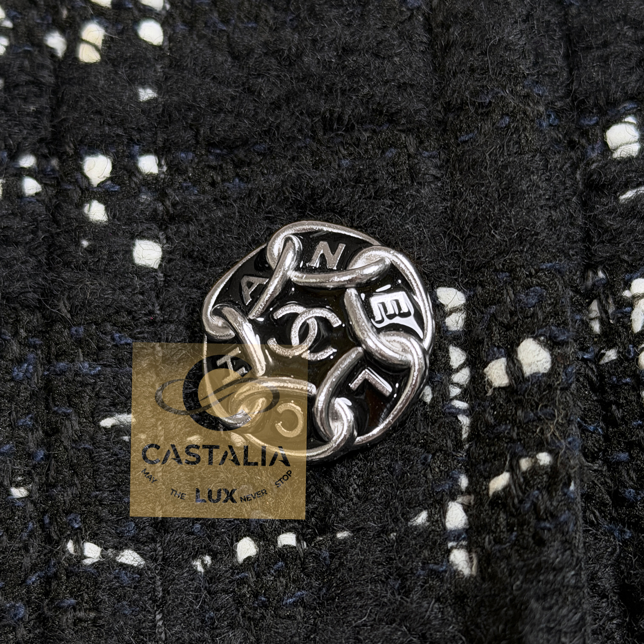 —At its axis, a series of masterpiece chain-link buttons engraved with the CHANEL lettering gleam like rivets of couture armor — jewels that fasten history to the present moment