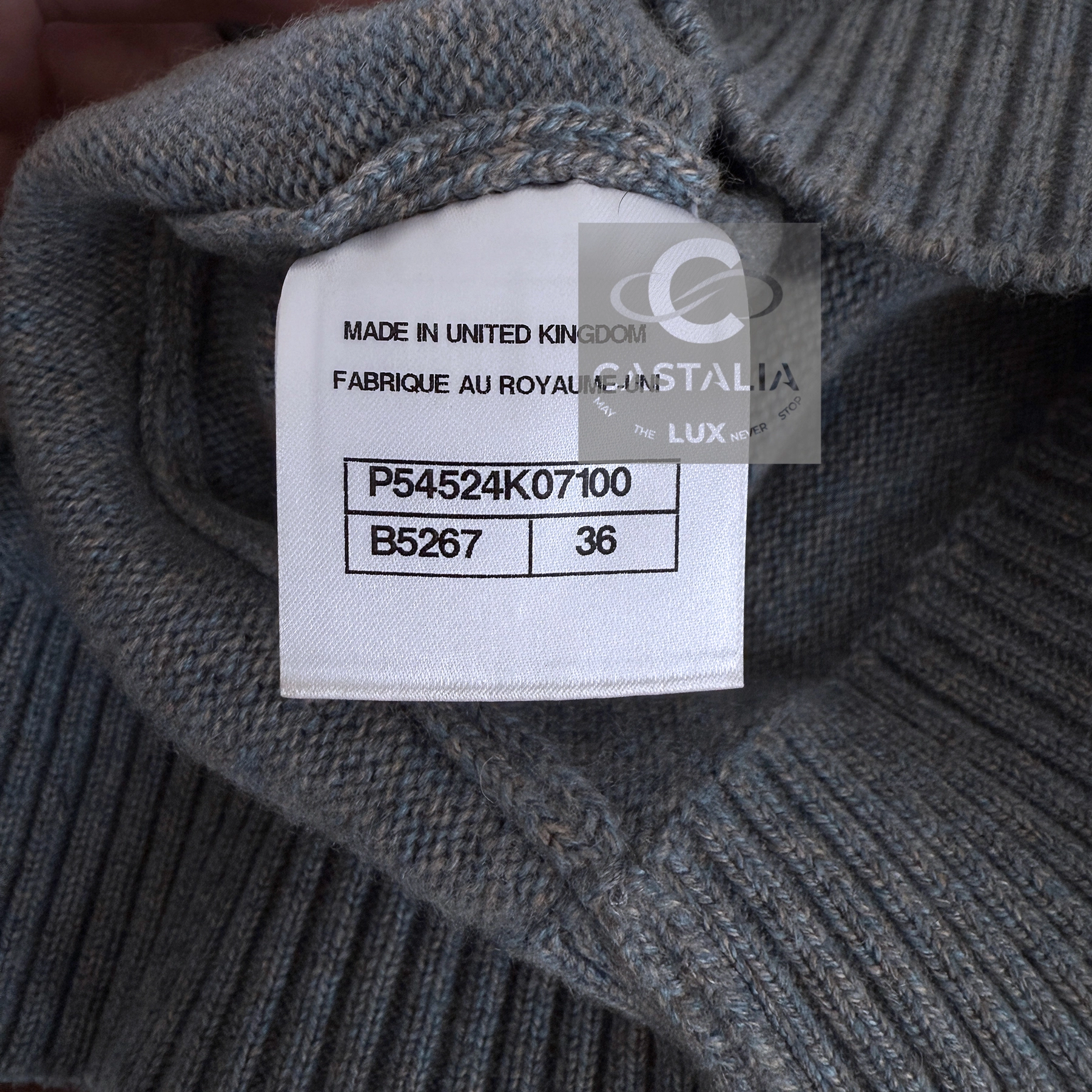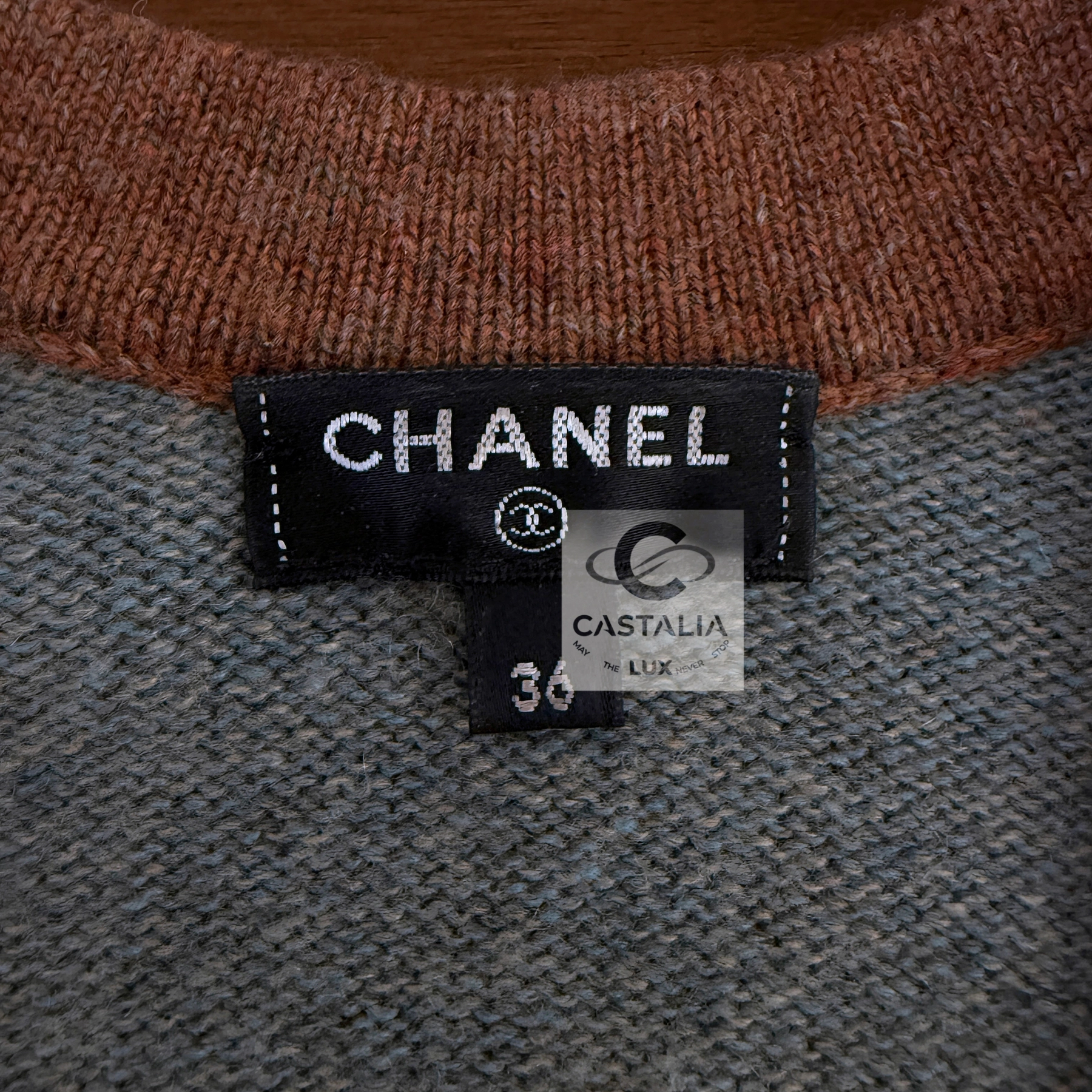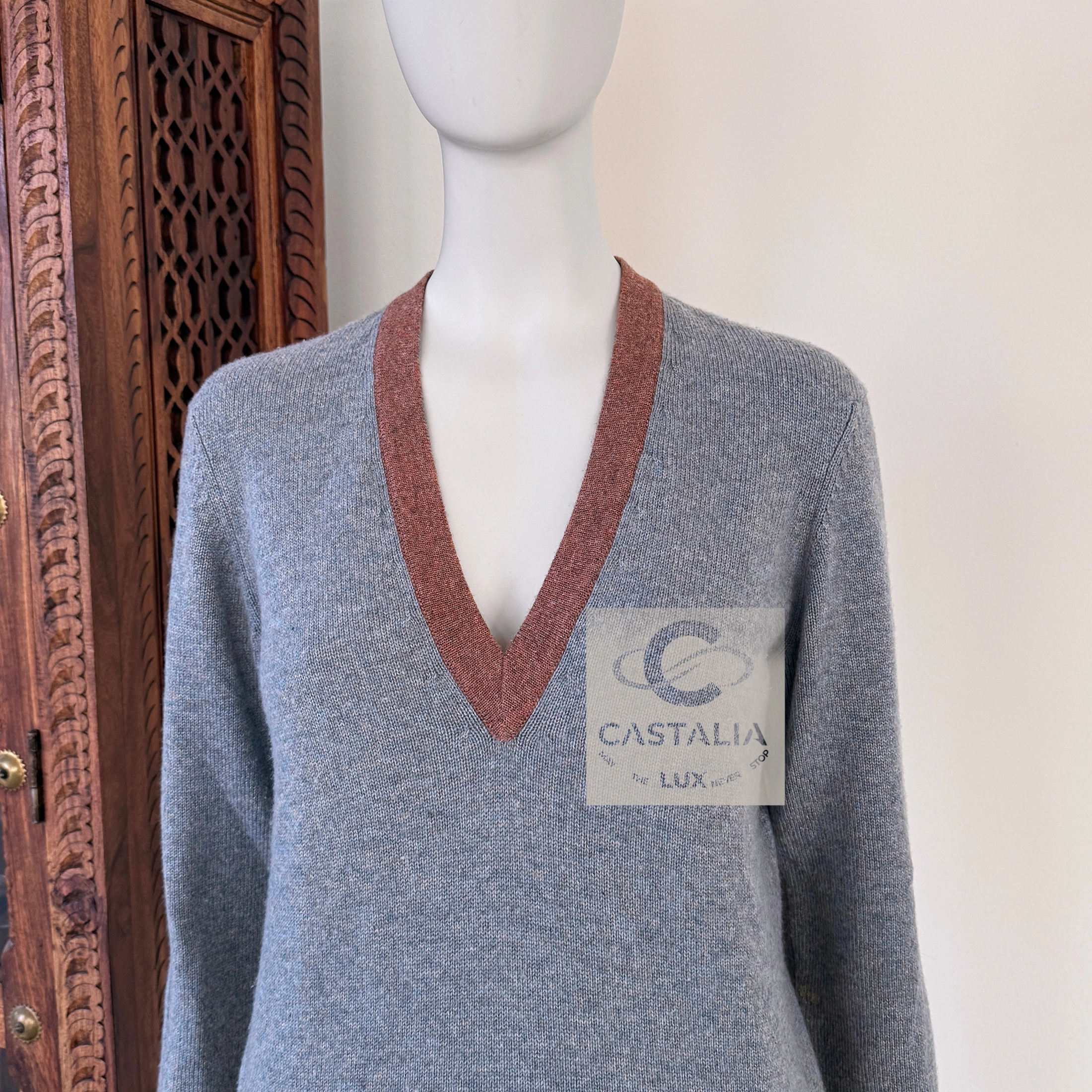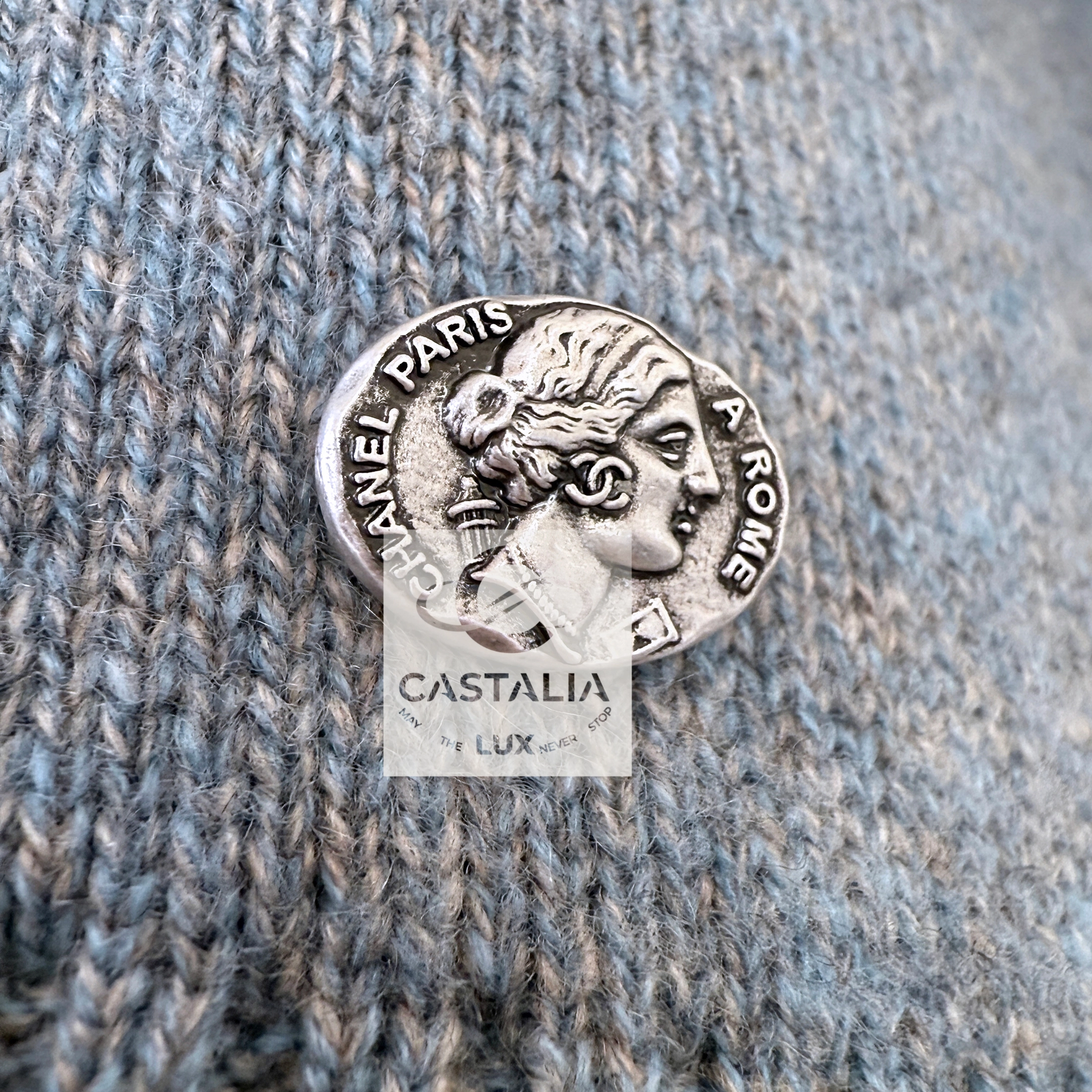 CHANEL Grey Cashmere Jumper with CC Jewel Charm — Paris in ROME Runway Relic, 2016 Métiers d’Art by Karl Lagerfeld ~ This is not merely knitwear but a fragment of Chanel cinematic couture — a wearable artifact where history and modernity, marble and celluloid, Rome and Chanel converge // Size mark 36 FR / Condition: never worn // — woven in the softest cashmere, hued in a noble steel-grey twilight — At the waist gleams a discreet jewel charm: the CC logo encasing a Roman imperial profile, a miniature coin of couture, connecting Paris to the Eternal City — V-neckline is framed by chestnut-beige trim, recalling both Roman fresco tones and the chiaroscuro of Cinecittà, where the collection was first unveiled — Ribbed hems and cuffs anchor the silhouette, balancing softness with subtle strength