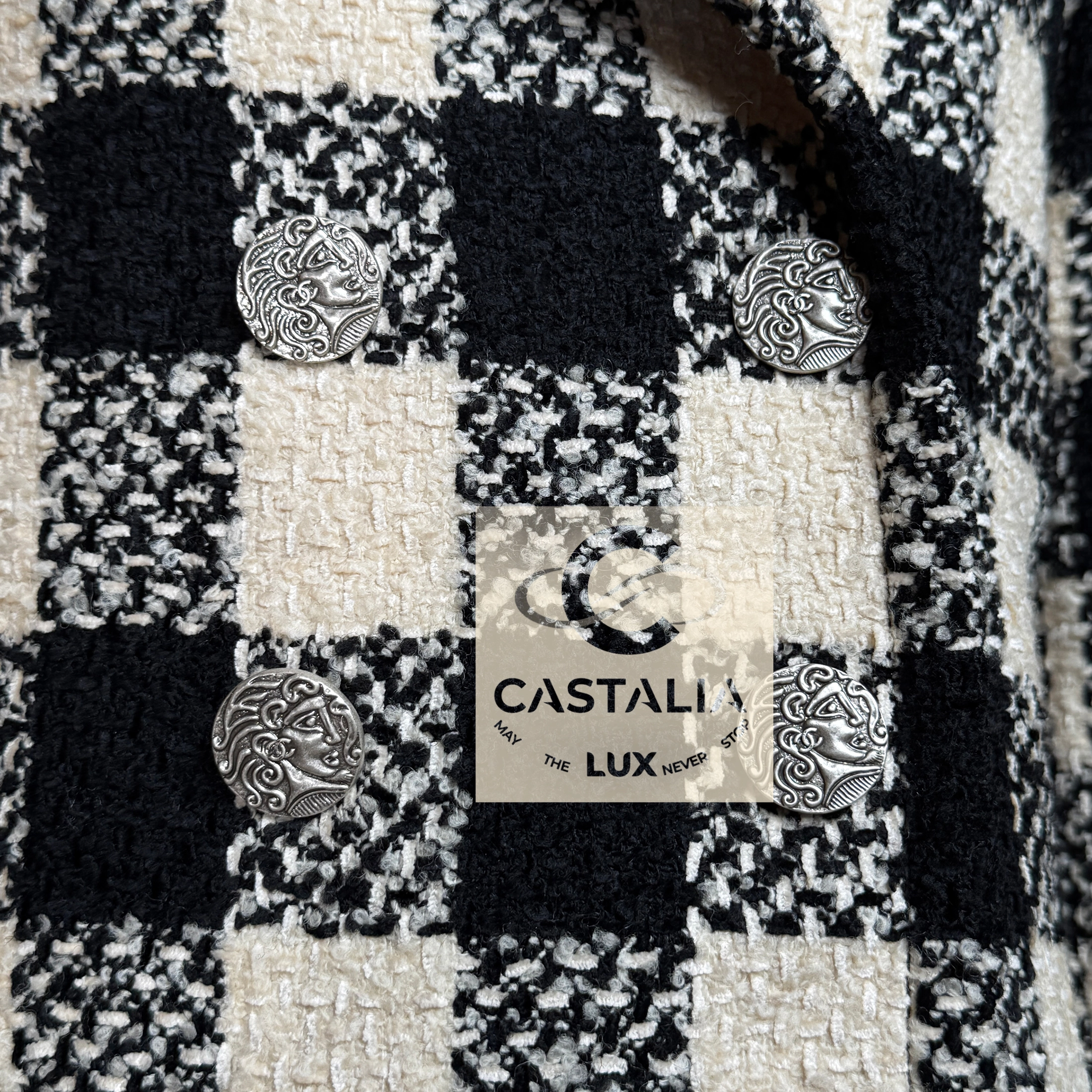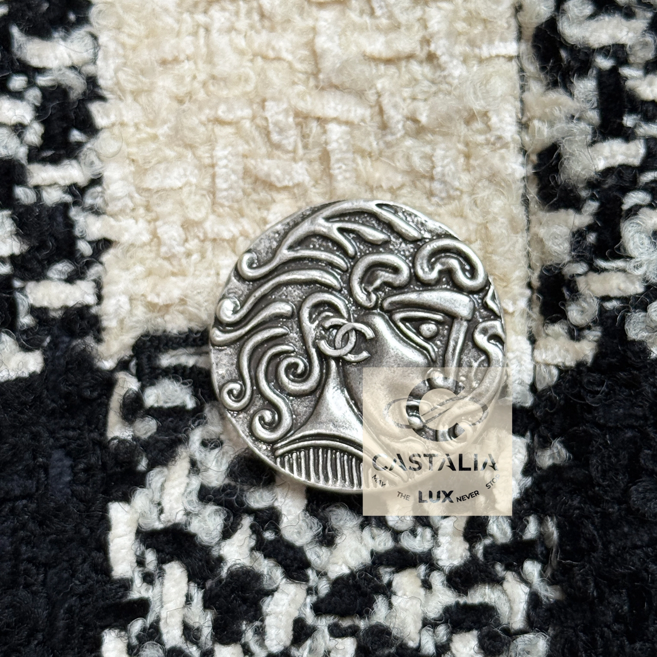 — Silver-tone CC logo buttons engraved with Roman profile faces adorn its surface like scattered denarii – coins of invisible empires anchoring the garment within Chanel’s immortal codes