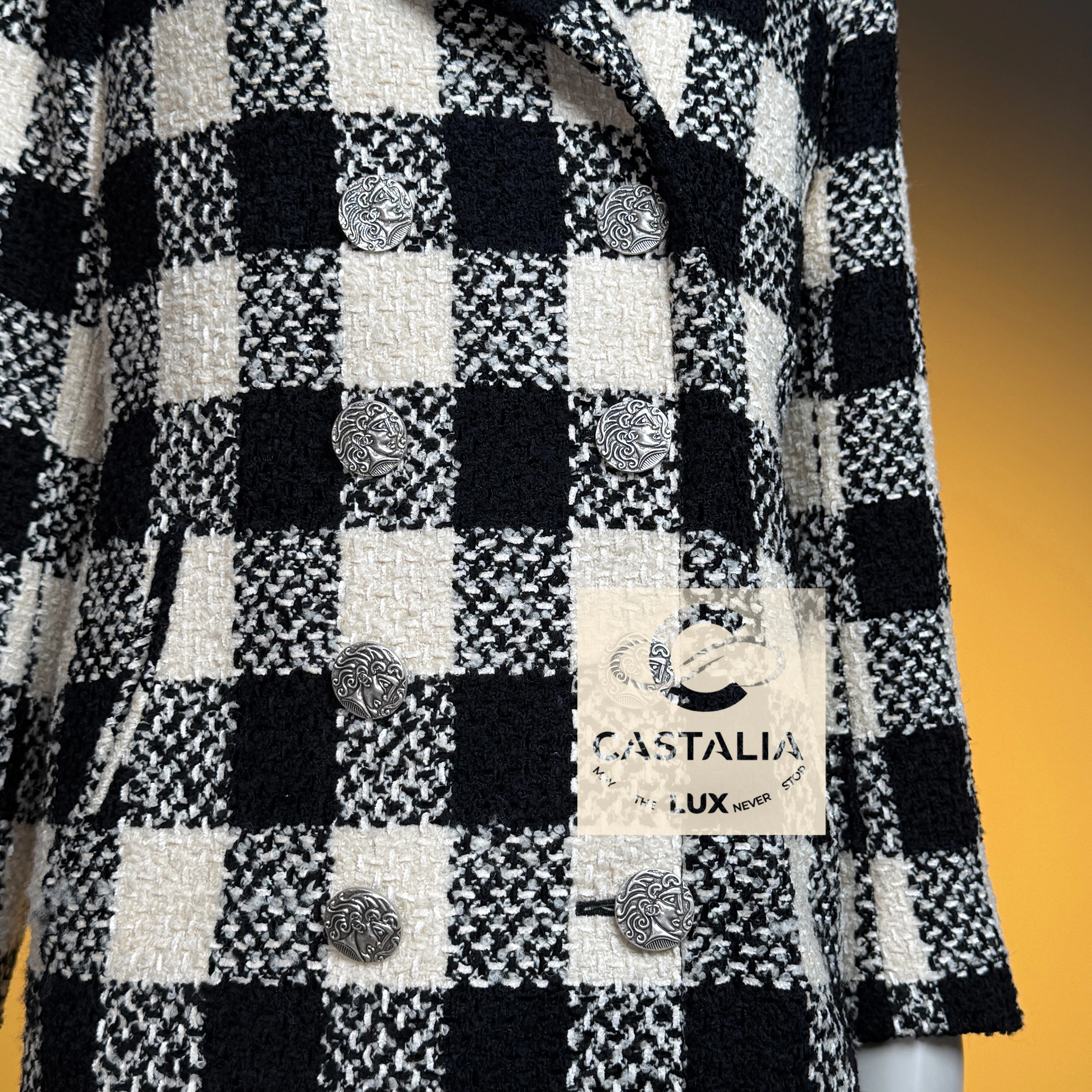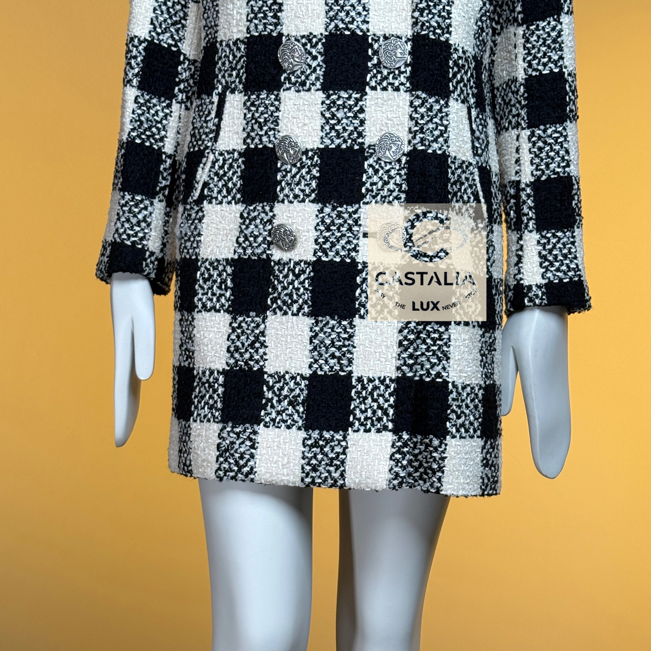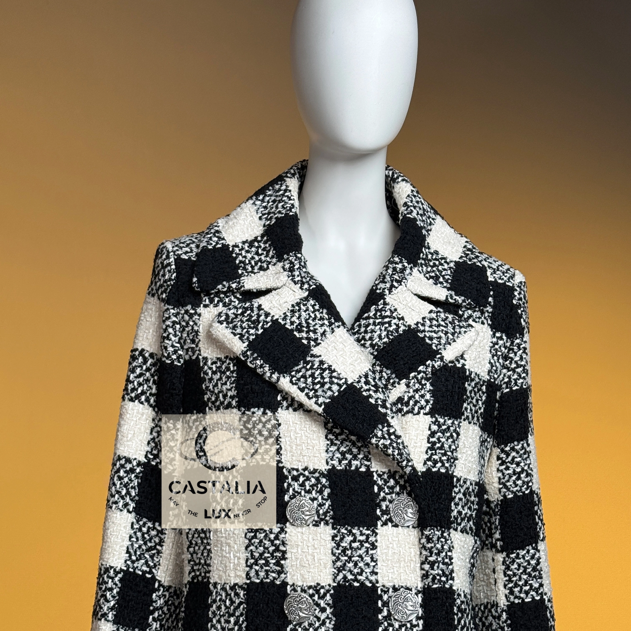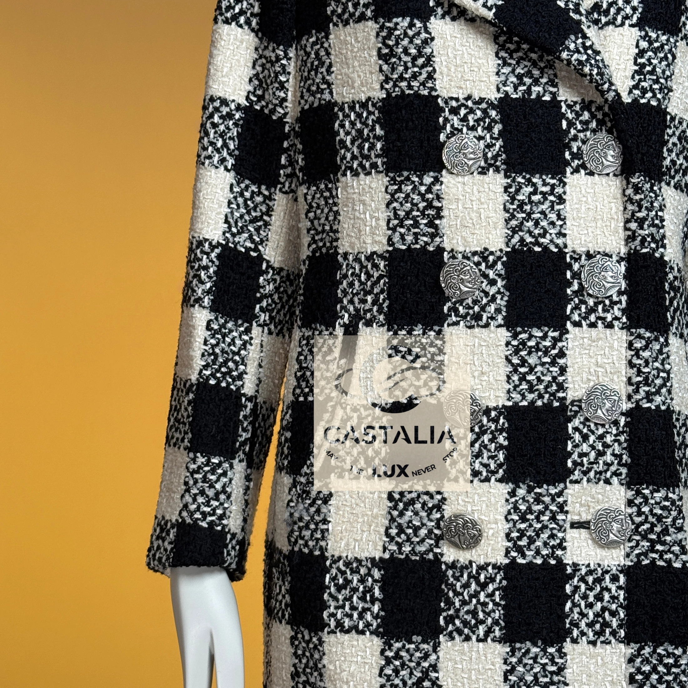 ~From the chiaroscuro dreamscape of Karl Lagerfeld’s — Paris in ROME 2016 Collection by Maestro Lagerfeld — this Chanel coat emerges as an artefact woven from cinema, Roman Empire heritage and shadowed eternity As seen in the campaign and on Pharrell Williams, it transcends the confines of season and trend, becoming the vestment that exists beyond temporal dictates – this is not outerwear, but a metaphysical mantle crafted to sheath its bearer in the eternal aesthetic defence of Chanel // Size mark 36 FR / Condition: never worn // — black and ecru tweed grid recalls the tessellated marble of Roman palazzos at dawn – each square a silent testament to geometry’s unbroken dominion over chaos — Silver-tone CC logo buttons engraved with Roman profile faces adorn its surface like scattered denarii – coins of invisible empires anchoring the garment within Chanel’s immortal codes — Finalized with tonal silk lining – a hidden floral scripture pressed against the skin