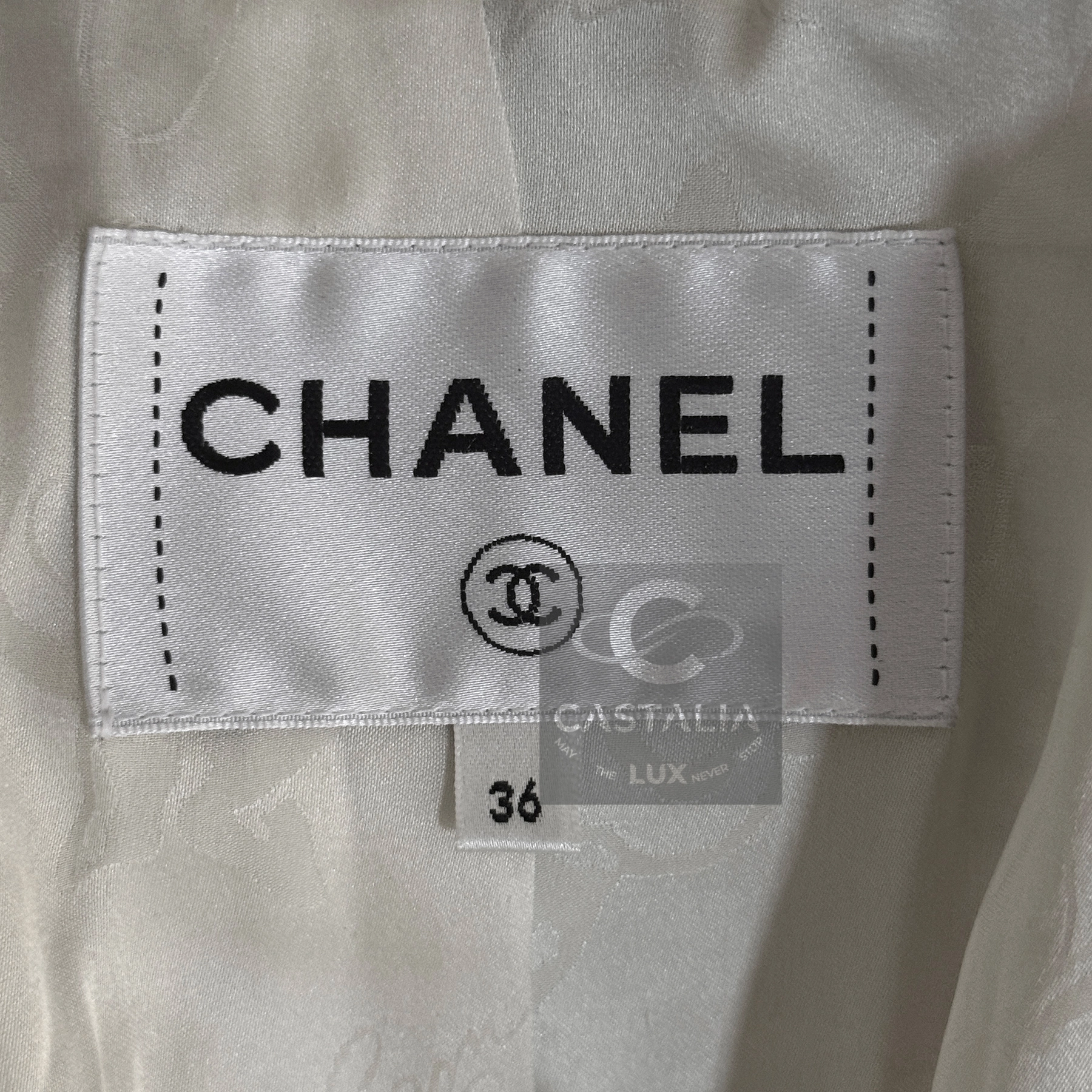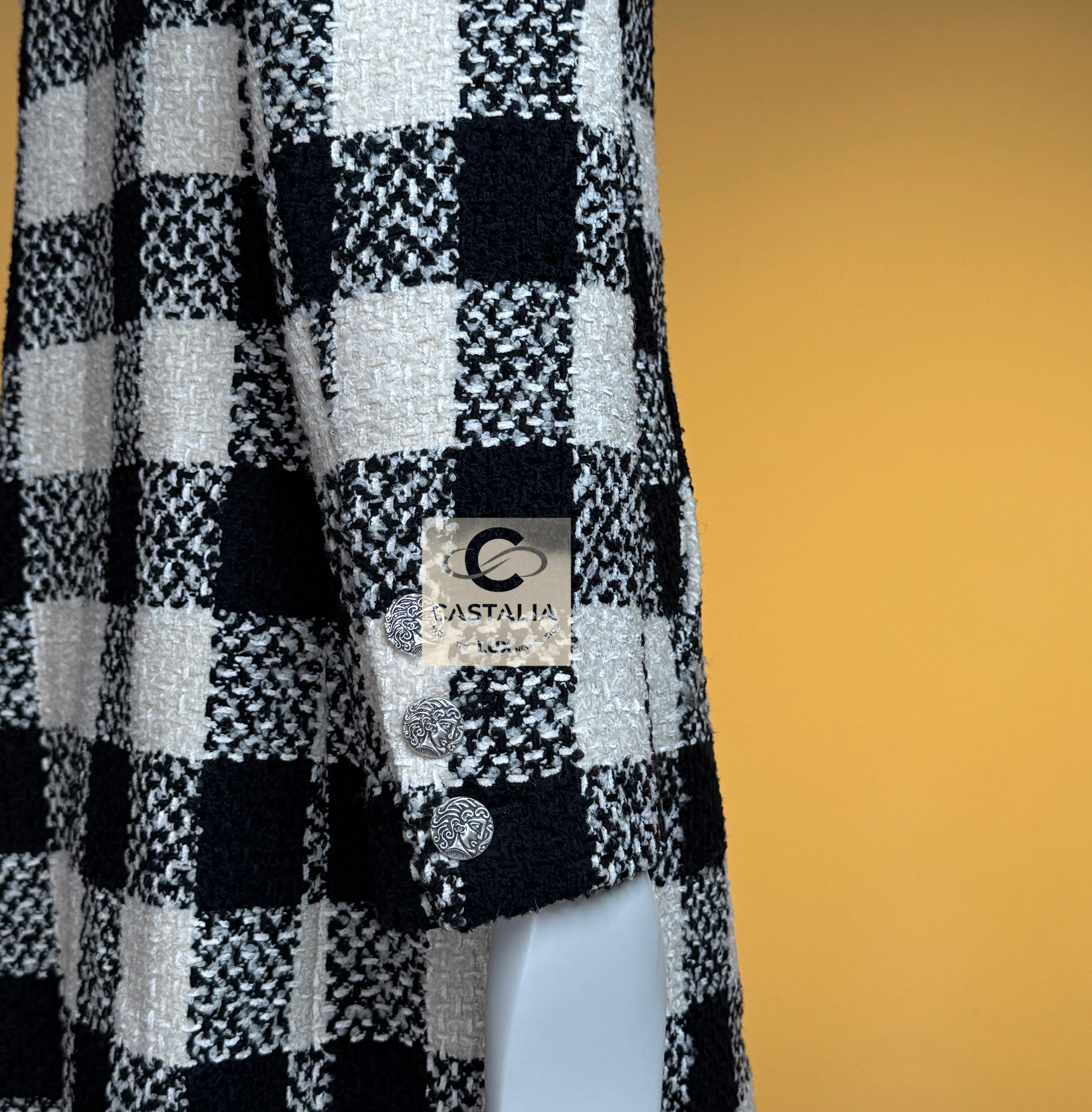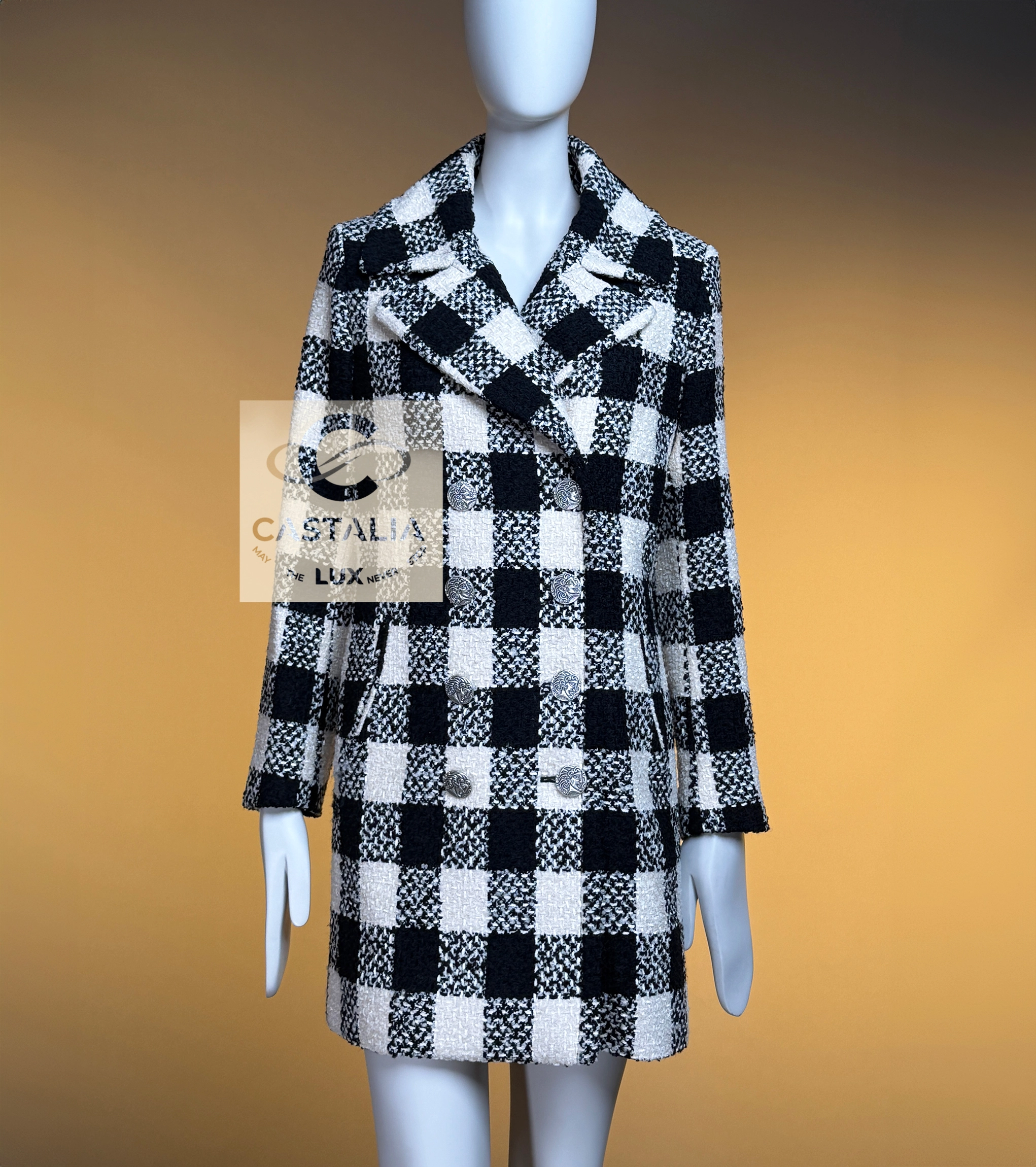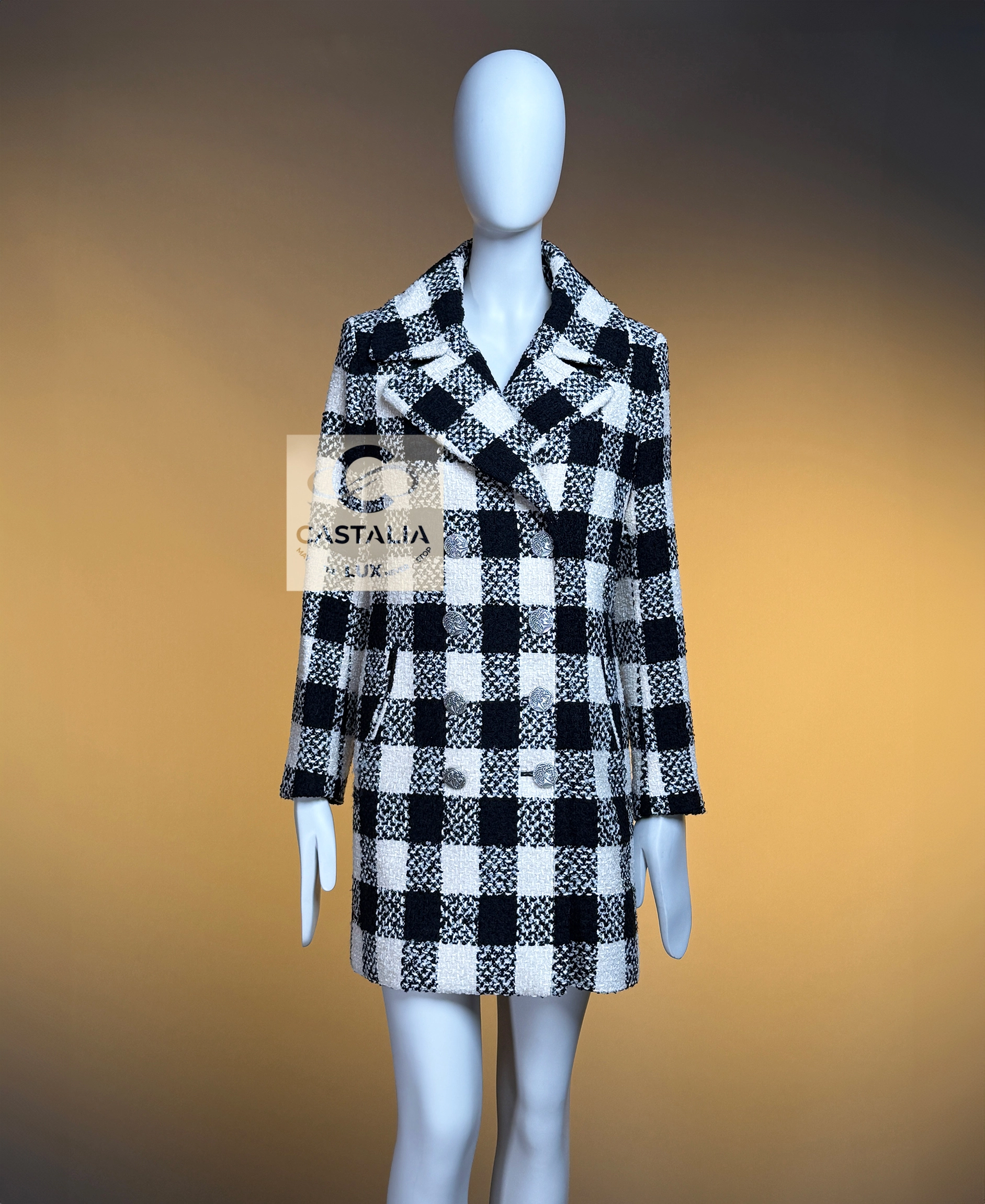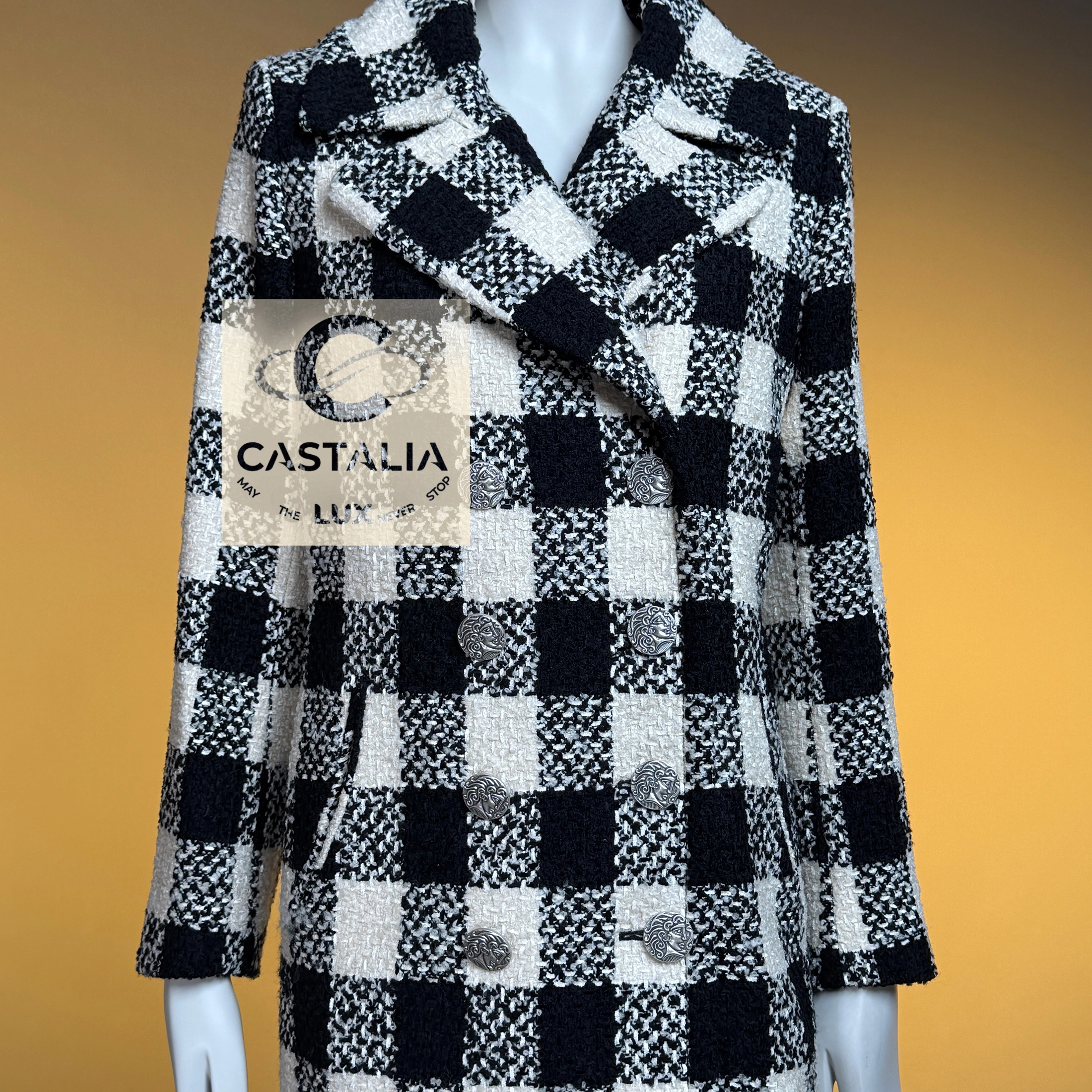 ~From the chiaroscuro dreamscape of Karl Lagerfeld’s — Paris in ROME 2016 Collection by Maestro Lagerfeld — this Chanel coat emerges as an artefact woven from cinema, Roman Empire heritage and shadowed eternity As seen in the campaign and on Pharrell Williams, it transcends the confines of season and trend, becoming the vestment that exists beyond temporal dictates – this is not outerwear, but a metaphysical mantle crafted to sheath its bearer in the eternal aesthetic defence of Chanel // Size mark 36 FR / Condition: never worn // — black and ecru tweed grid recalls the tessellated marble of Roman palazzos at dawn – each square a silent testament to geometry’s unbroken dominion over chaos — Silver-tone CC logo buttons engraved with Roman profile faces adorn its surface like scattered denarii – coins of invisible empires anchoring the garment within Chanel’s immortal codes — Finalized with tonal silk lining – a hidden floral scripture pressed against the skin