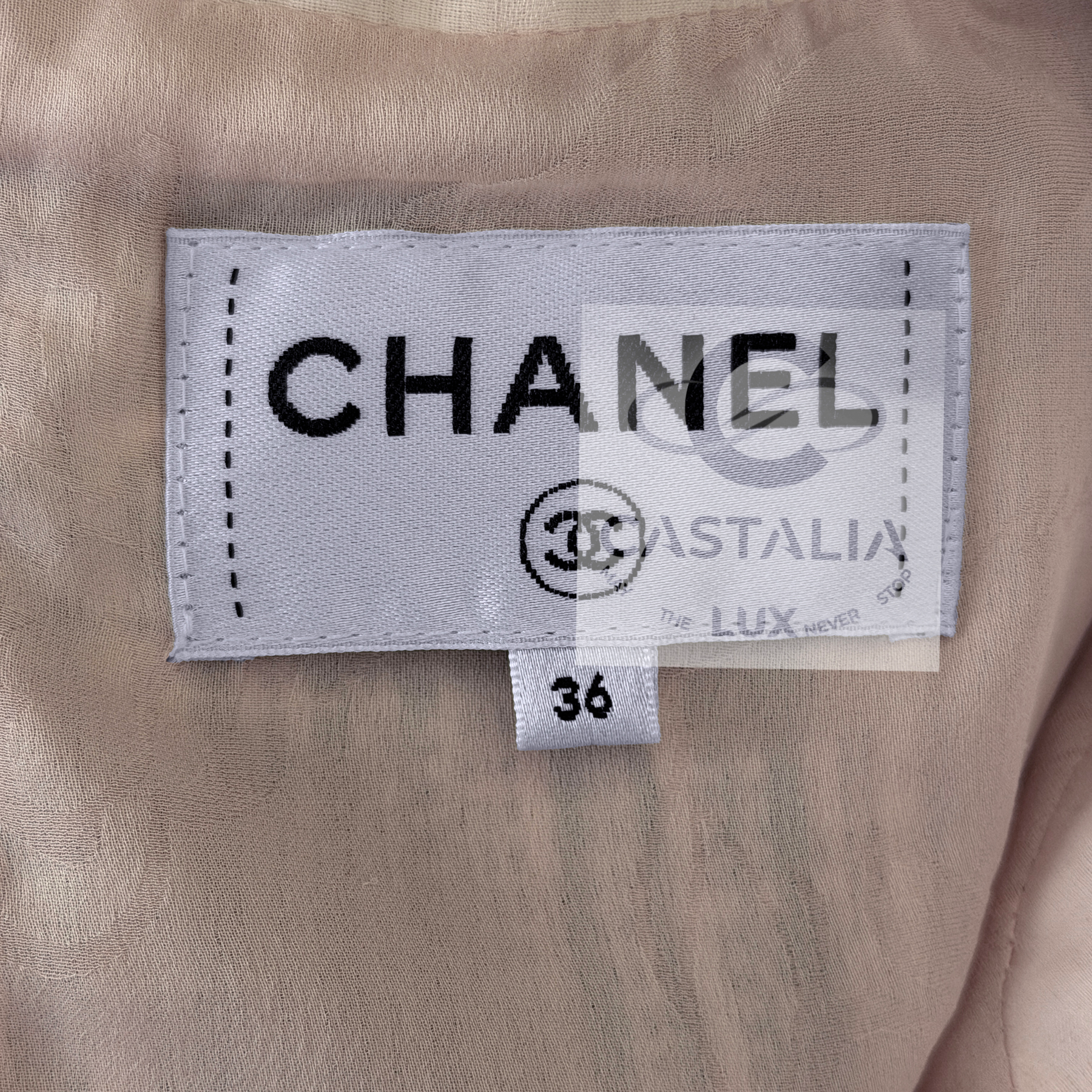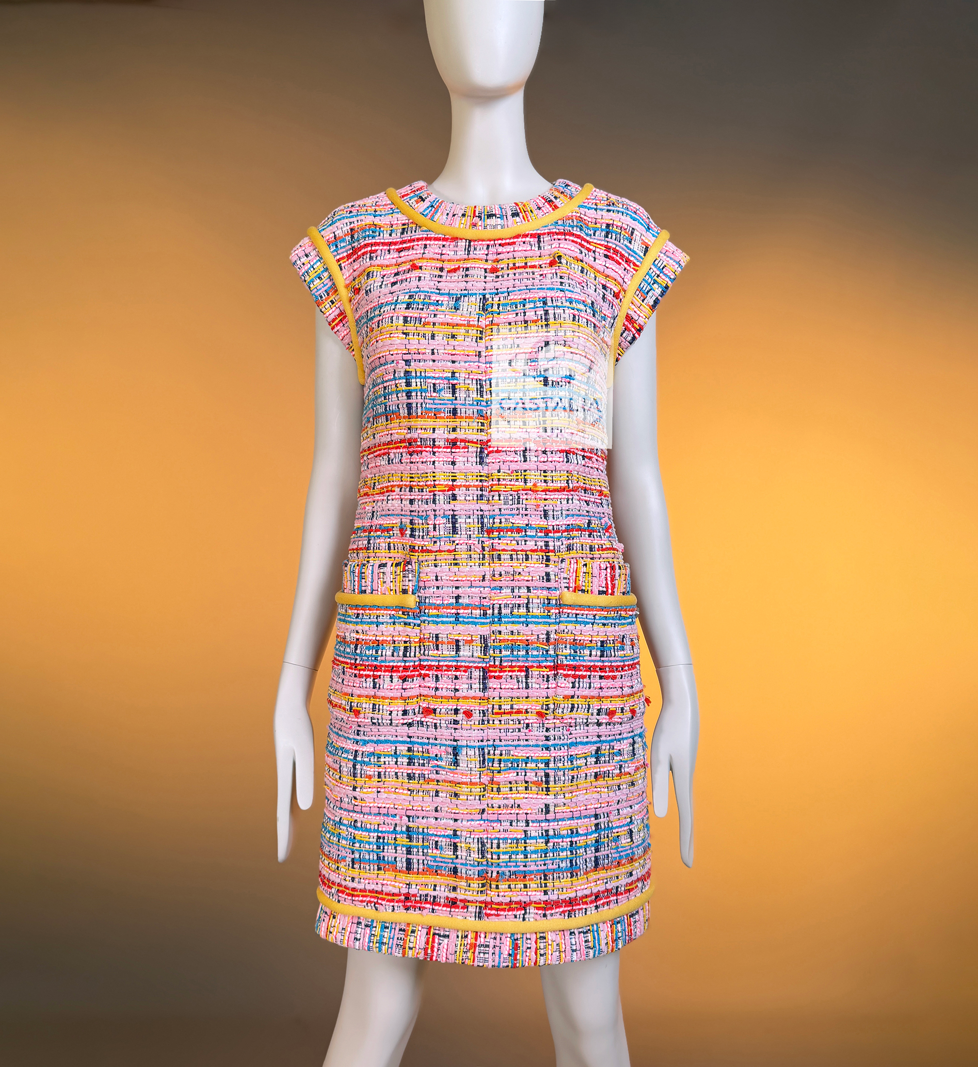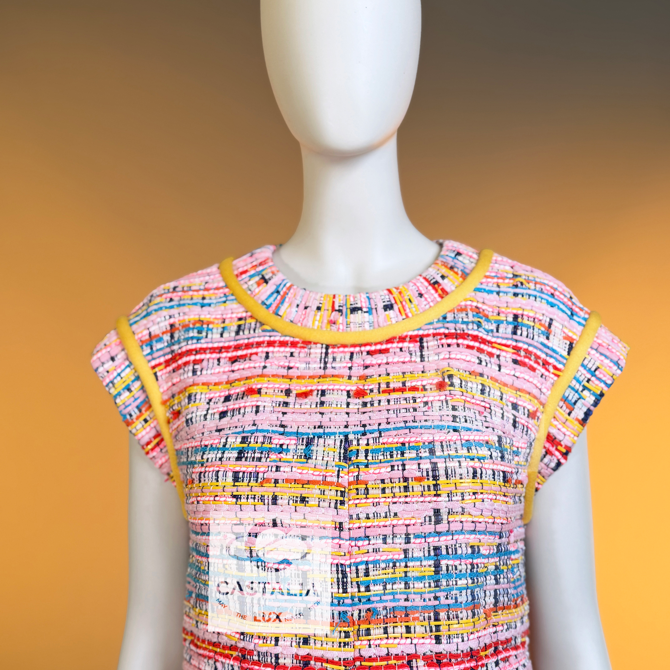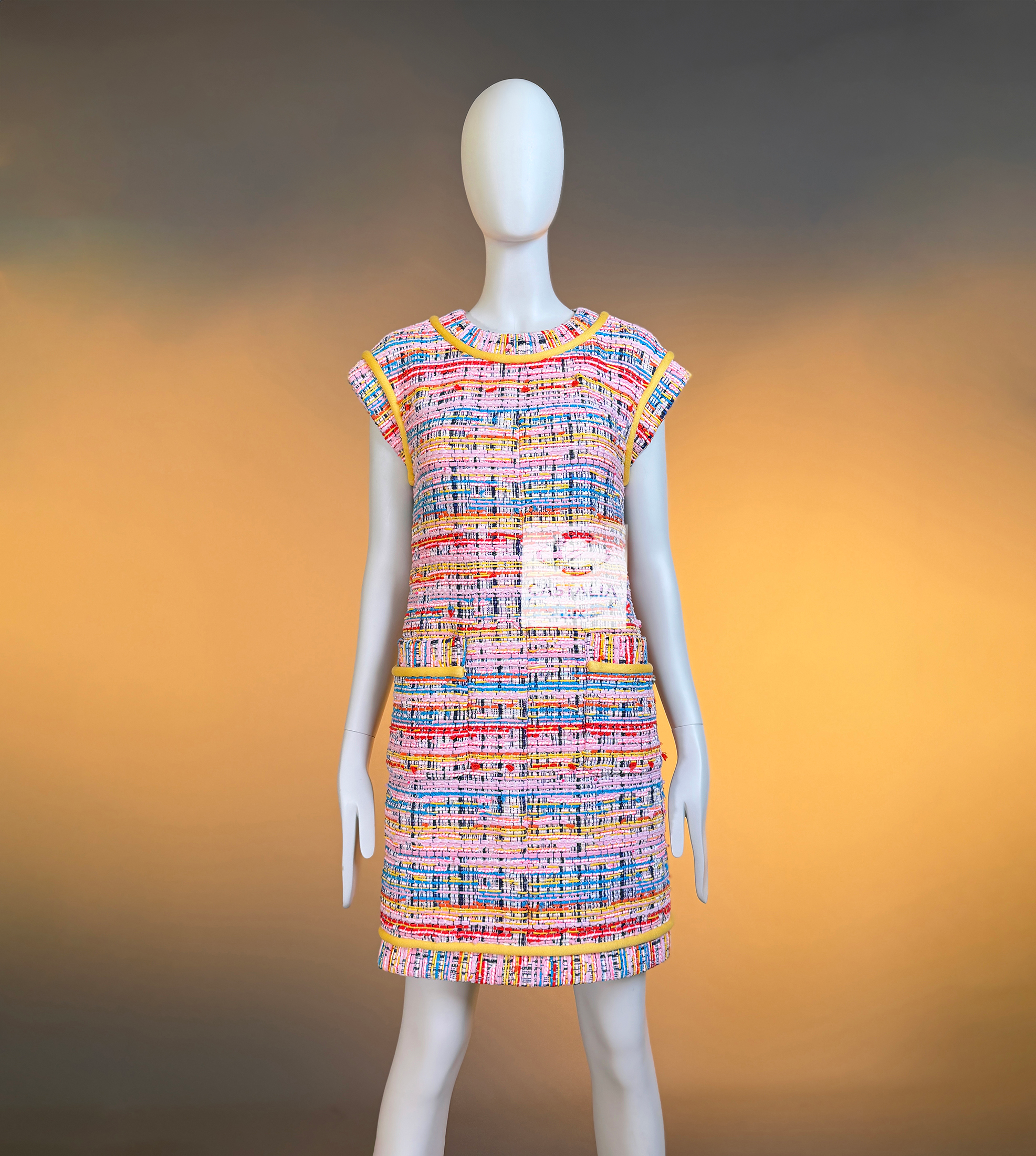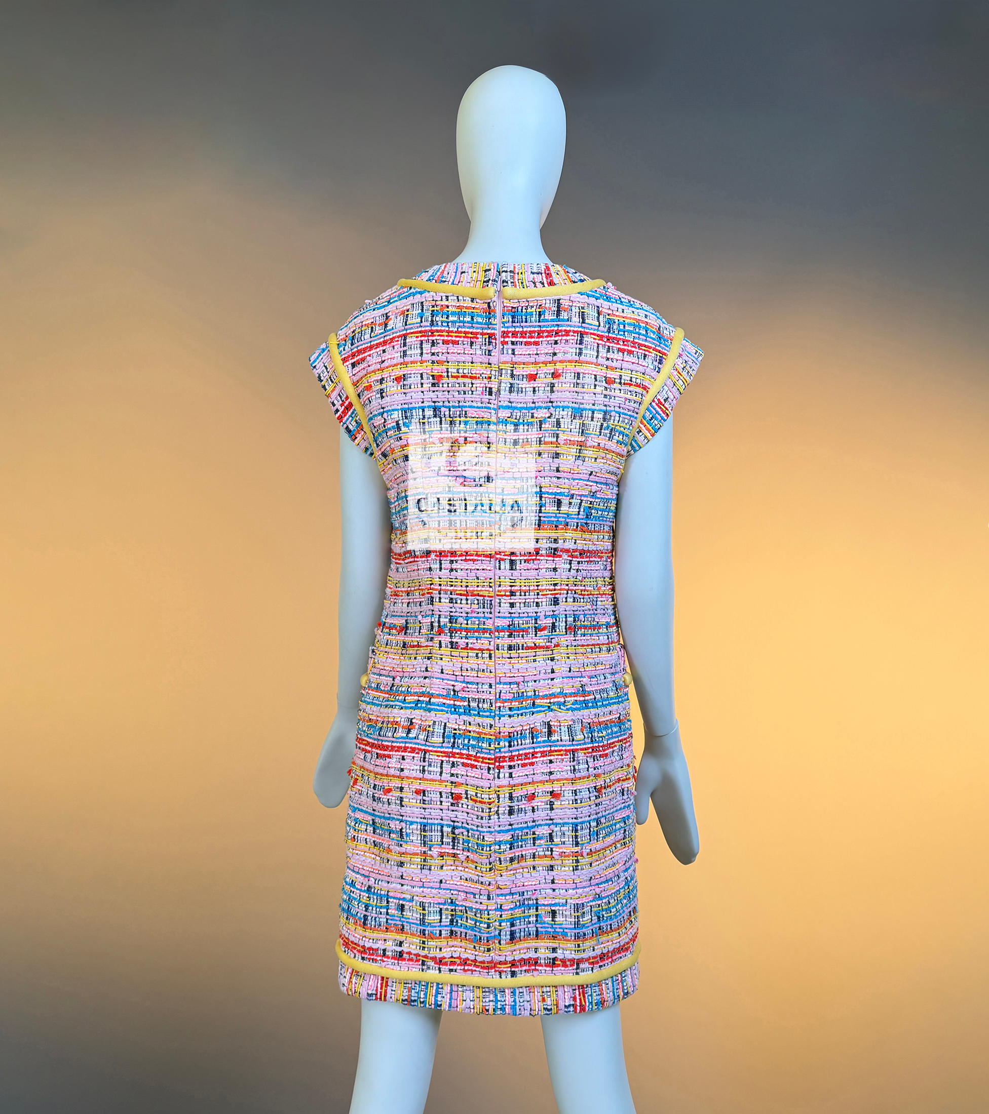 — Chanel Exquisite Lesage Tweed Dress Runway of the “ROBOT” Collection, Spring 2017 by Karl Lagerfeld — Boutique Value over $9,000 ~ A masterpiece of radiant geometry, this Chanel dress emerges from the Spring 2017 Runway, the famed “ROBOT” Collection — a moment where Karl Lagerfeld fused futurism with couture’s eternal codes ~ As seen on fashion icon Anna Dello Russo, this dress transcends its season, standing as both artifact and oracle: couture woven into the digital age, a relic of Lagerfeld’s vision of Chanel’s future // Size mark 36 FR / Condition: never worn // — Woven by the legendary ateliers of Lesage, the tweed glows with a chromatic symphony: shades of coral, azure, rose, and sunlit gold interlace like pixels of a living mosaic. — Outlined with contrast yellow piping, the silhouette achieves both clarity and exaltation, as if framed in light — A jewel CC logo charm glimmers discreetly at the side, a seal of authenticity from the House’s highest order — Within, a tonal silk lining rests against the body — a hidden sanctuary of softness