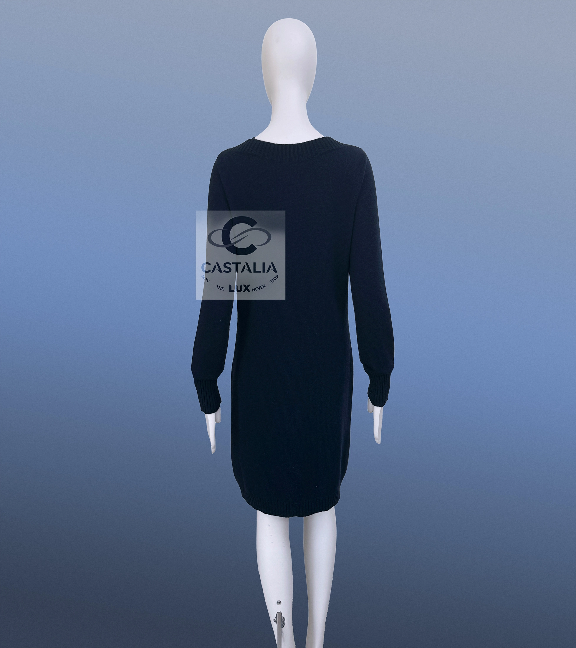 — Spun from ultra-soft dark navy cashmere, the knit falls in a long, columnar line, evoking the composure of couture tailoring translated into purity of knit
