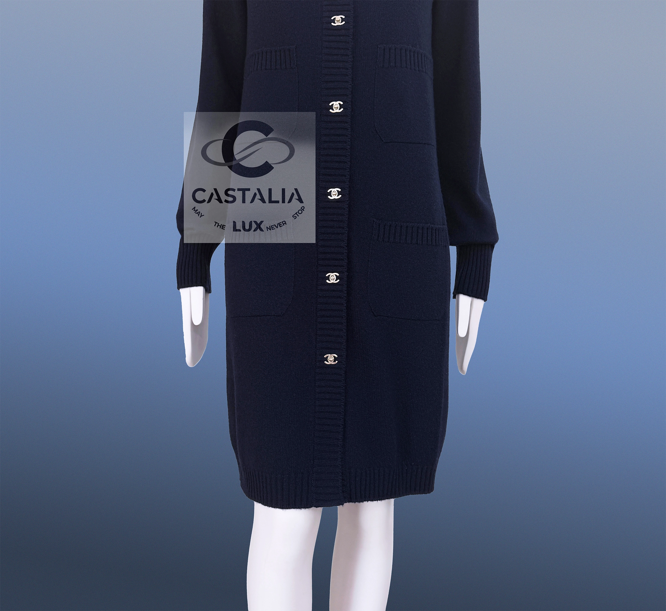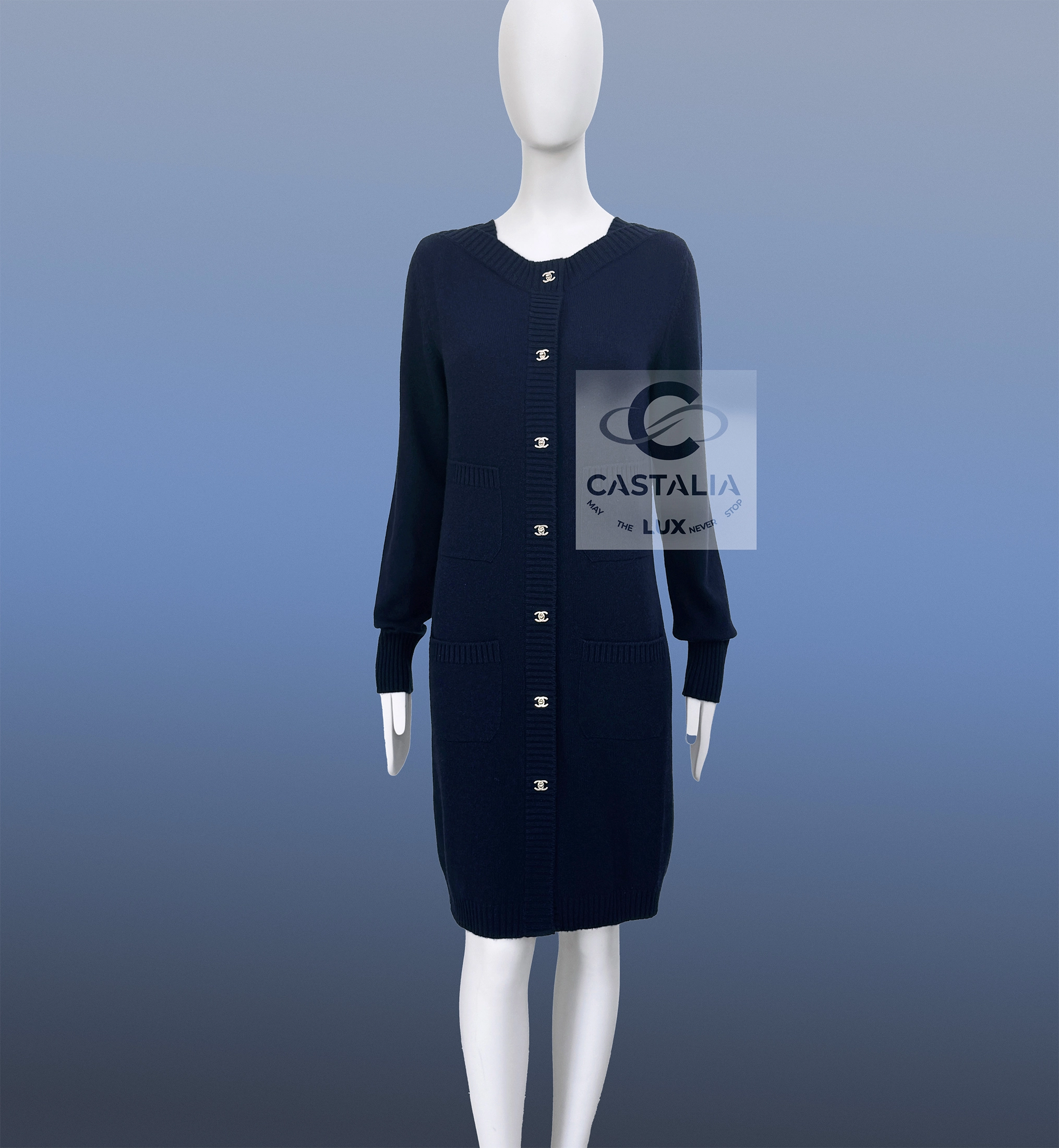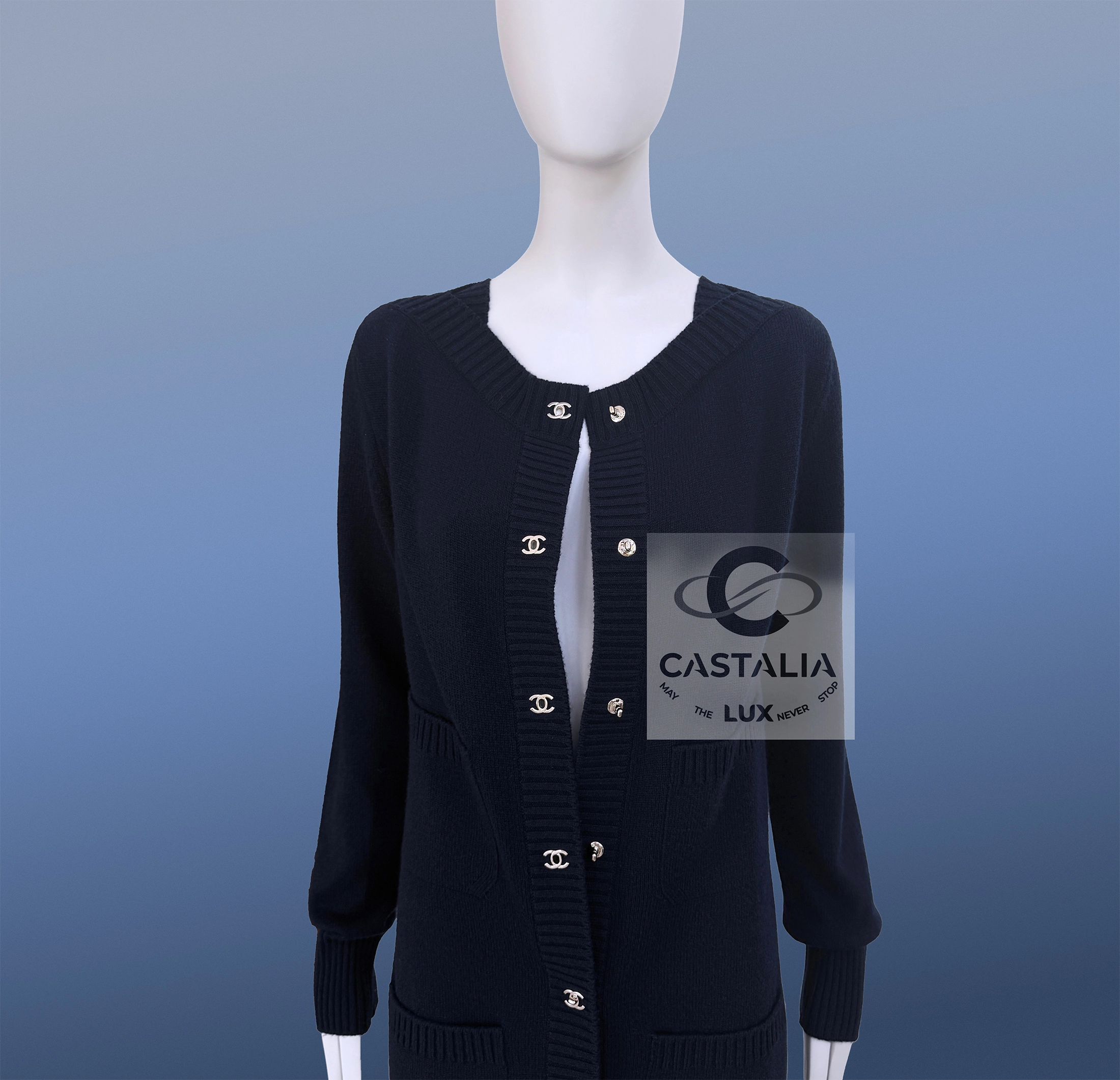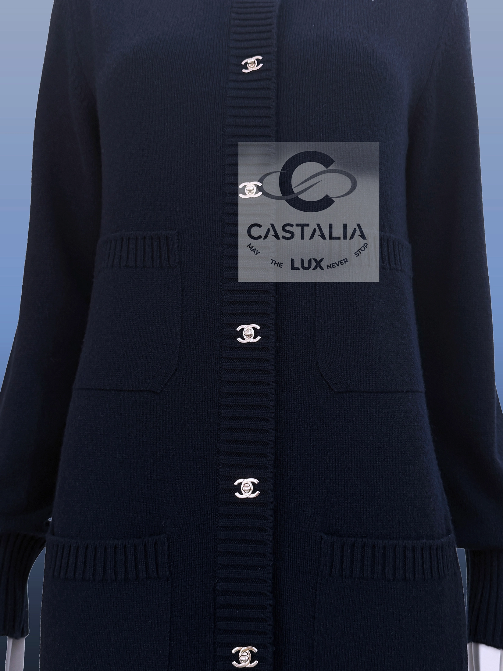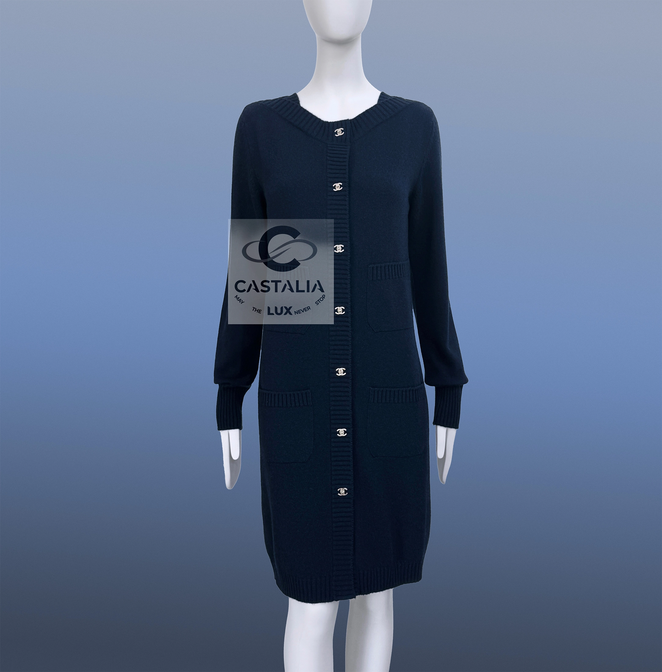CHANEL · Eternal Navy Cashmere Cardigan with Iconic CC Turnlock Closures — A perennial Chanel archetype, resurfacing most recently in the Fall 2024 Collection — ~ A silhouette that returns through the decades like a liturgy — serene, architectural, and quietly sovereign ~ For the collector who understands that some Chanel designs are not merely seasonal, but eternal recitations of the Maison’s soul. // Maison size mark: 38 FR // Condition: never worn // — Spun from ultra-soft dark navy cashmere, the knit falls in a long, columnar line, evoking the composure of couture tailoring translated into purity of knit — A vertical procession of CC turnlock closures — the very mechanism that defined Chanel handbags — transforms the front into a sacred axis; each closure a small declaration of heritage, precision, and permanence — Four architectural patch pockets merge function with ritual form, echoing the quiet geometry of classic Chanel jackets — Ribbed trim along the placket, cuffs, and hem lends a subtle, monastic sculpting to the silhouette, allowing the cardigan to move like a robe of modern ceremony