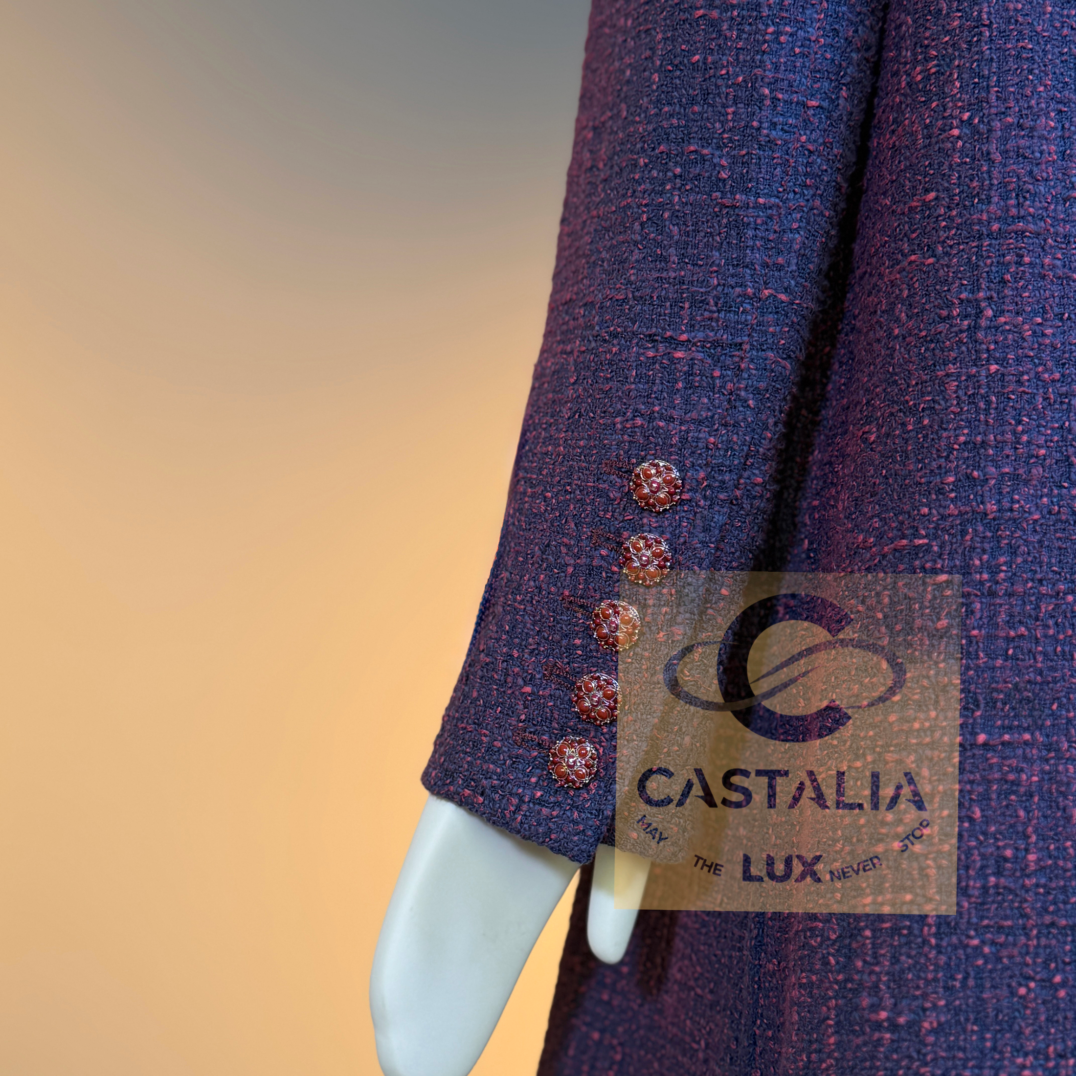 — Woven in the sacred ateliers of Lesage, its tweed is a profound symphony of deep purple interwoven with navy and crimson threads