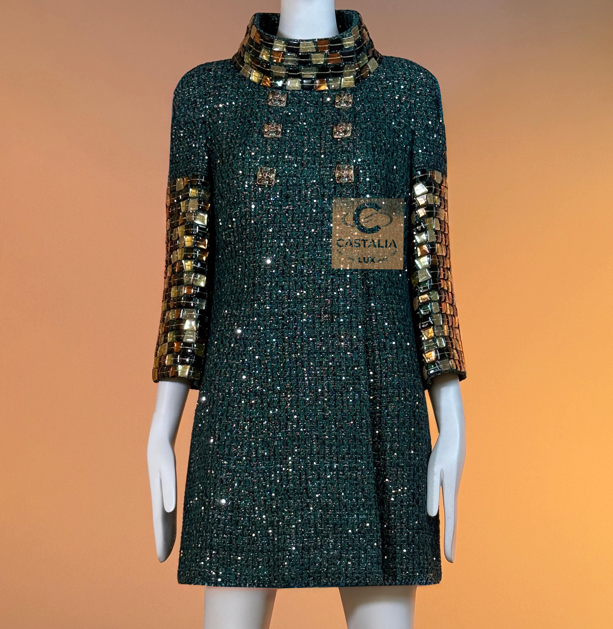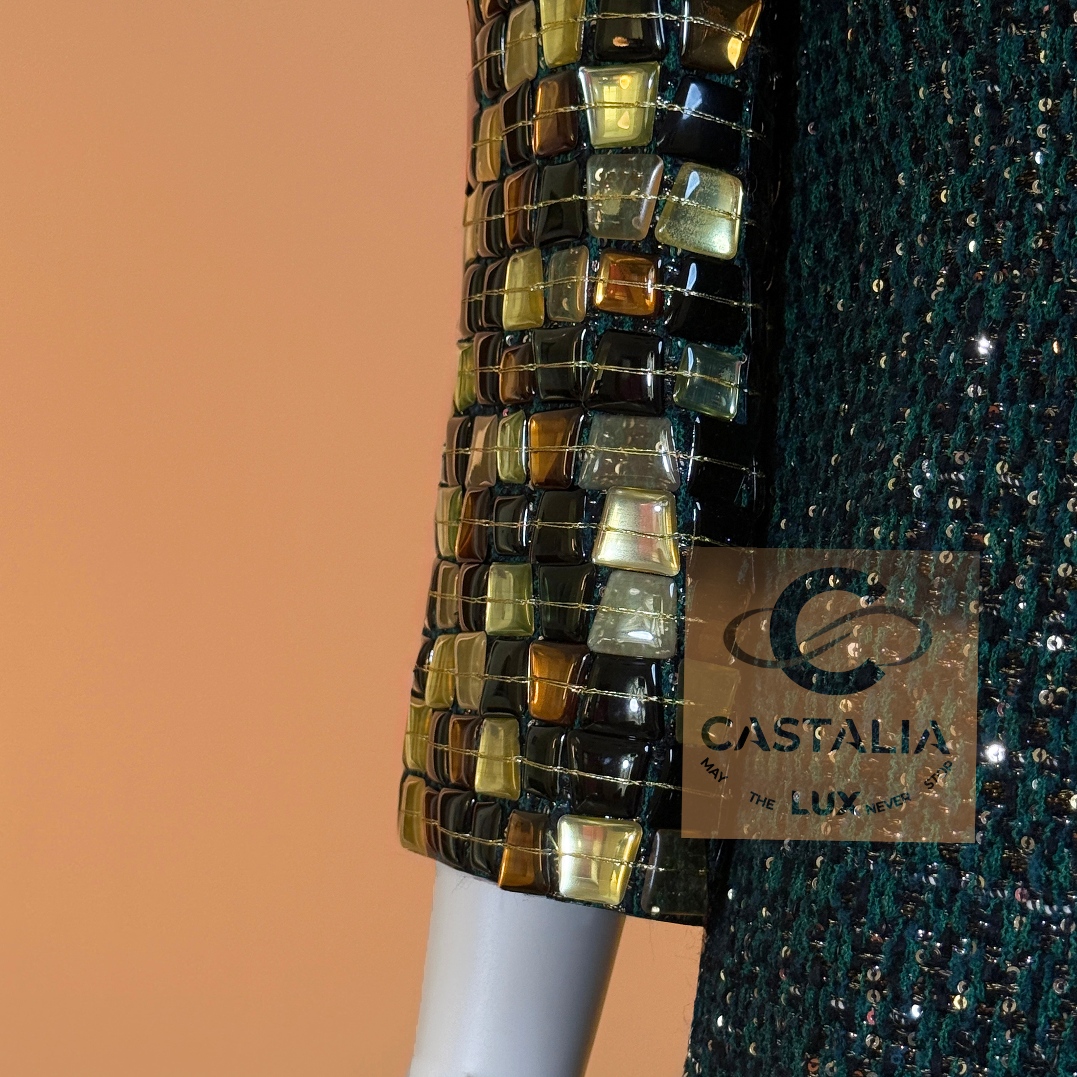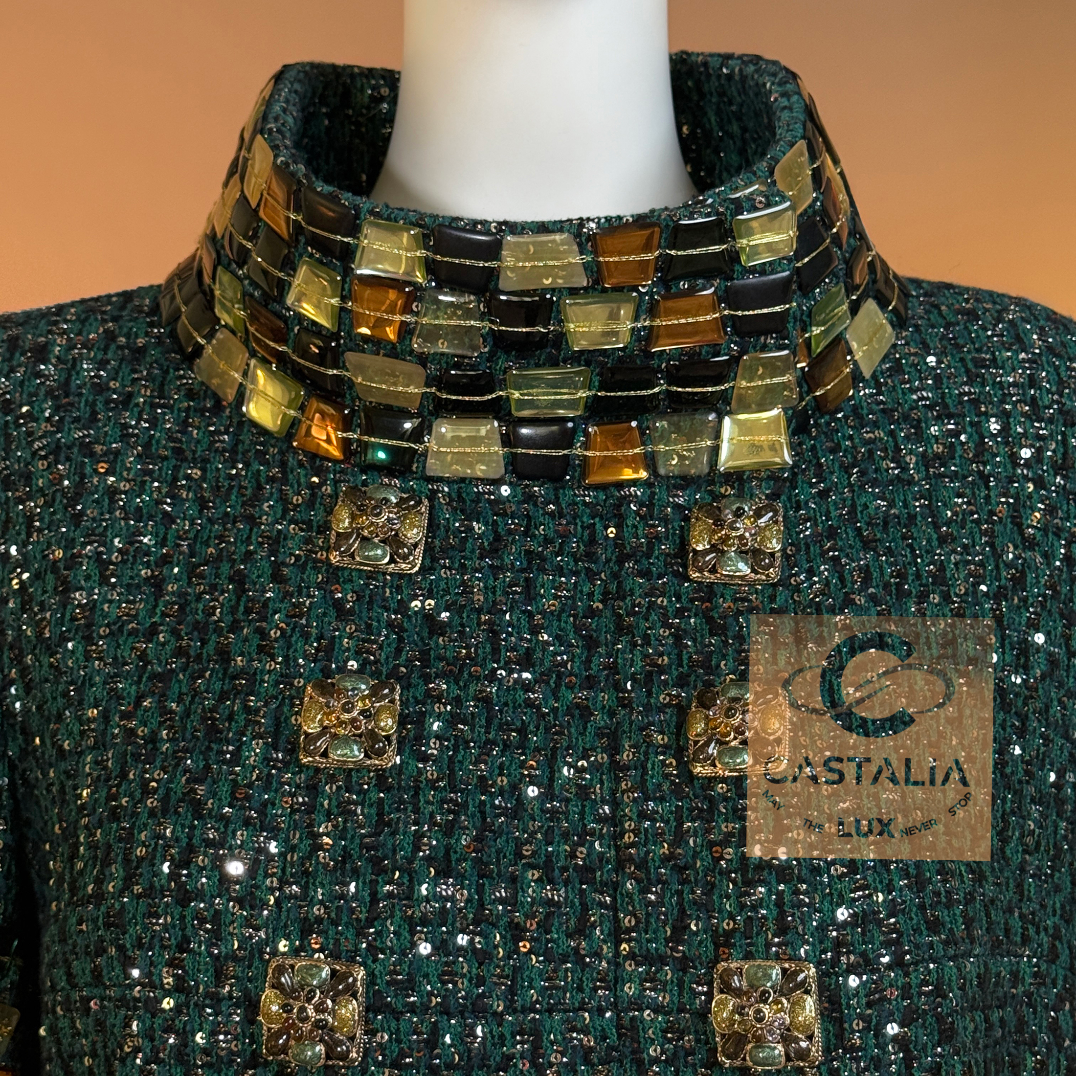 CHANEL · Emerald Jewel Mosaic Tweed Coat with CC Gripoix Buttons — Paris / BYZANCE 2011 Métiers d’Art, Karl Lagerfeld • An acquisition. Not a trend. A relic with investment gravity • — As seen on Princess Caroline of Monaco • Status: museum-level, ultra-collectible (mythology-tier) — A Paris–Byzance relic that does not merely reference Byzantium — it revives it in Chanel’s own language: emerald as sacred stone, sequins as starlit dust, mosaic as imperial border, Gripoix as seal — This is Métiers d’Art at its most absolute: a garment built like a reliquary, meant to be worn rarely, preserved carefully, and read like a cultural objecy // Size mark 40 FR / Condition: never worn // — House Codes · Material Authority — • Masterpiece Lesage tweed in deep emerald — noble, mineral, eternal • Hand-embellished with the tiniest shimmering sequins — a controlled constellation embedded into the weave, radiance as craft — Byzantine Mosaic · Couture as Icon — • Mosaic-like jewel pieces along the collar and sleeves — gilded tesserae translated into wearable border-work • The collar reads like an imperial crown line; the sleeves like bracers — Byzantium rendered in Chanel proportion, never costume, always doctrine — Jewels · Seals · Talisman Hardware — • Art-like Gripoix jewel buttons with CC logos, stone-embellished — closures as relic seals, not decoration — Silhouette · Presence — • A composed coat line that lets the surface speak — structure held in restraint, opulence organized • The embellishment frames the body as an icon is framed: border defining aura • Tonal silk lining inside — private completion, where drape and comfort resolve into certainty.
