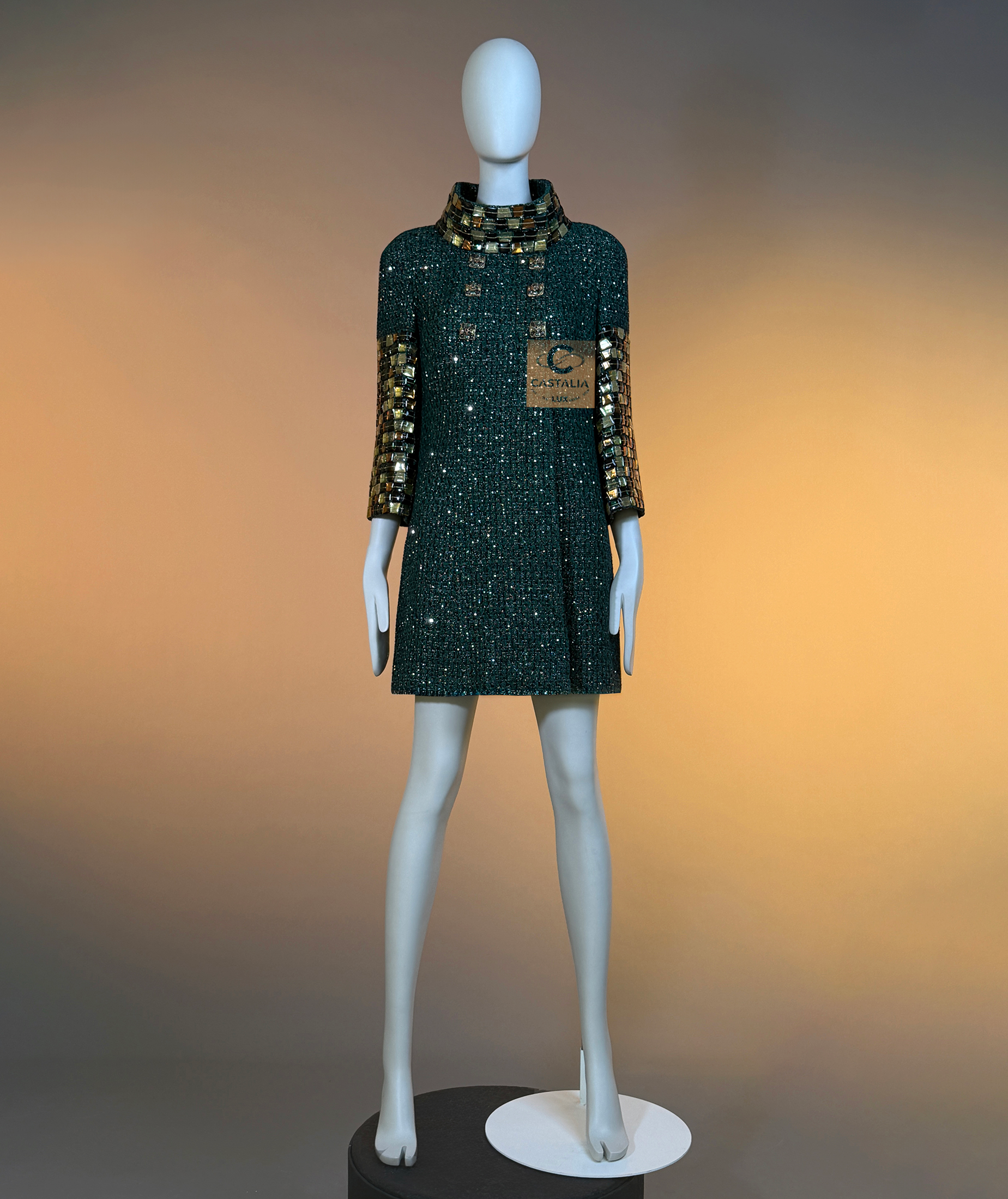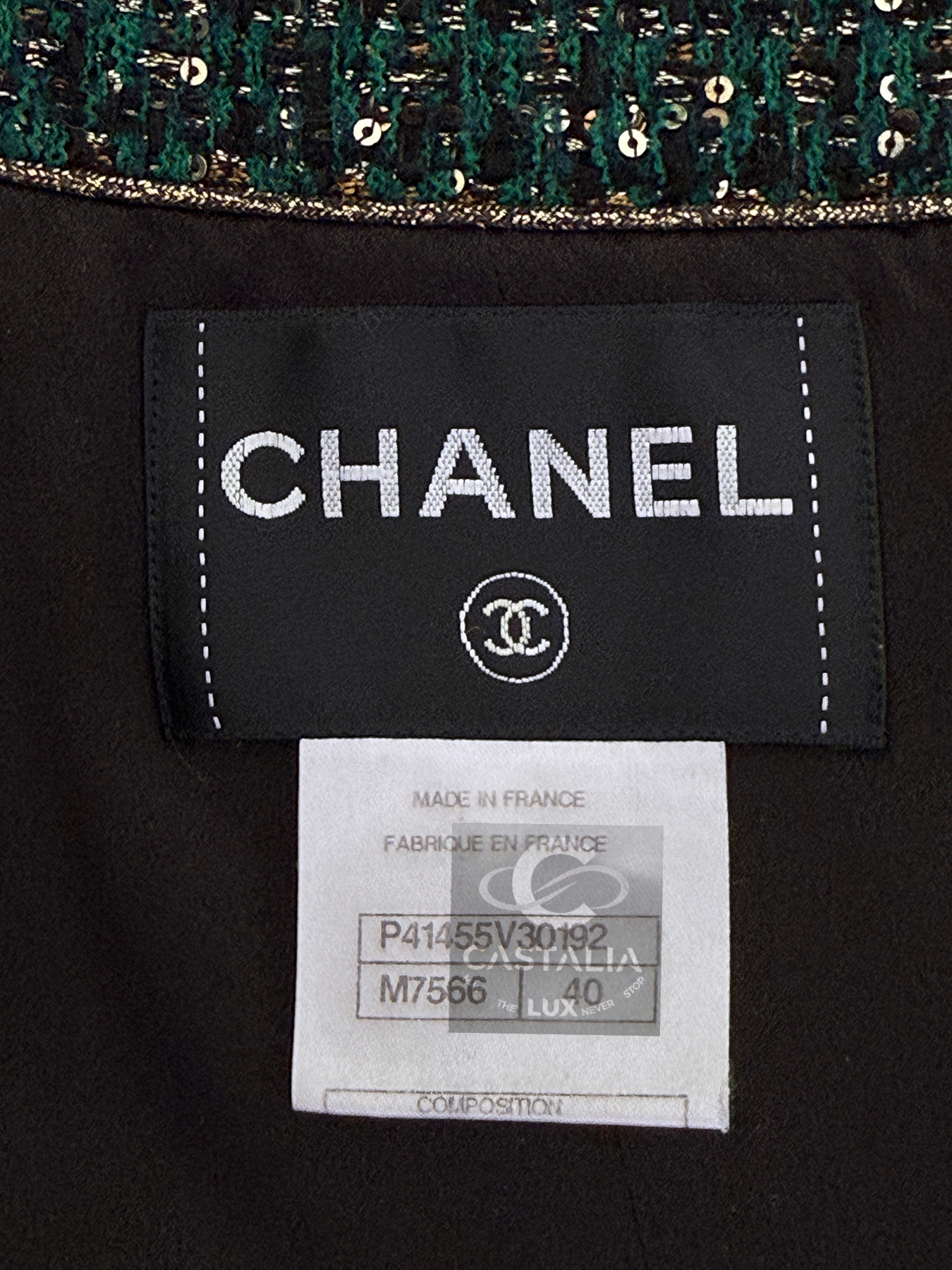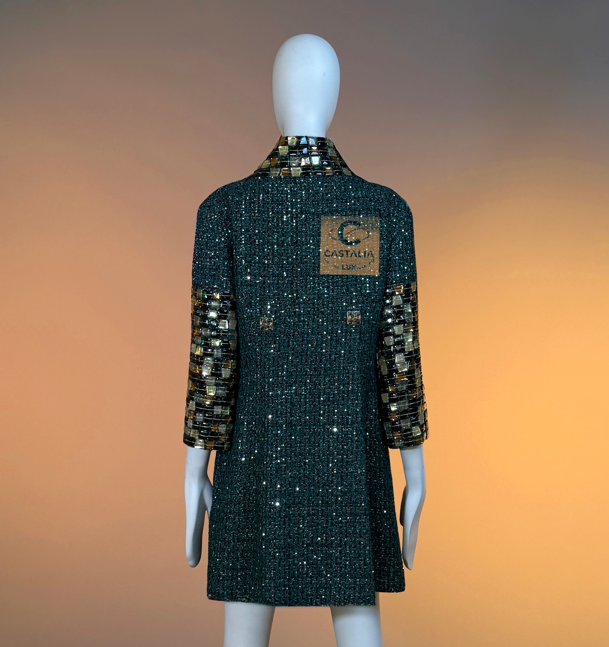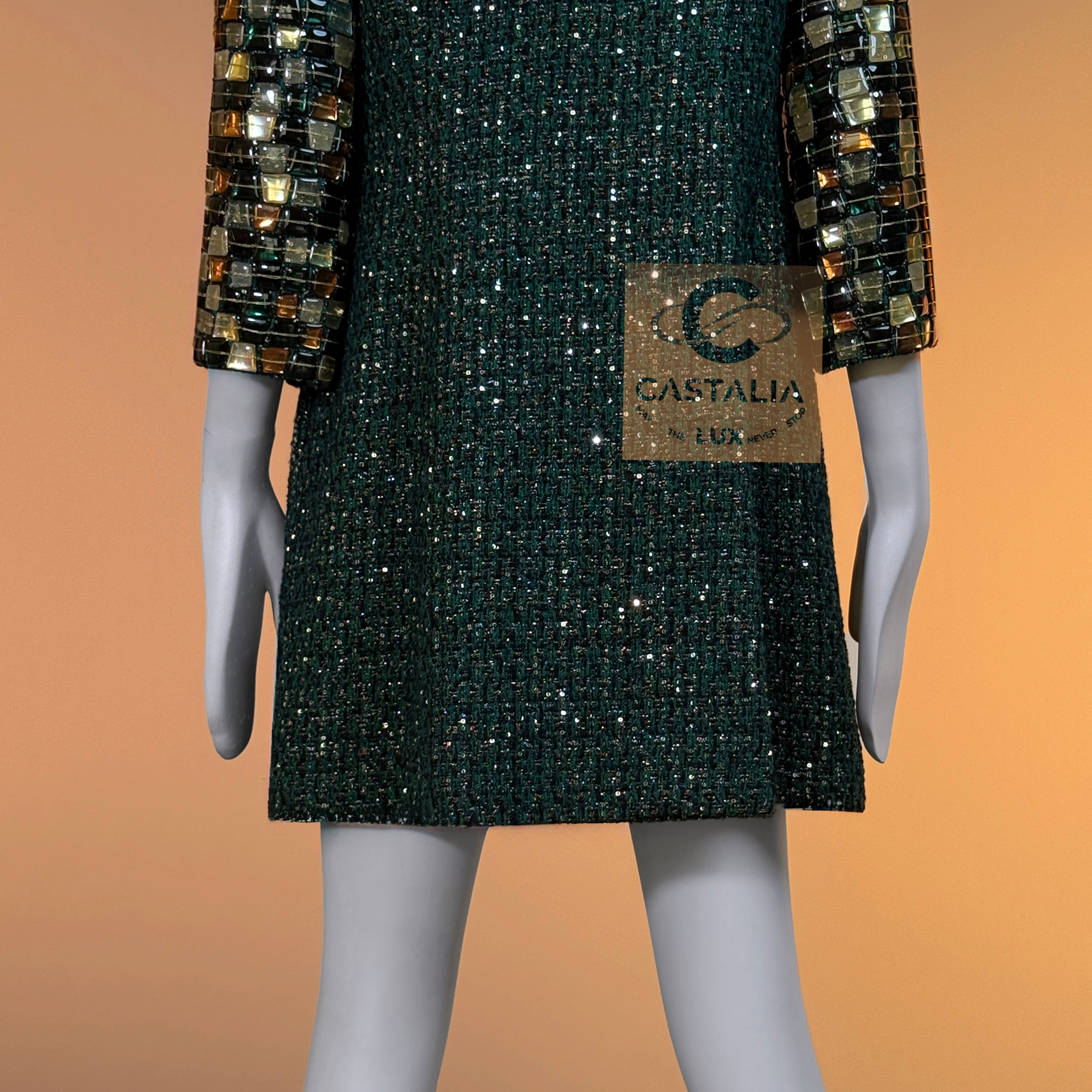 CHANEL · Emerald Jewel Mosaic Tweed Coat with CC Gripoix Buttons — Paris / BYZANCE 2011 Métiers d’Art, Karl Lagerfeld • An acquisition. Not a trend. A relic with investment gravity • — As seen on Princess Caroline of Monaco • Status: museum-level, ultra-collectible (mythology-tier) — A Paris–Byzance relic that does not merely reference Byzantium — it revives it in Chanel’s own language: emerald as sacred stone, sequins as starlit dust, mosaic as imperial border, Gripoix as seal — This is Métiers d’Art at its most absolute: a garment built like a reliquary, meant to be worn rarely, preserved carefully, and read like a cultural objecy // Size mark 40 FR / Condition: never worn // — House Codes · Material Authority — • Masterpiece Lesage tweed in deep emerald — noble, mineral, eternal • Hand-embellished with the tiniest shimmering sequins — a controlled constellation embedded into the weave, radiance as craft — Byzantine Mosaic · Couture as Icon — • Mosaic-like jewel pieces along the collar and sleeves — gilded tesserae translated into wearable border-work • The collar reads like an imperial crown line; the sleeves like bracers — Byzantium rendered in Chanel proportion, never costume, always doctrine — Jewels · Seals · Talisman Hardware — • Art-like Gripoix jewel buttons with CC logos, stone-embellished — closures as relic seals, not decoration — Silhouette · Presence — • A composed coat line that lets the surface speak — structure held in restraint, opulence organized • The embellishment frames the body as an icon is framed: border defining aura • Tonal silk lining inside — private completion, where drape and comfort resolve into certainty.