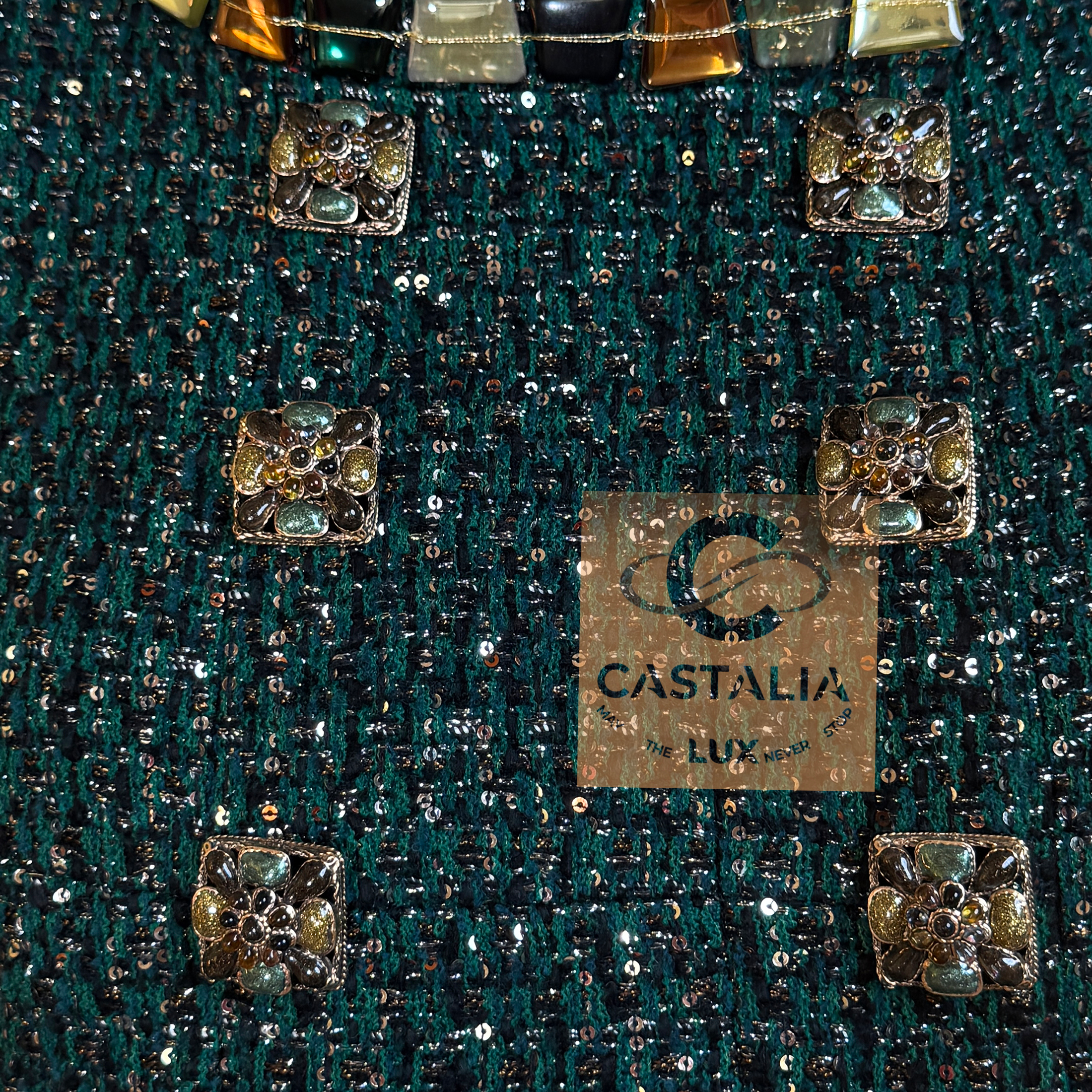 • Art-like Gripoix jewel buttons with CC logos, stone-embellished — closures as relic seals, not decoration