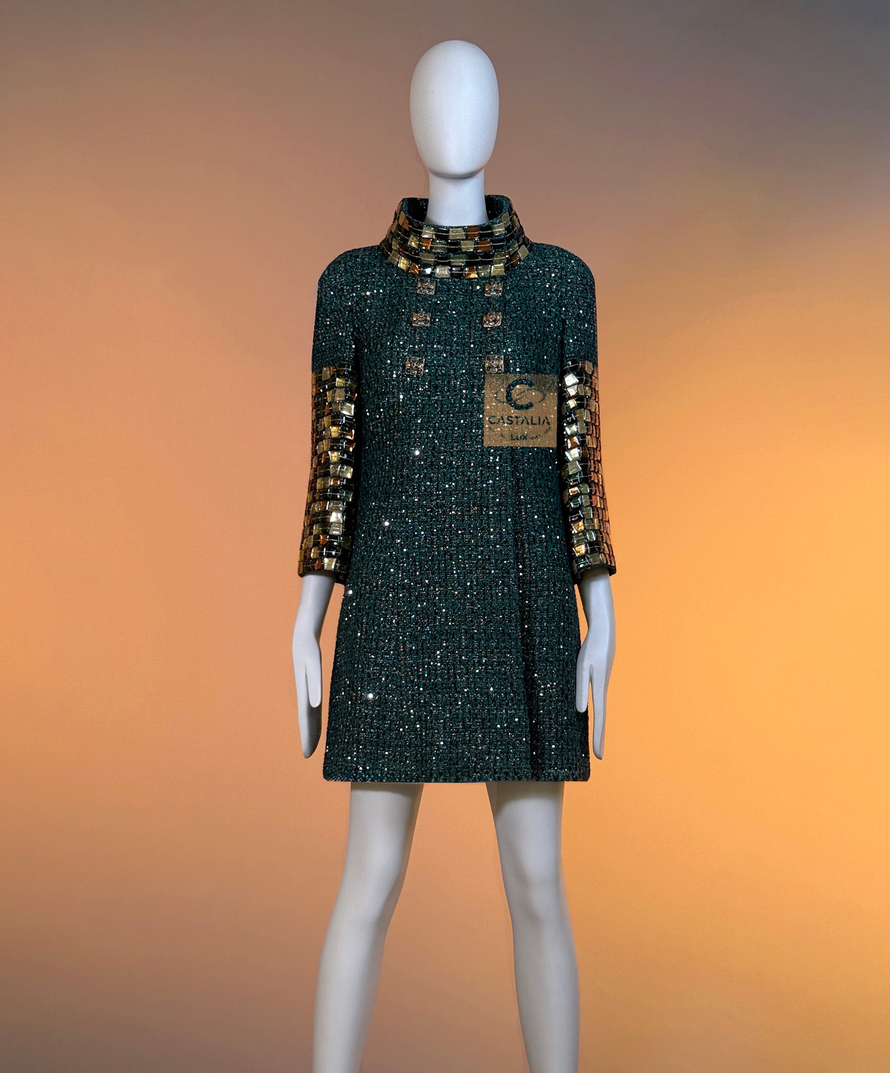 • Mosaic-like jewel pieces along the collar and sleeves — gilded tesserae translated into wearable border-work