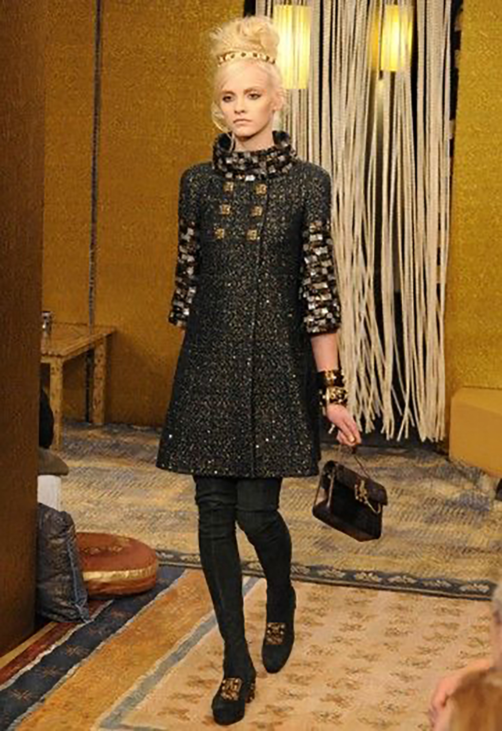 • The collar reads like an imperial crown line; the sleeves like bracers — Byzantium rendered in Chanel proportion, never costume, always doctrine