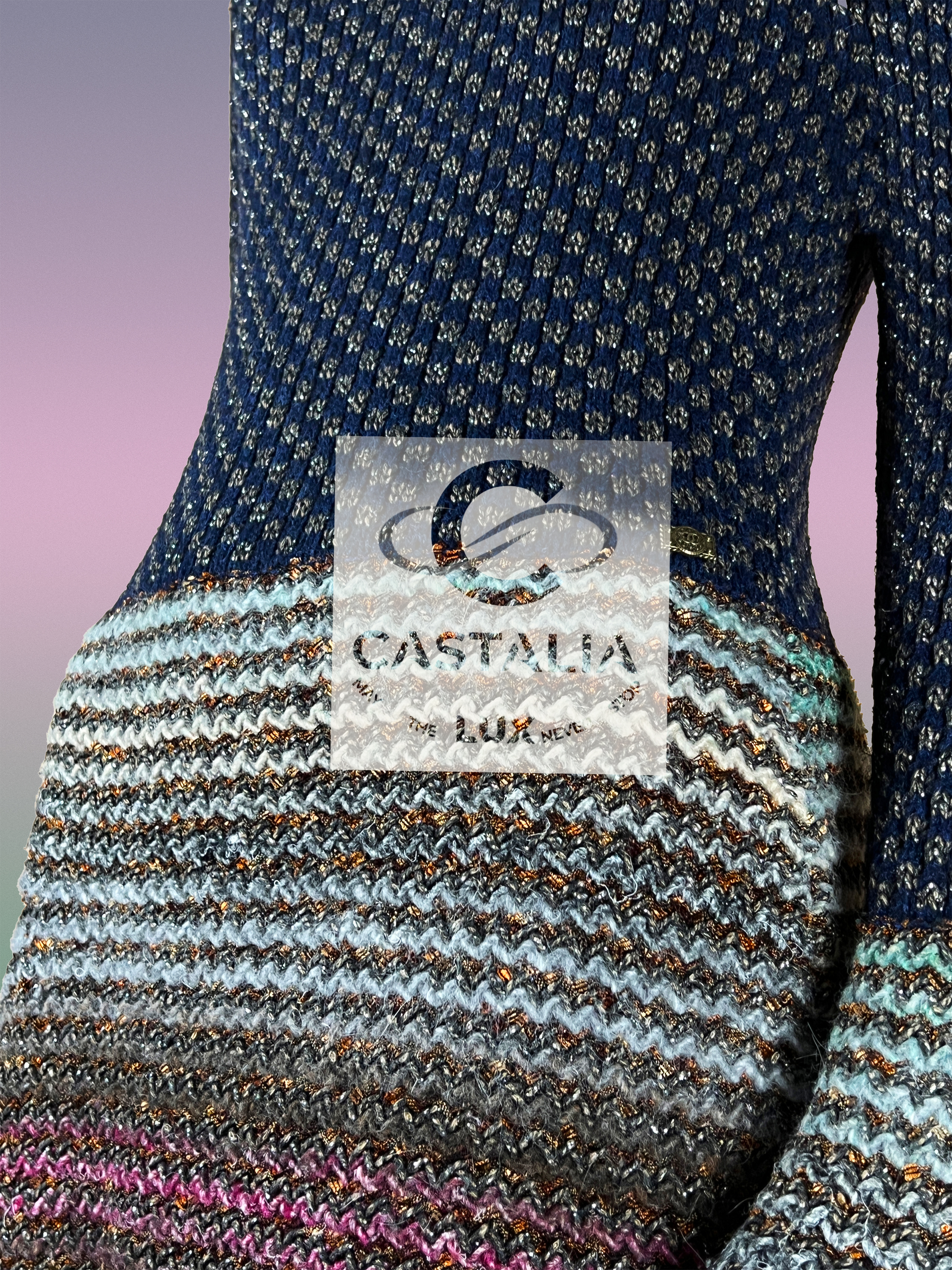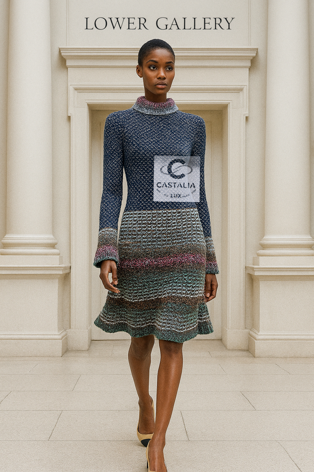 — silhouette transitions from a delicately patterned bodice to a hypnotic flare hem — each fiber infused with subtle Lurex shimmer, like whispered echoes of ancient mosaics