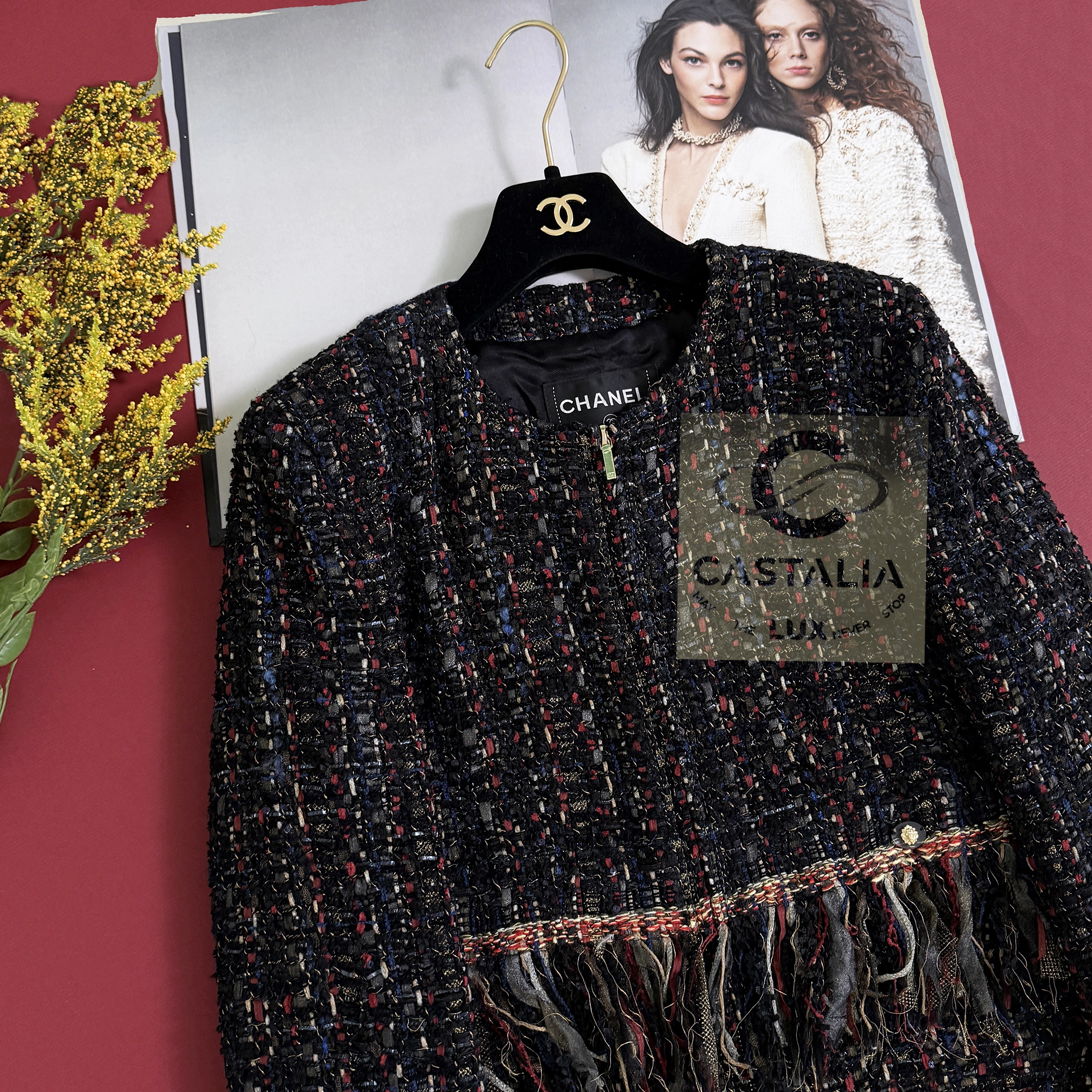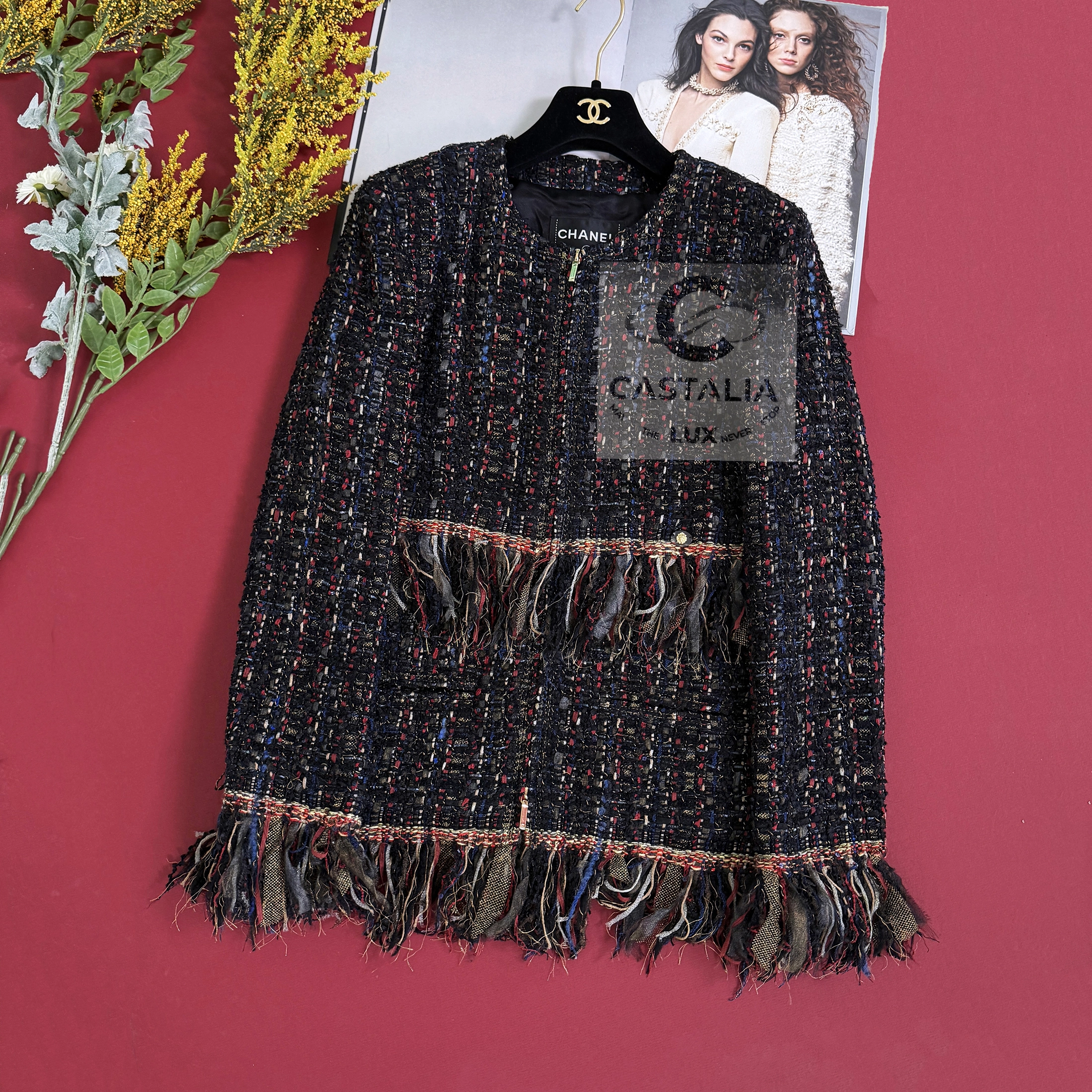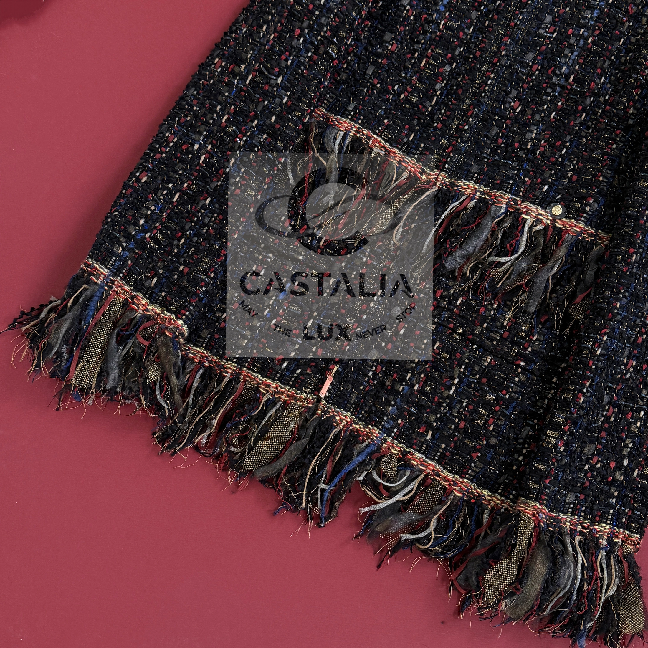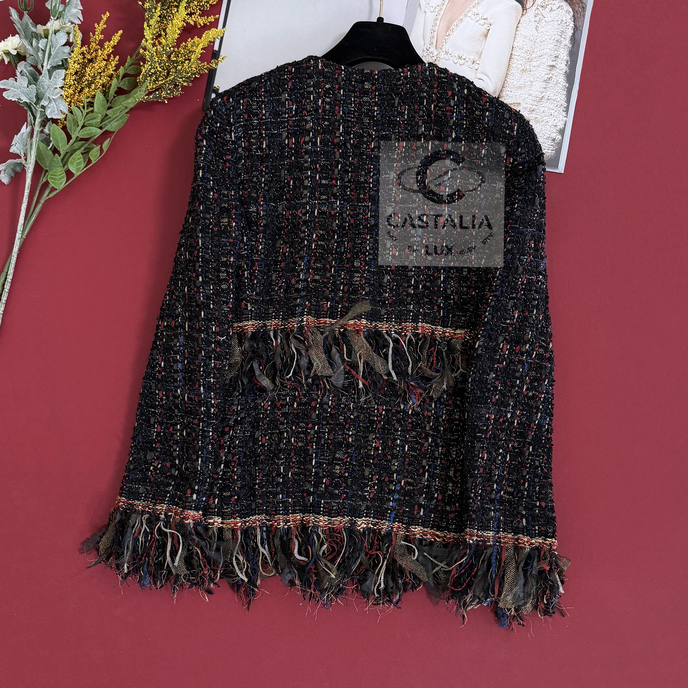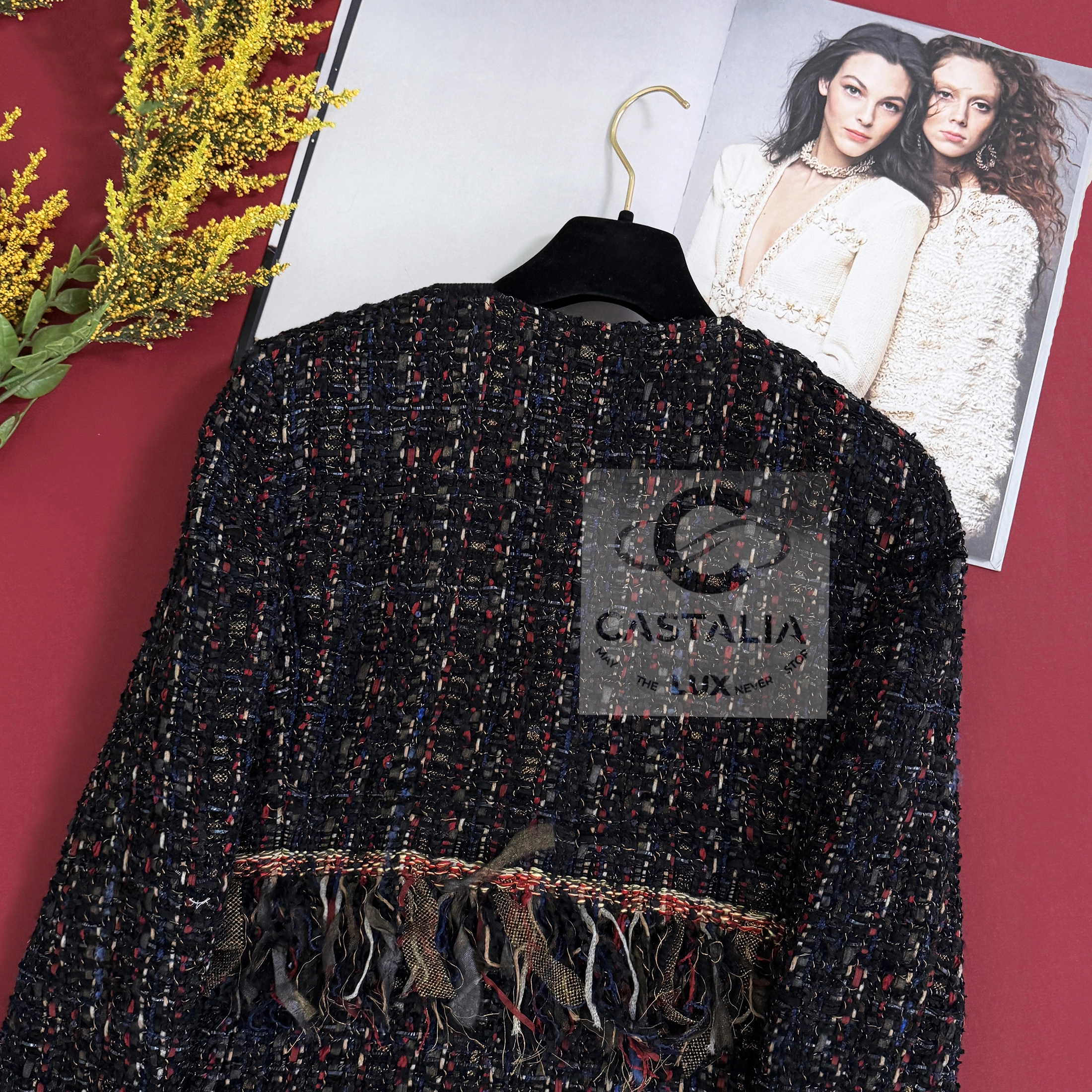 — Woven from the most precious Lesage tweed, its palette evokes a painterly composition of rich nocturnes and chromatic bursts, a textile symphony echoing the bohemian spirit of late-night salons and gilded ballrooms