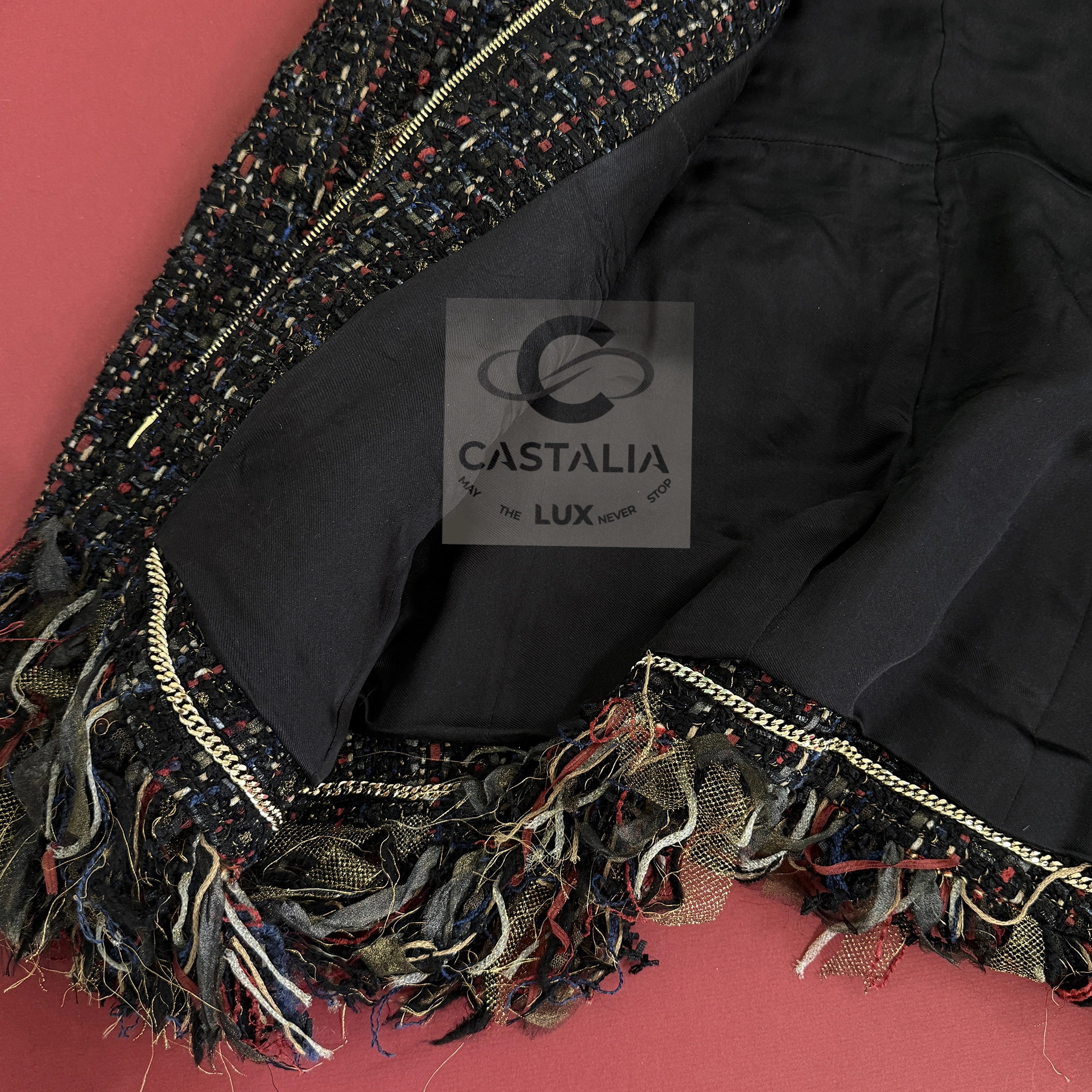 — Inside, the jacket is finished with tonal silk lining and the iconic weighted chain, anchoring its ethereal surface to
