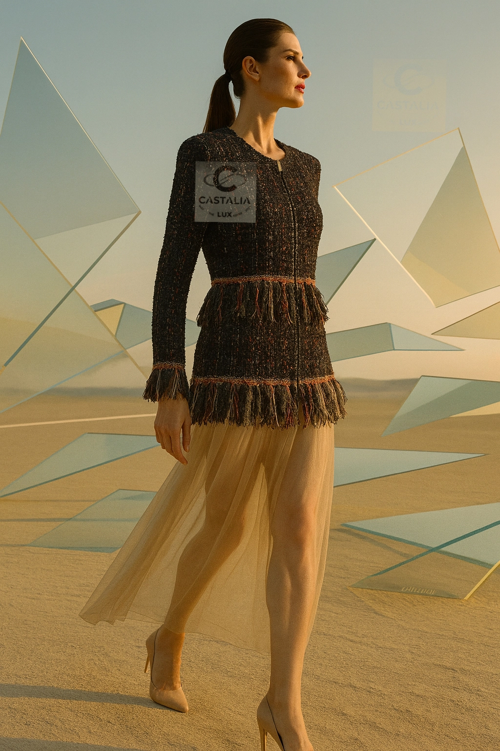 — Along the waist and hem, fringe accents unravel like poetic brushstrokes, simultaneously disciplined and wild — a celebration of impermanence within structure.