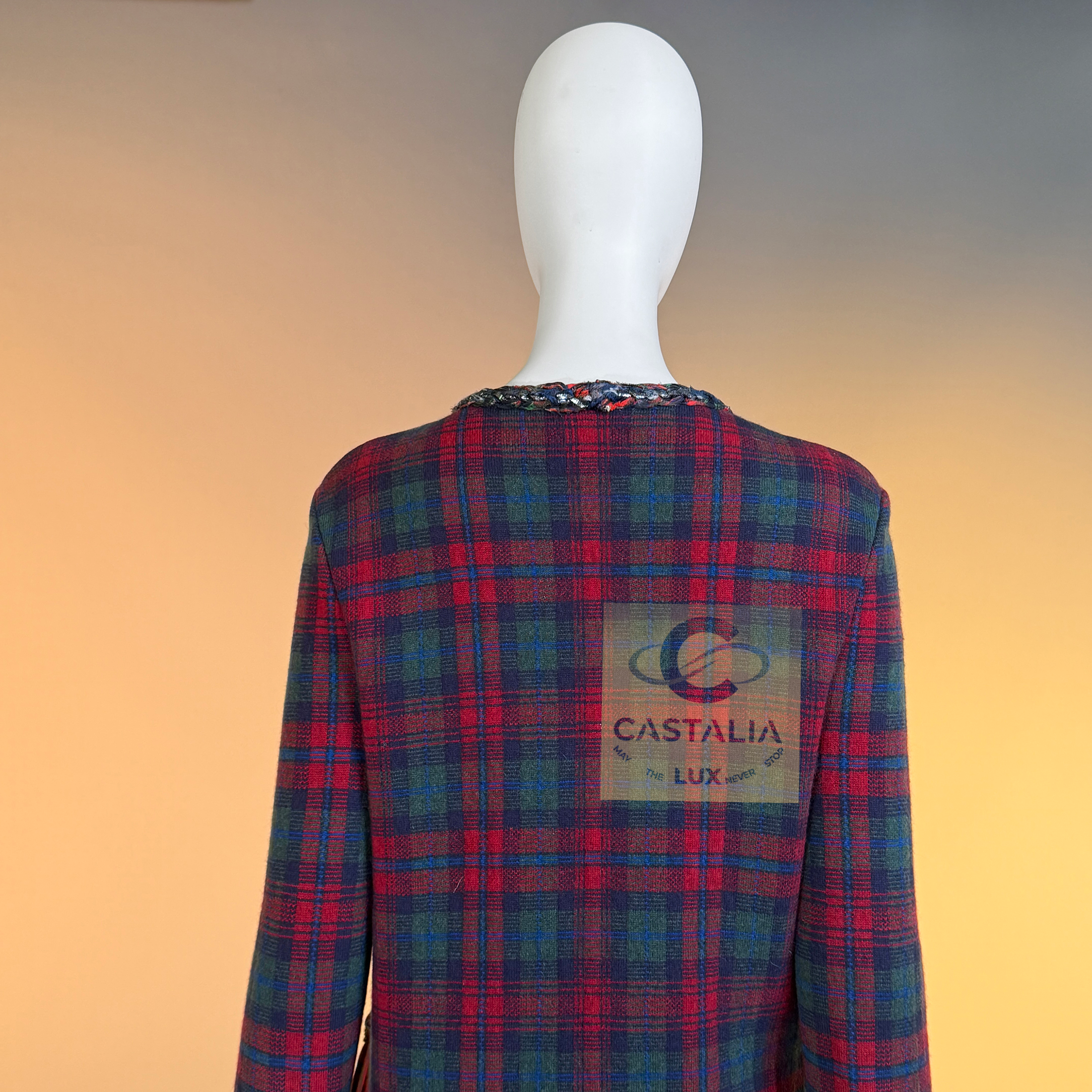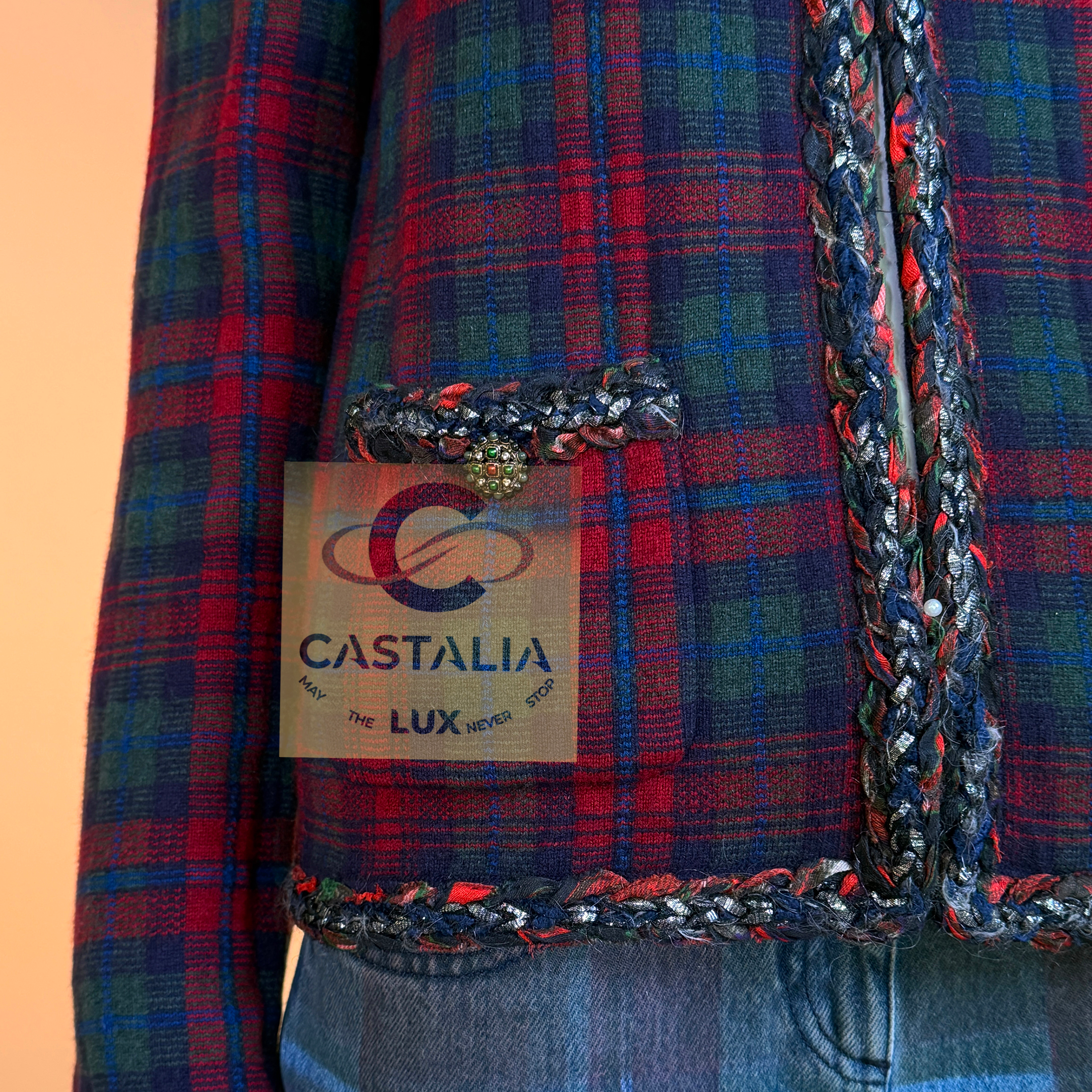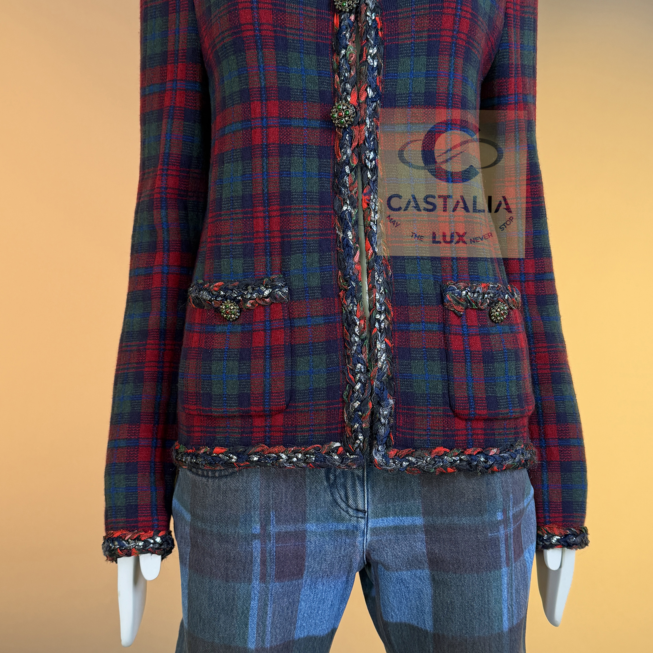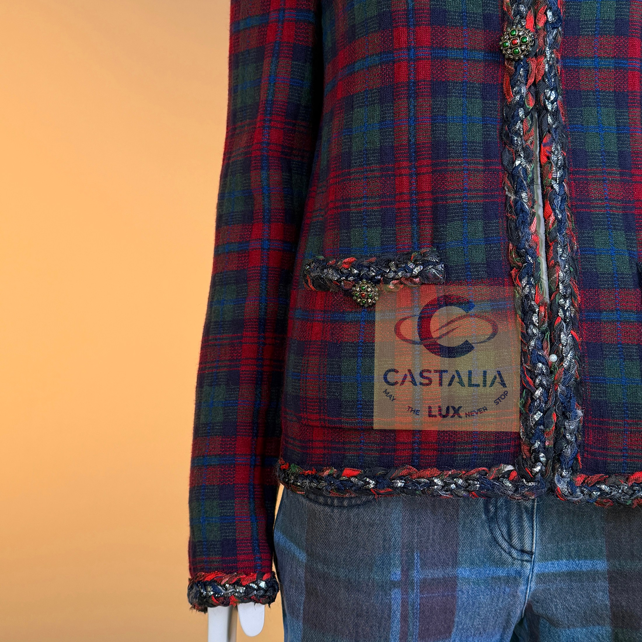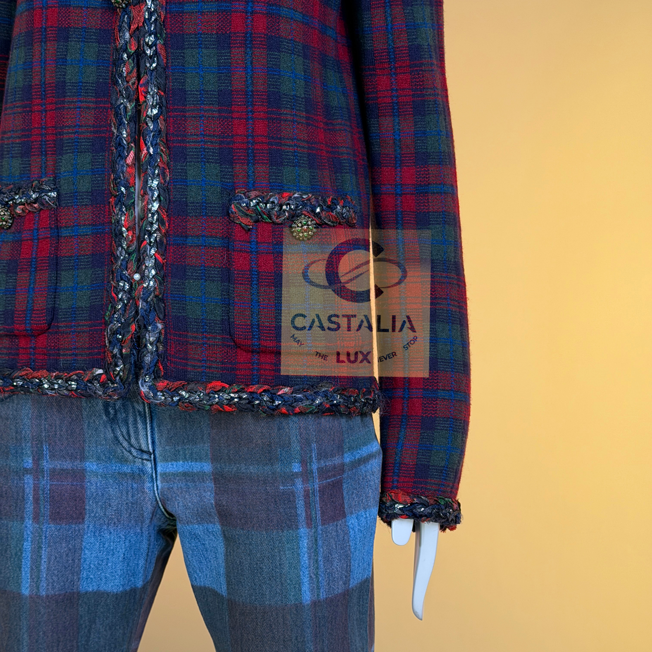~ From the legendary Paris / EDINBURGH 2013 Métiers d’Art collection under Karl Lagerfeld, this tartan wool jacket is not merely a garment — it is the axis upon which the entire collection turned — noted in AD Campaign and on numerous actors of modern Myth like Miranda Kerr // Size mark 36 FR / Condition: Kept without using // — Woven in deep crimson and blue-black green, the plaid evokes windswept highlands at twilight — heritage in motion — art-like Gripoix jewel buttons that act as talismans: glinting at the cuffs and front pockets like emblems of ritual : Emerald, ruby, and citrine tones flicker from the molten glass, each setting a quiet invocation — Its signature: the braided trim — an intricate symphony of interwoven threads and velvet, coursing along the collar, front placket, hem, and cuffs like ancient borders rewritten in Couture