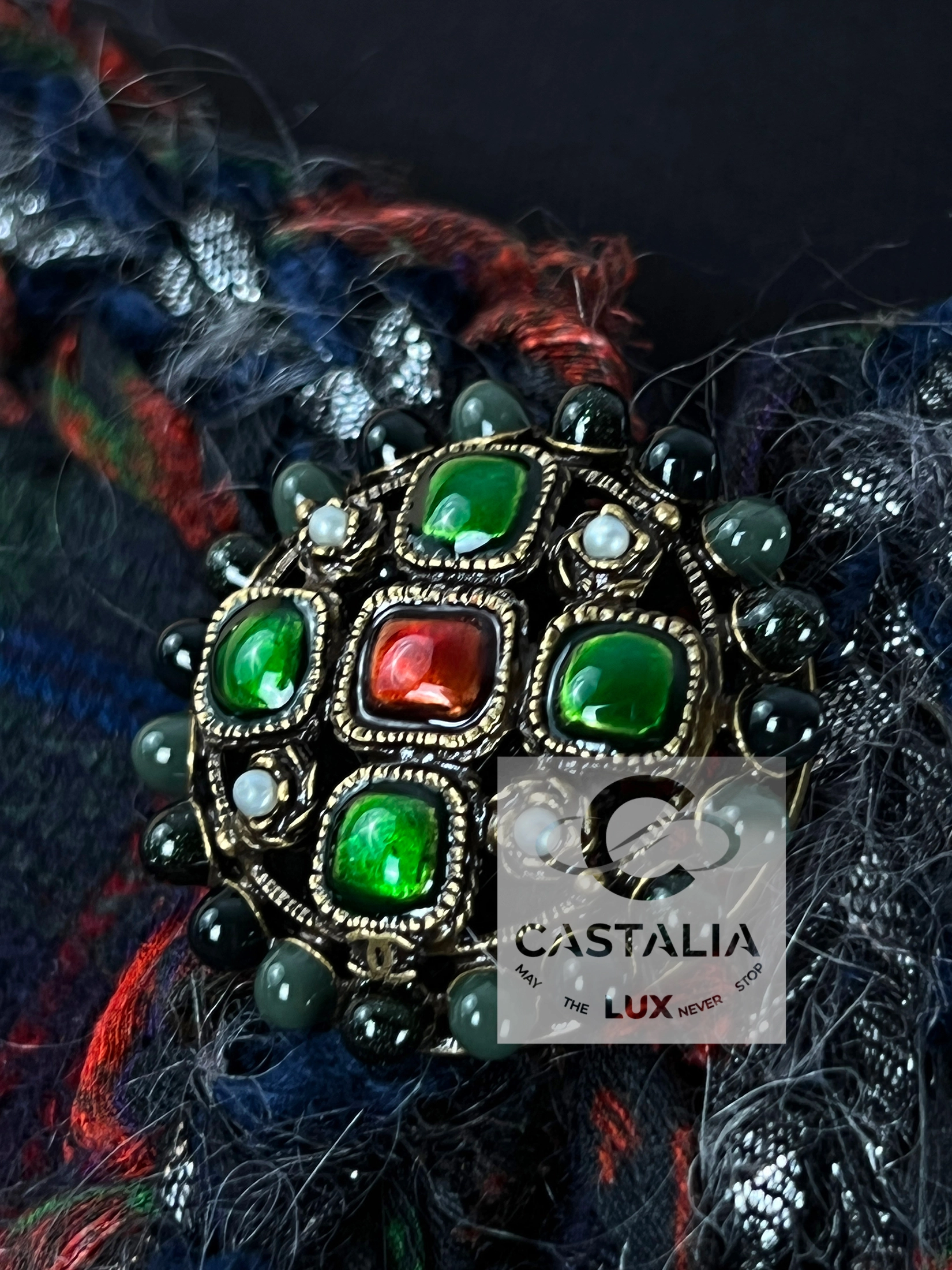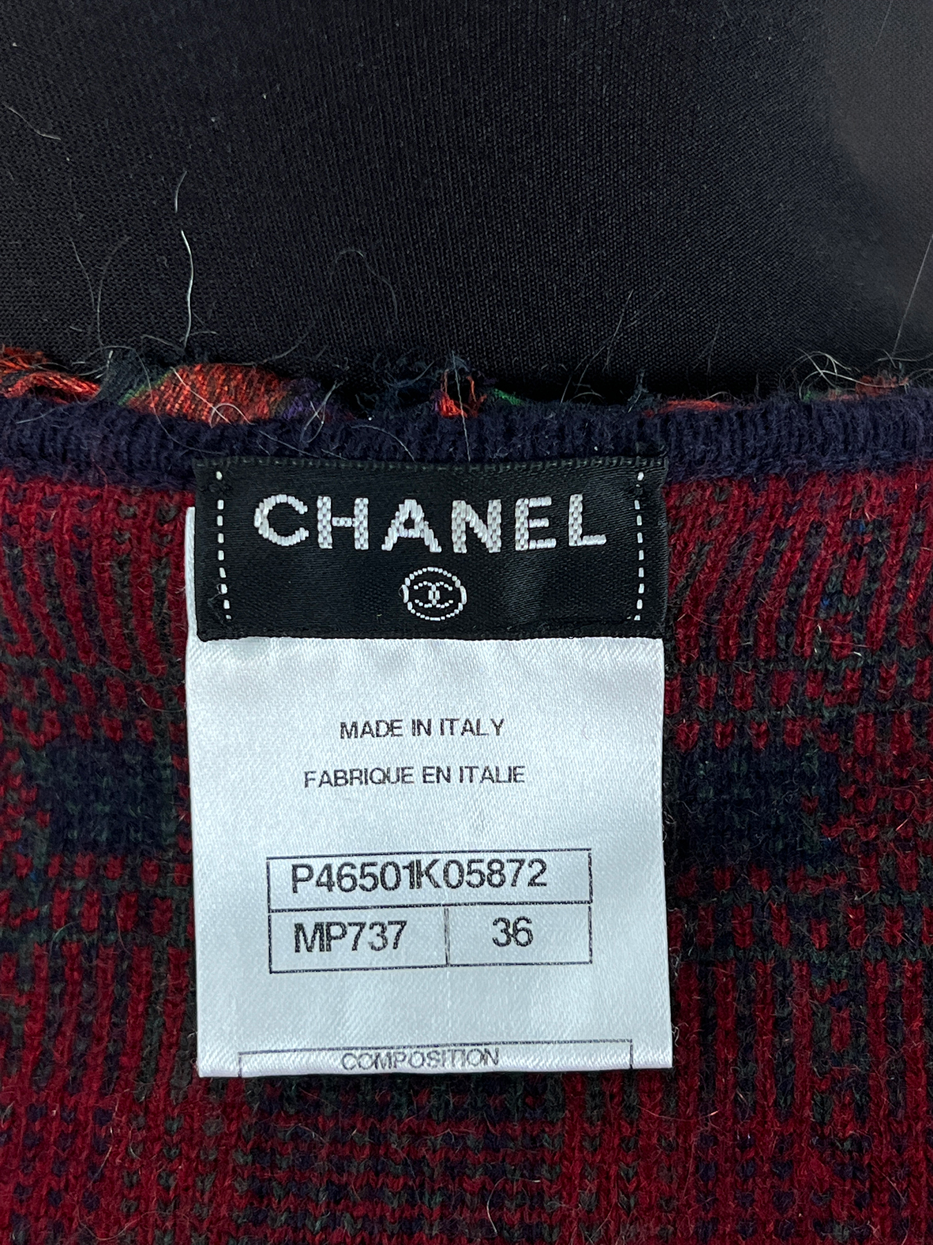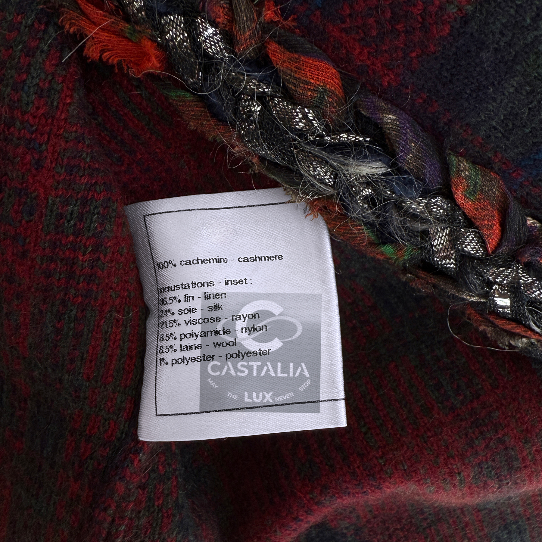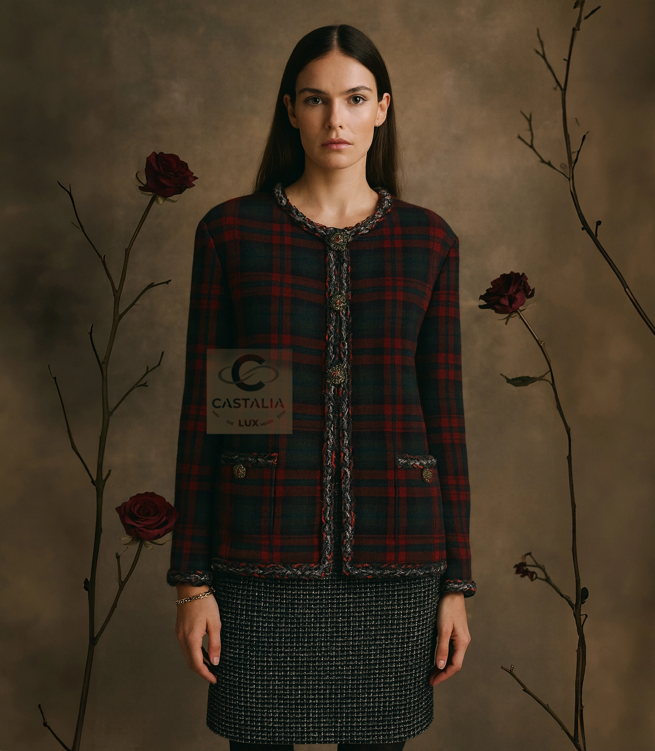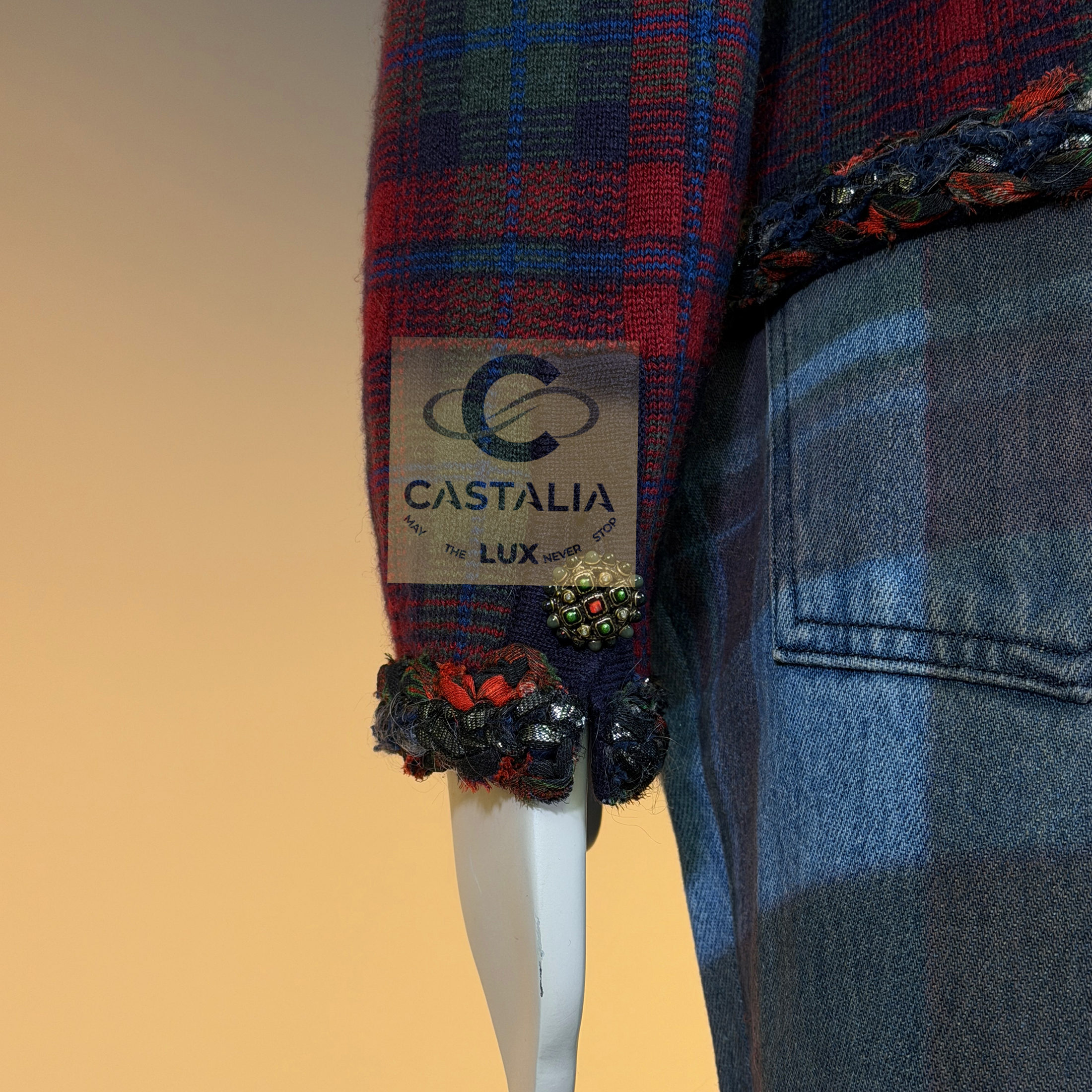~ From the legendary Paris / EDINBURGH 2013 Métiers d’Art collection under Karl Lagerfeld, this tartan wool jacket is not merely a garment — it is the axis upon which the entire collection turned — noted in AD Campaign and on numerous actors of modern Myth like Miranda Kerr // Size mark 36 FR / Condition: Kept without using // — Woven in deep crimson and blue-black green, the plaid evokes windswept highlands at twilight — heritage in motion — art-like Gripoix jewel buttons that act as talismans: glinting at the cuffs and front pockets like emblems of ritual : Emerald, ruby, and citrine tones flicker from the molten glass, each setting a quiet invocation — Its signature: the braided trim — an intricate symphony of interwoven threads and velvet, coursing along the collar, front placket, hem, and cuffs like ancient borders rewritten in Couture