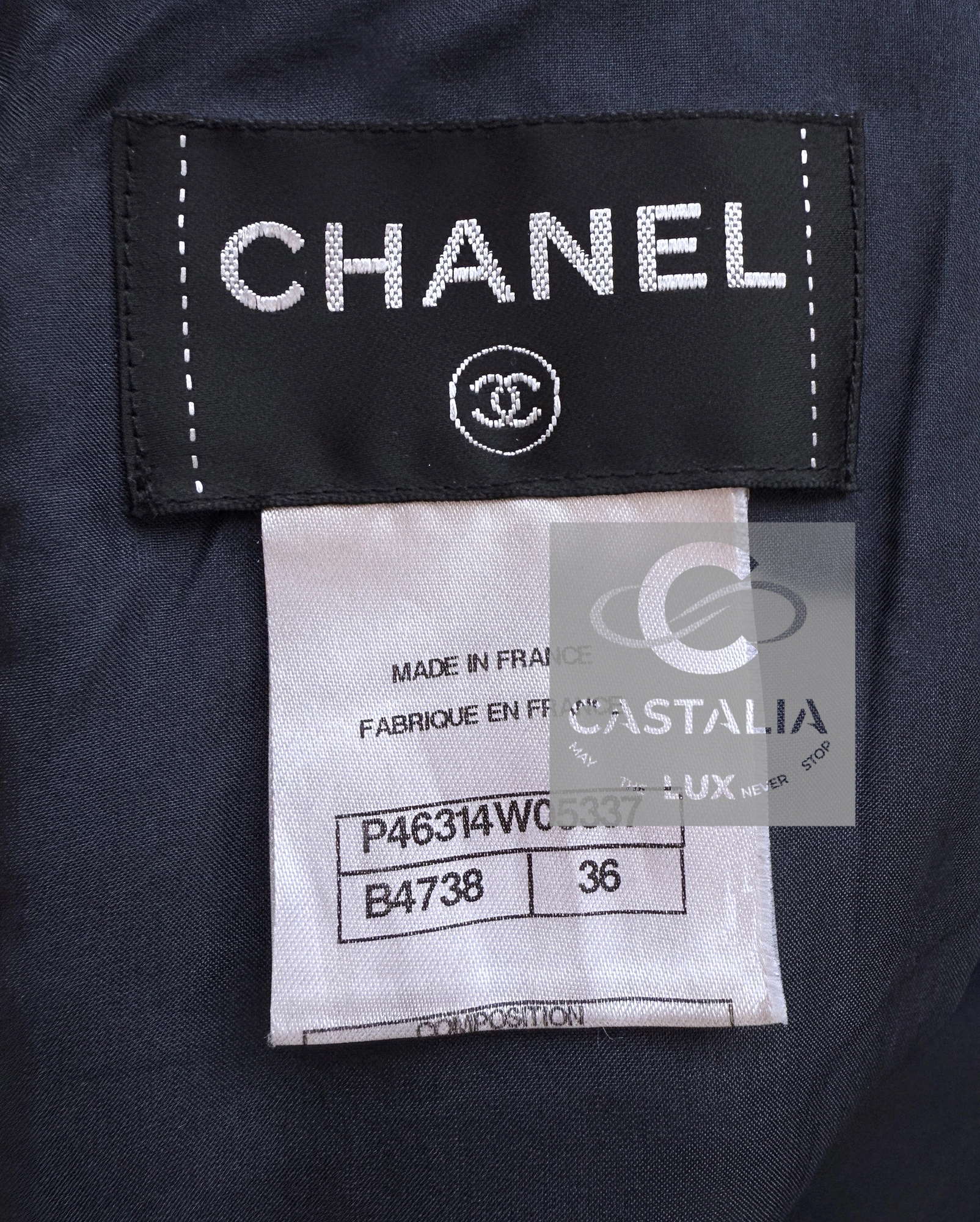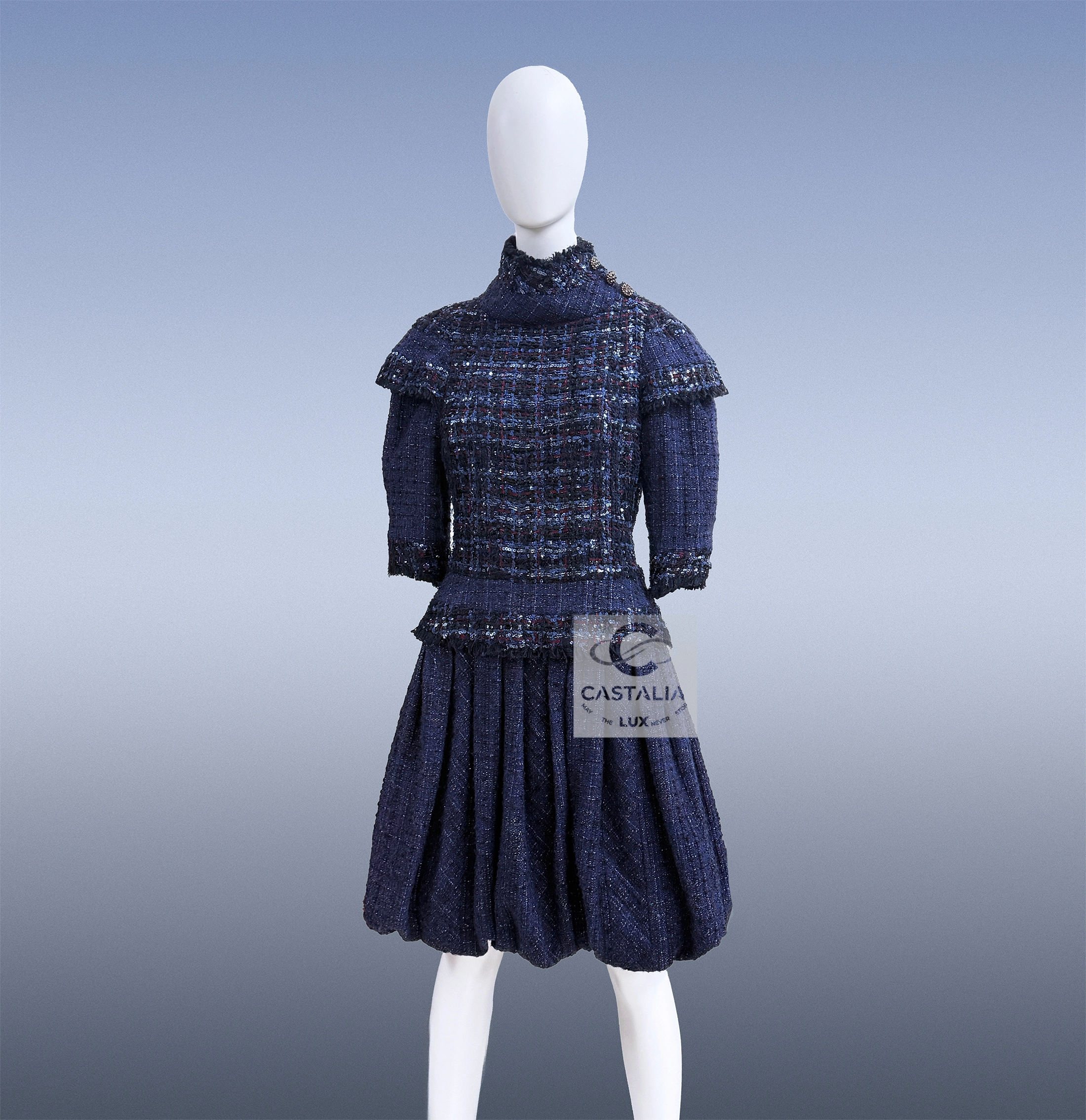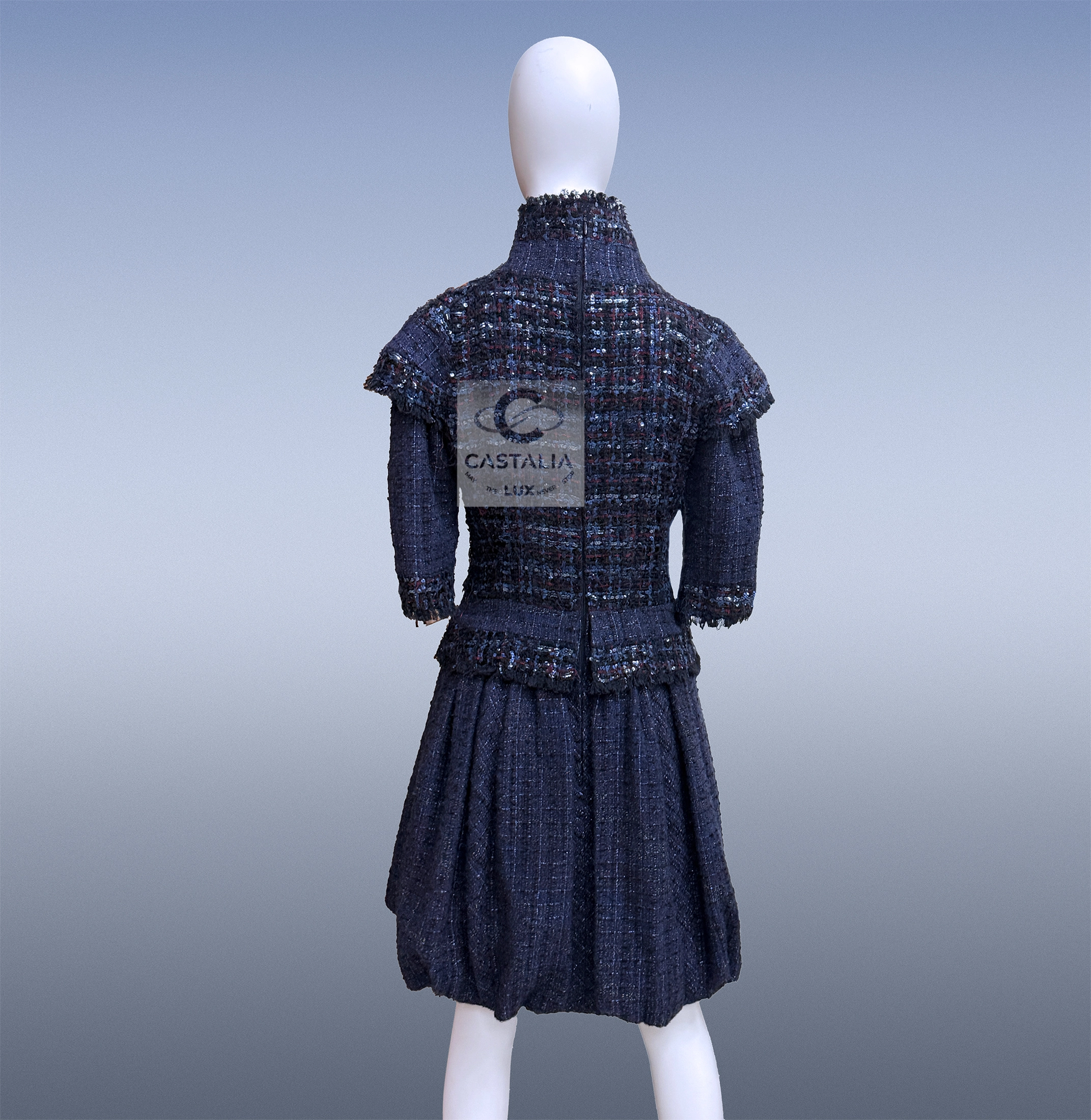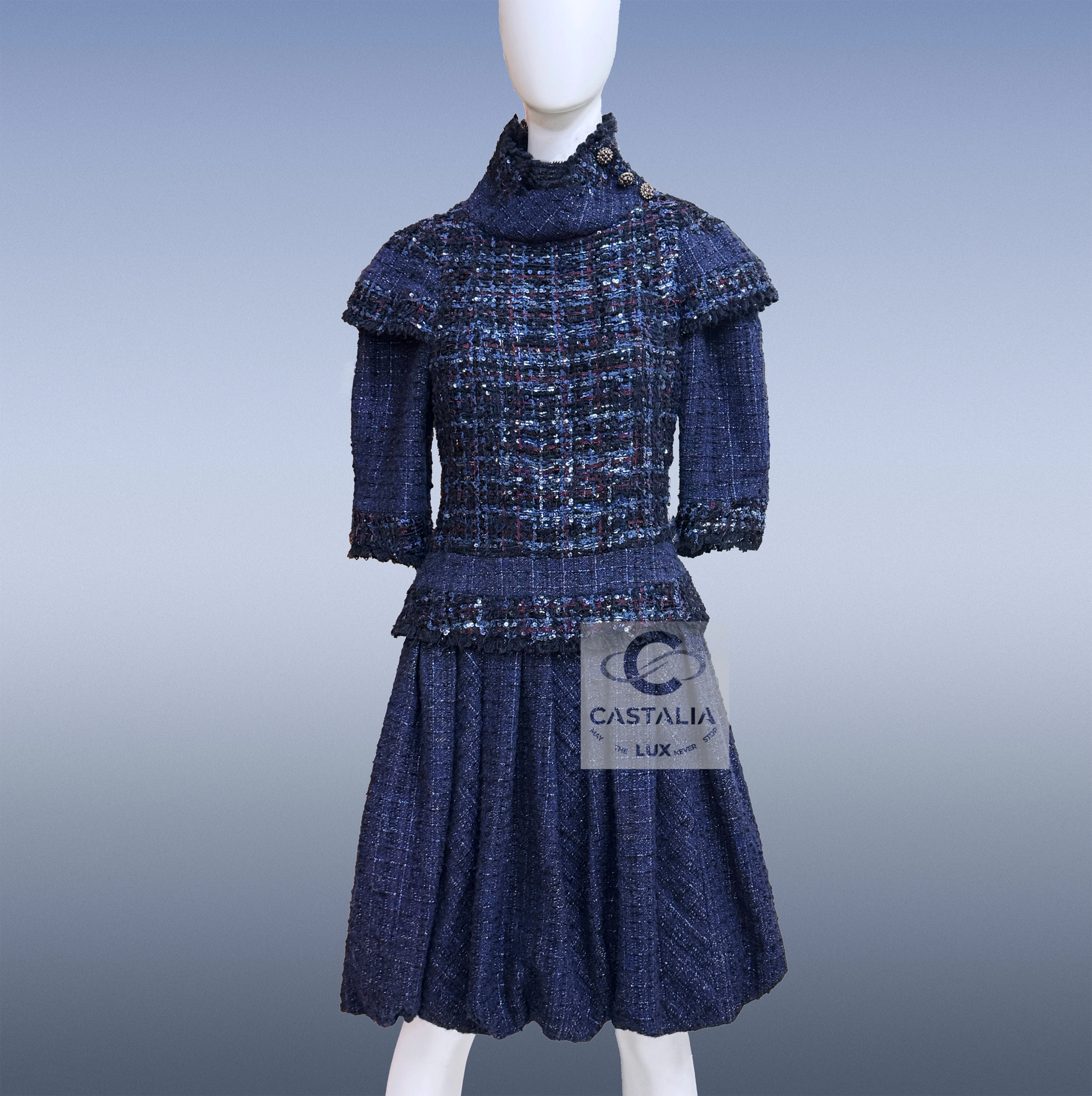 CHANEL Paris / Edinburgh 2013 Haute Couture Tweed Dress A Mastery Relic of the House — Museum-Level Artefact ~Estimated boutique value: over $16,000. A sacred text in tweed — written not with words, but with thread, light, and lineage. // Size mark 36 FR / Condition: never worn // — It is vestment, relic, and ritual combined — wrought in navy tweed with a subtle tartan embossing that speaks in quiet Highland codes. — At the collar’s side, a trio of Gripoix CC jewel buttons gleam like royal insignia — each one cast, set, and placed by hand — upper bodice is adorned with hand-applied embellishment that flickers between armor and embroidery, evoking sacred craftsmanship more than ornament — The skirt falls in architectural gathers, its weight perfectly measured — The entire form is lined in silk — the final mark of haute couture’s inner sanctum.