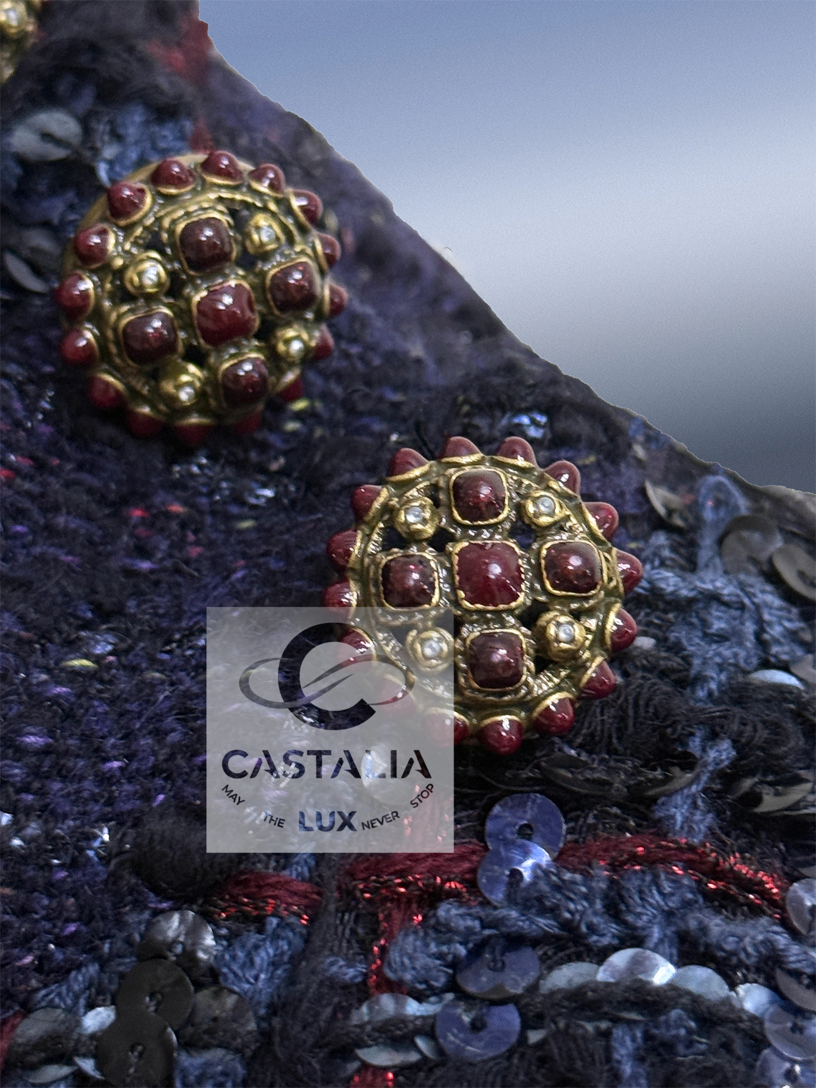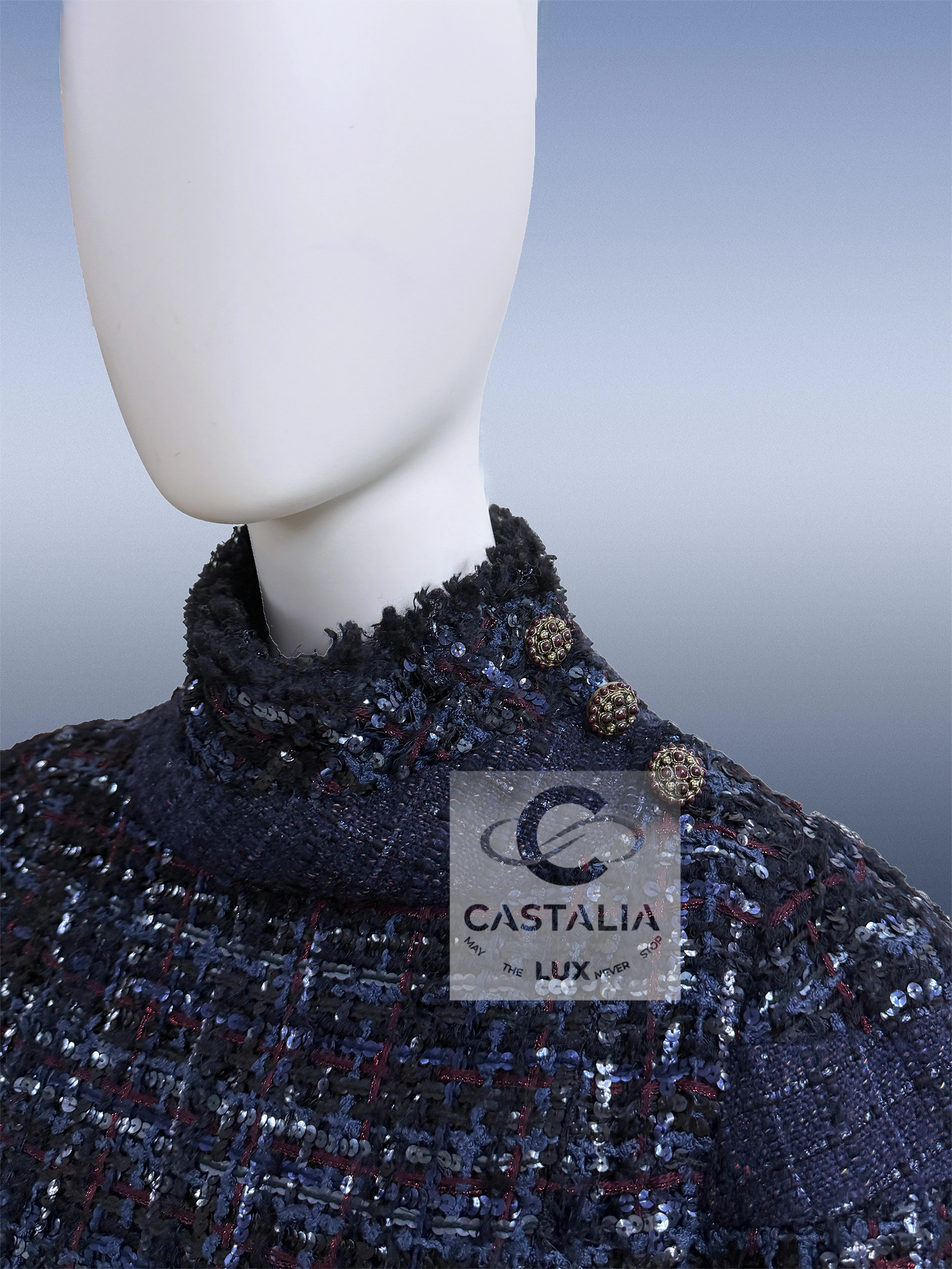 — At the collar’s side, a trio of Gripoix CC jewel buttons gleam like royal insignia — each one cast, set, and placed by hand
