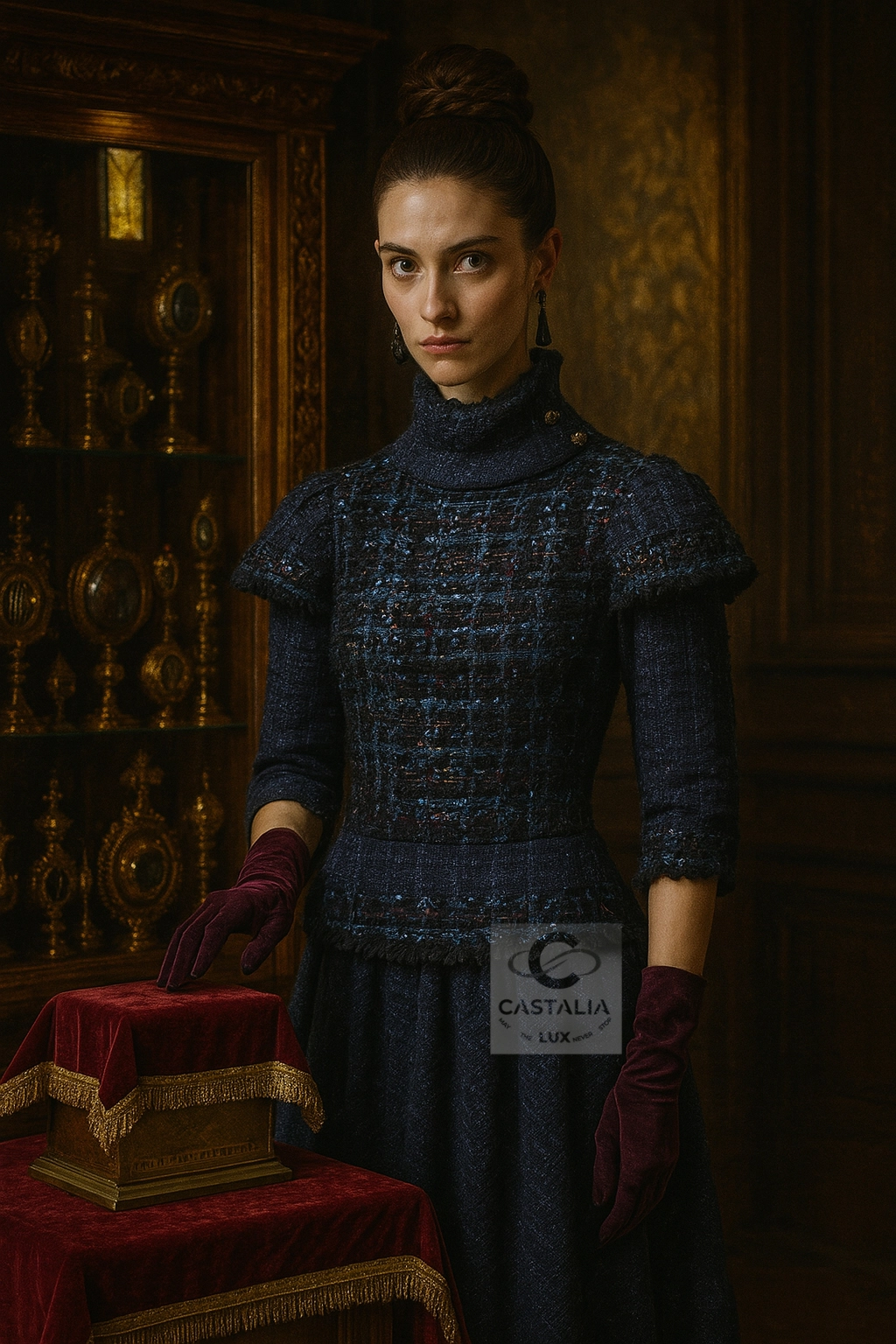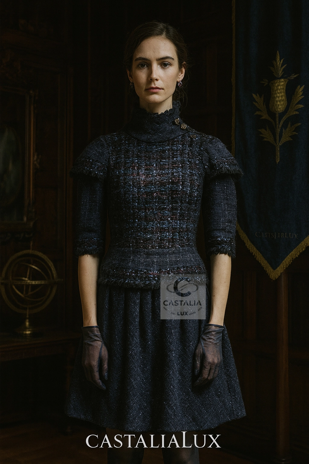 — It is vestment, relic, and ritual combined — wrought in navy tweed with a subtle tartan embossing that speaks in quiet Highland codes.