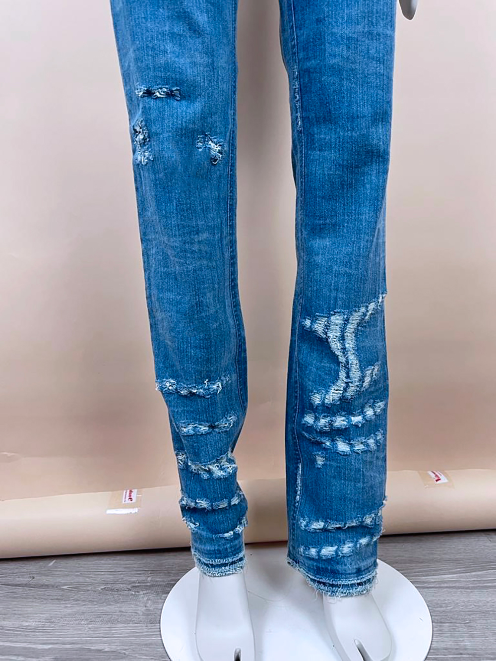 — Cut in classic blue, the denim bears deliberate scars of distress and washes of time, as if it has weathered both underground clubs and aristocratic salons