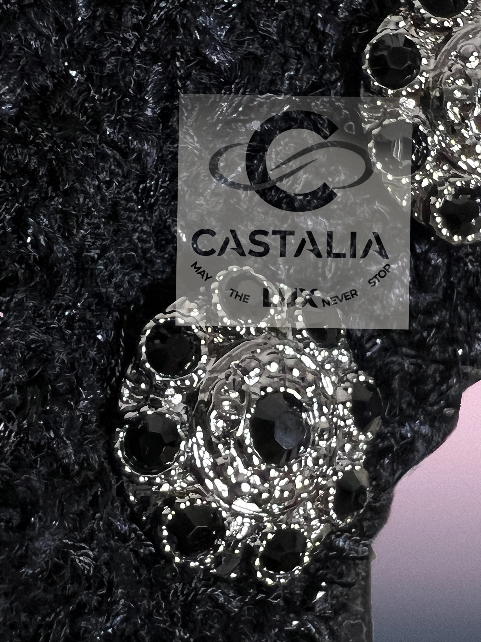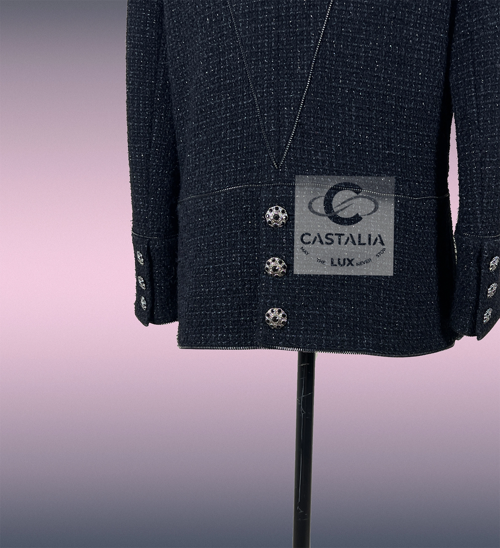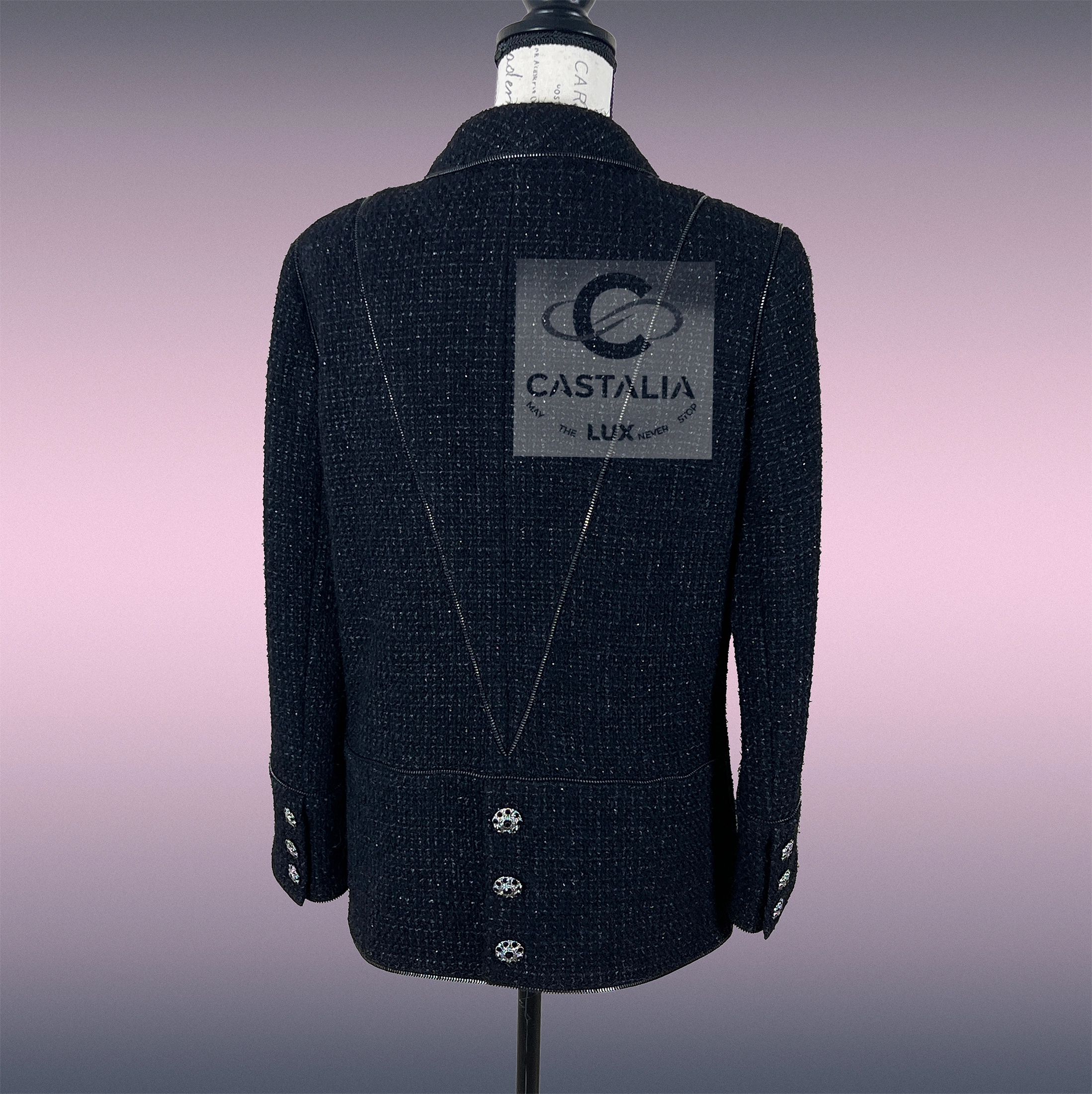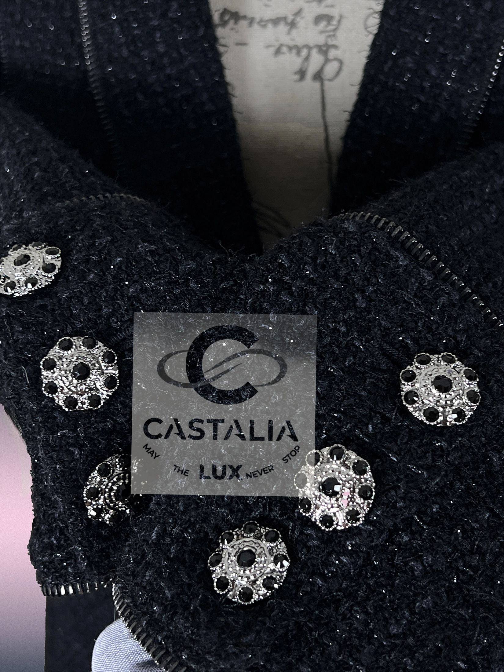 — gleam jewel-encrusted CC logo buttons, stones catching the light like forbidden stars — ornaments that transmute the jacket into talisman