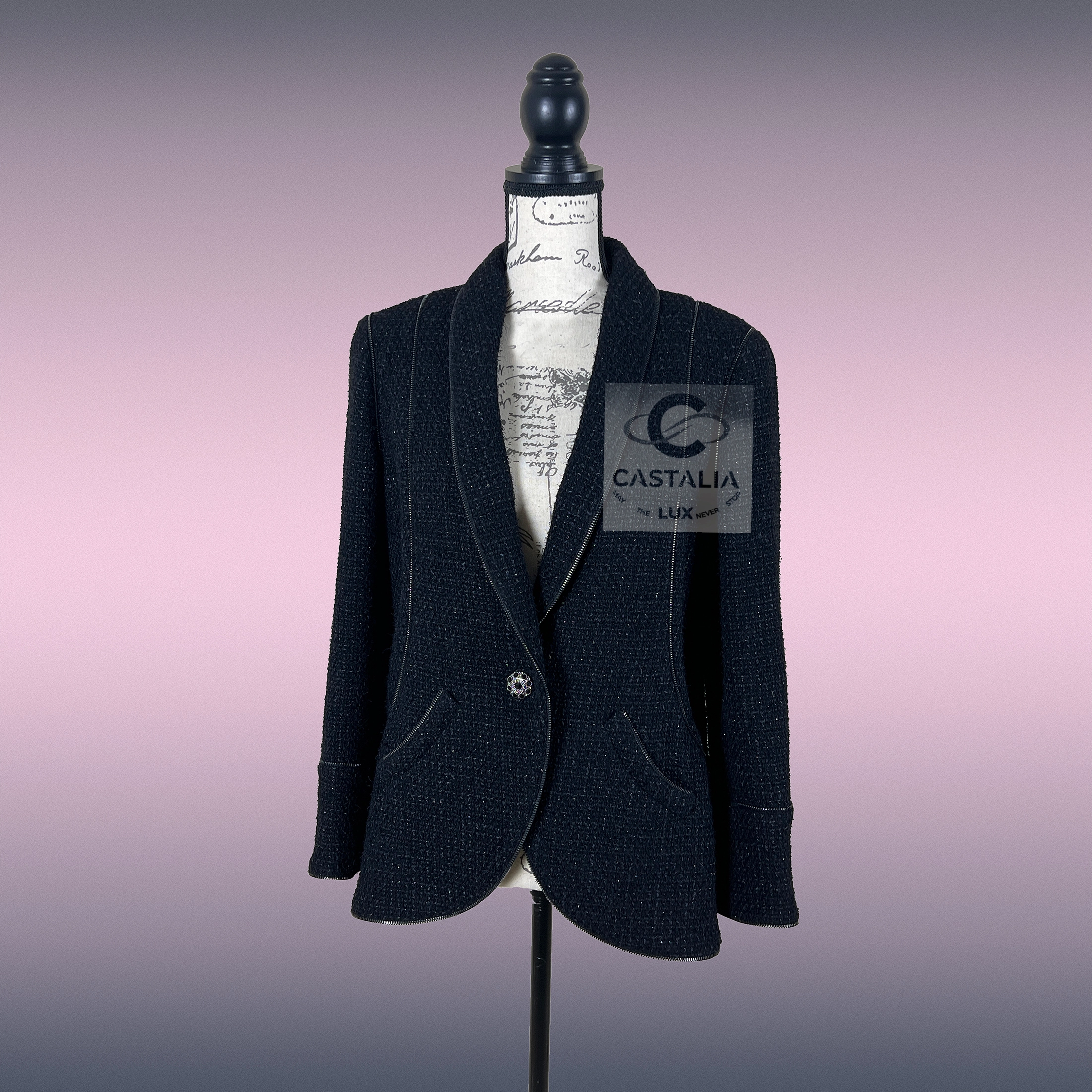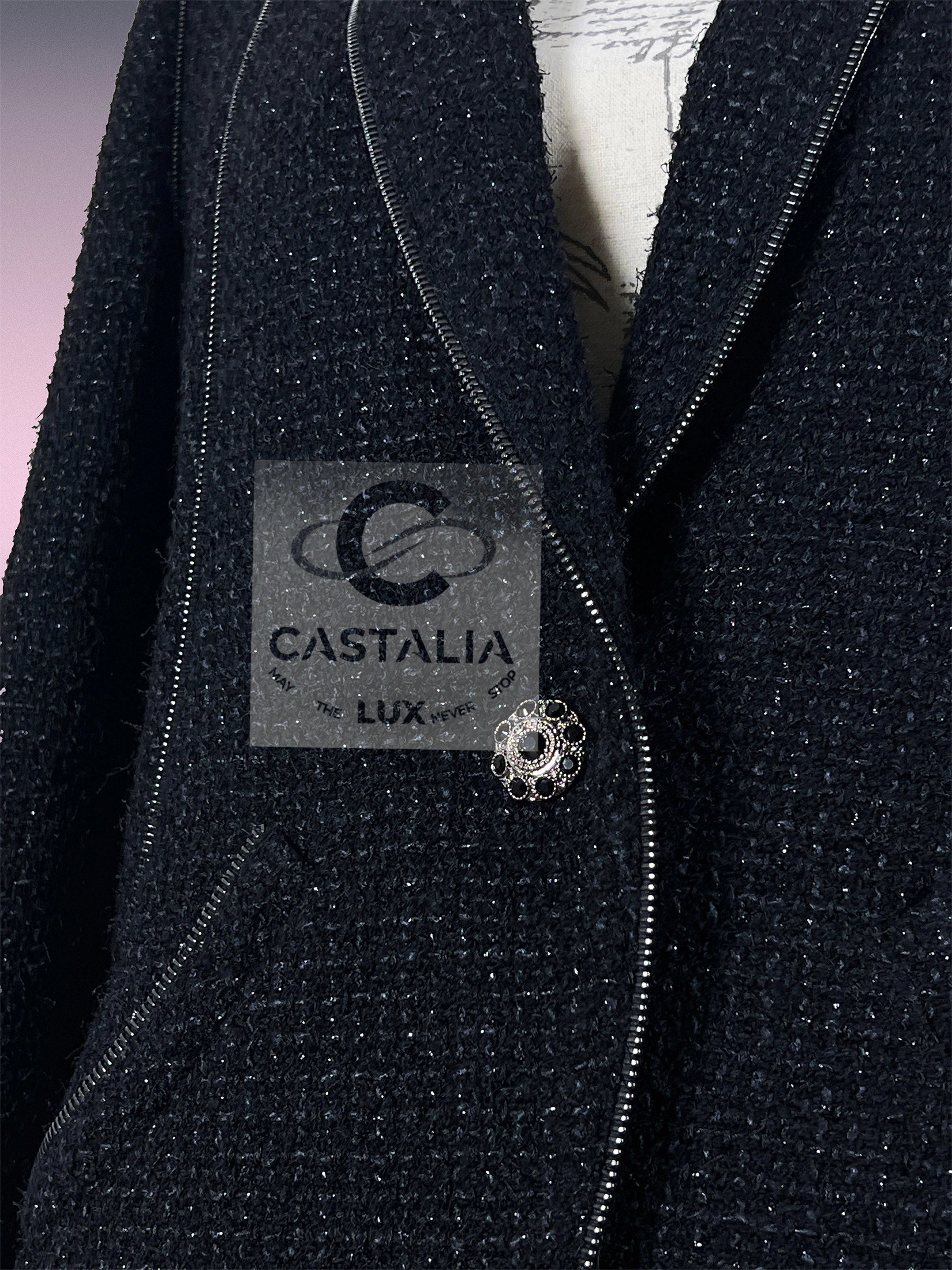 A sartorial CHANEL relic of rebellion and Rock & Roll Tweed — this masterpiece emerges from the storied Paris / LONDON Métiers d’Art collection, conceived under the immortal hand of Karl Lagerfeld A metaphysical armor, oscillating between elegance and anarchy, between Chanel’s eternal codes and the untamed spirit of rock. // Size mark 40 FR / Condition: never worn // — Forged in precious Lesage tweed, its charcoal-black weave glimmers with a subtle shimmer, like night asphalt kissed by city lights — gleam jewel-encrusted CC logo buttons, stones catching the light like forbidden stars — ornaments that transmute the jacket into talisman — Along its silhouette, punk-tinged zipper accents slash through tradition, a deliberate gesture of rock & roll defiance stitched into Couture — Inside, a lining of liquid-black silk envelopes the wearer in clandestine luxury, echoing the subterranean clubs of London where fashion became rebellion