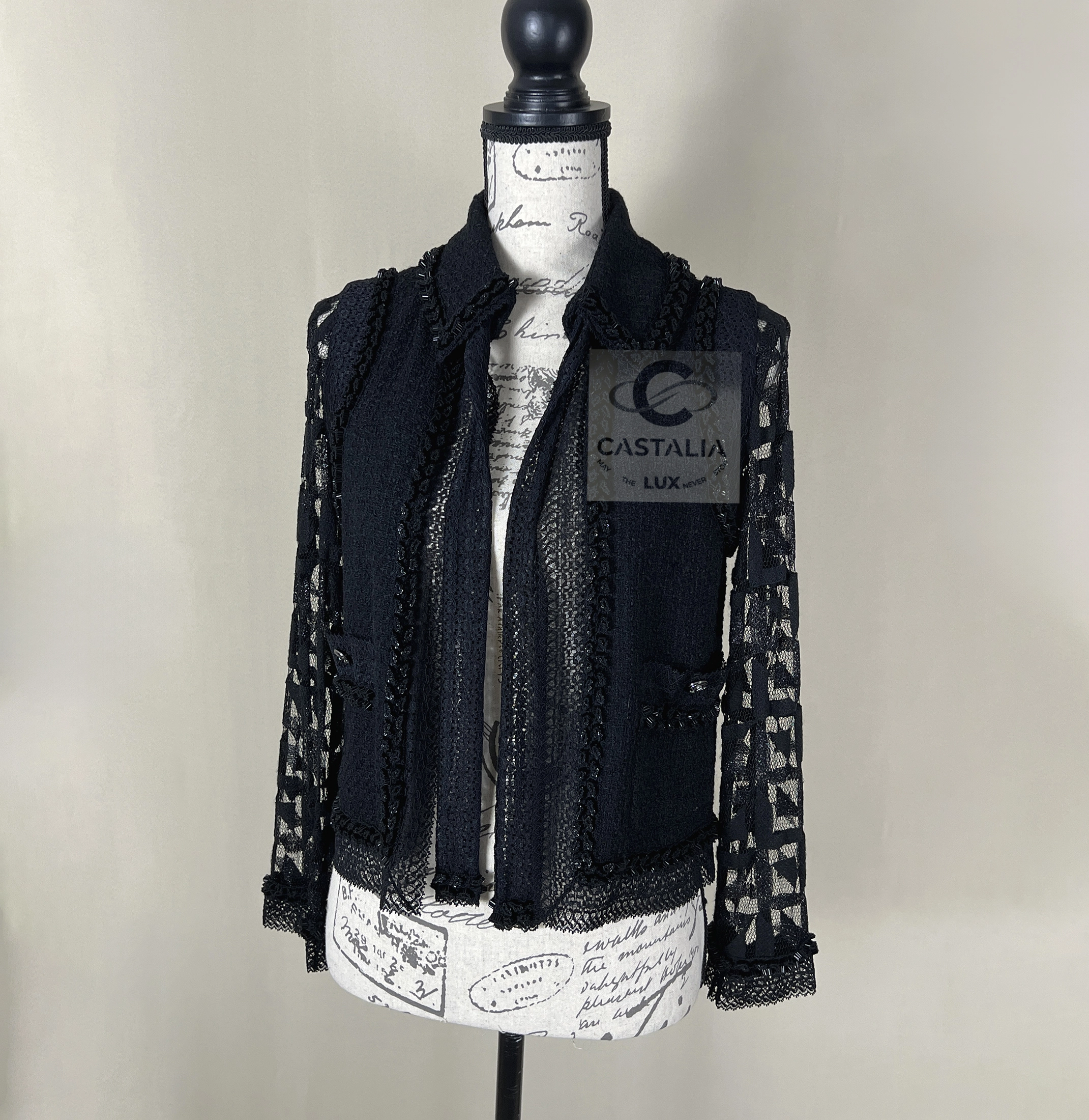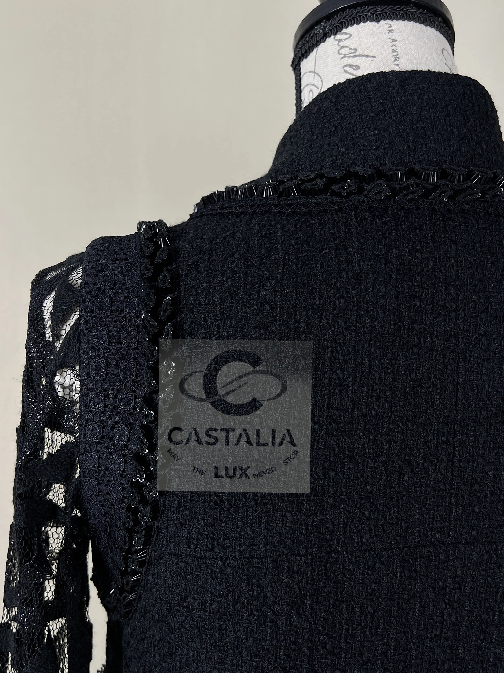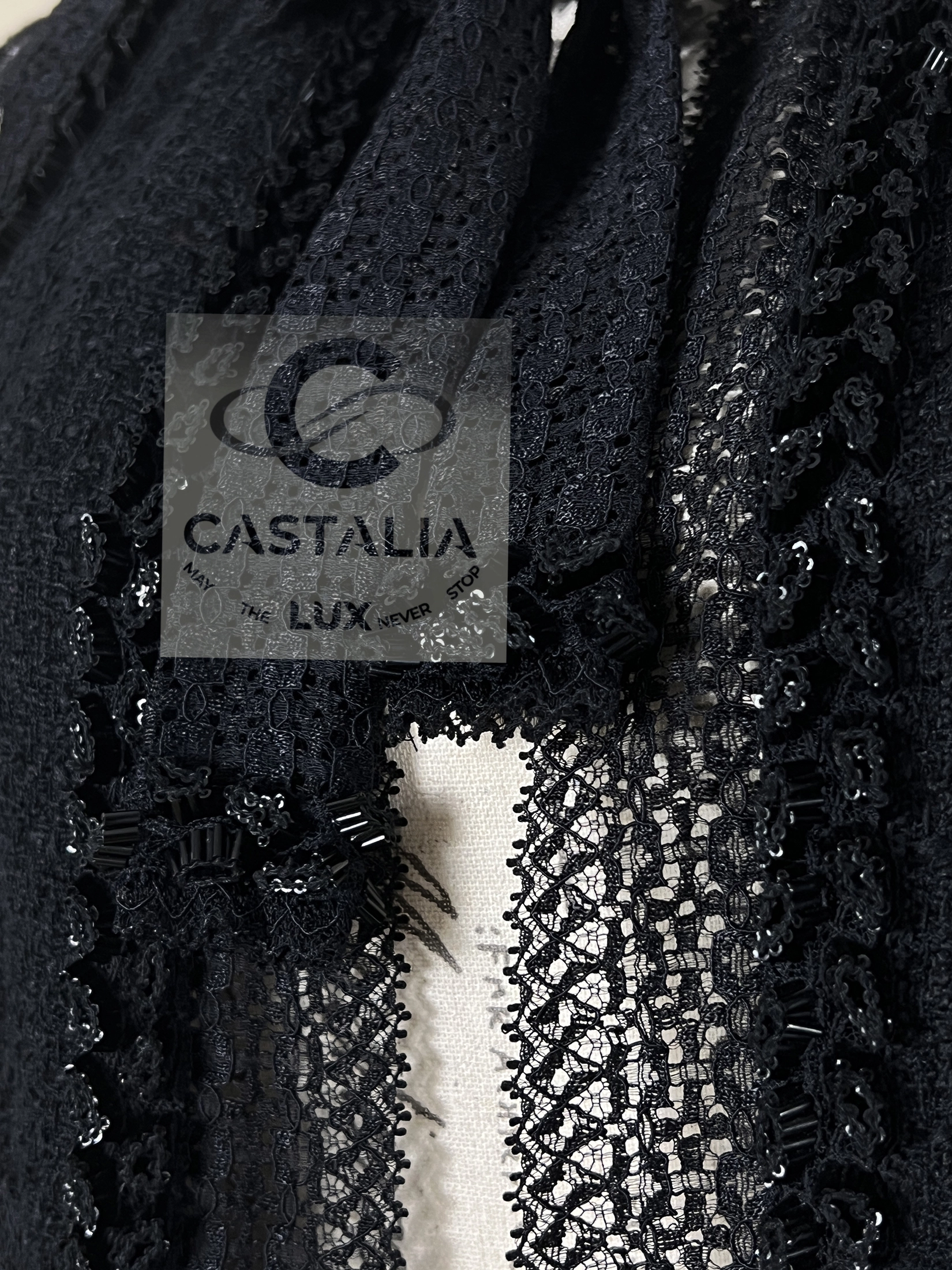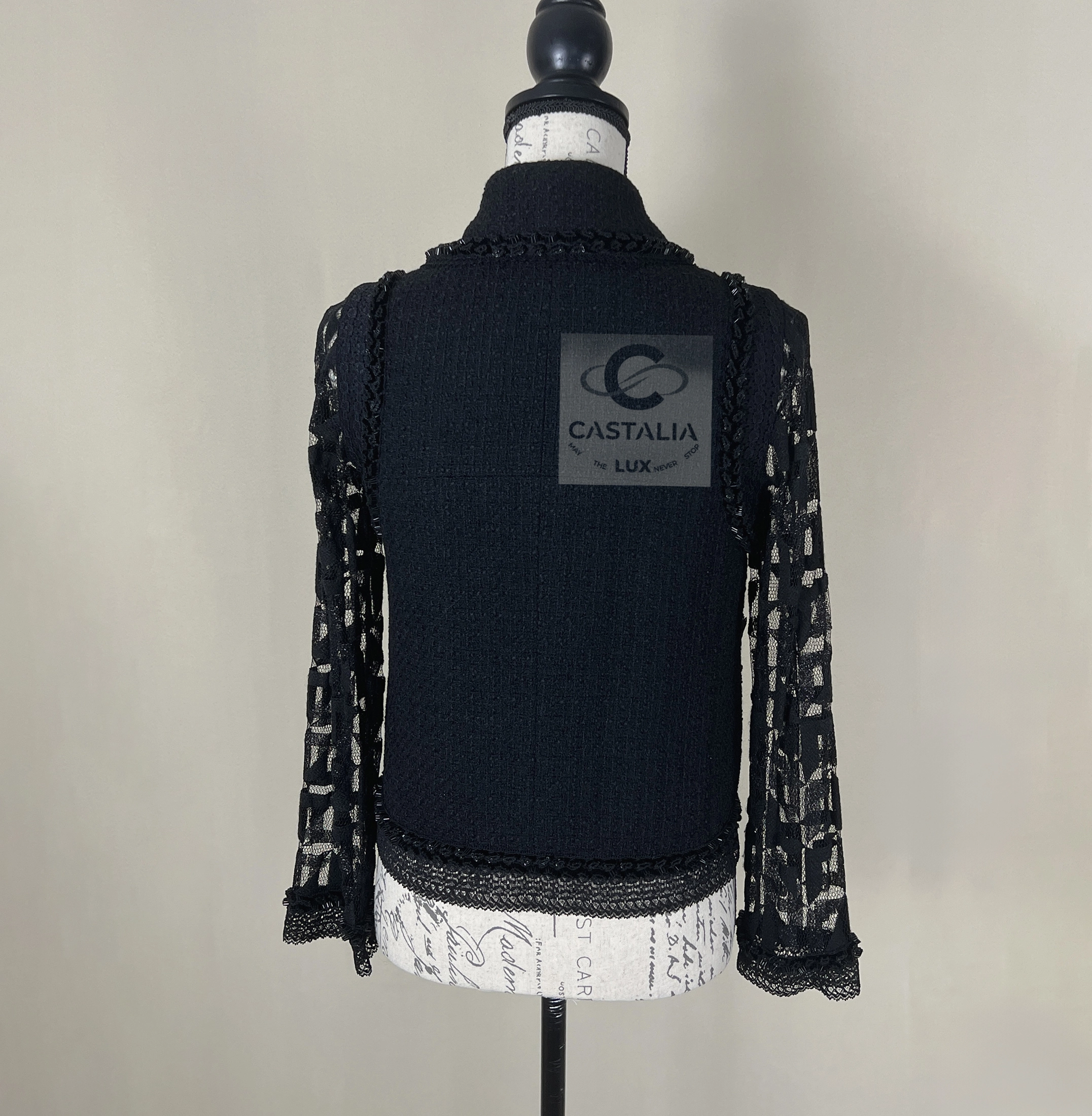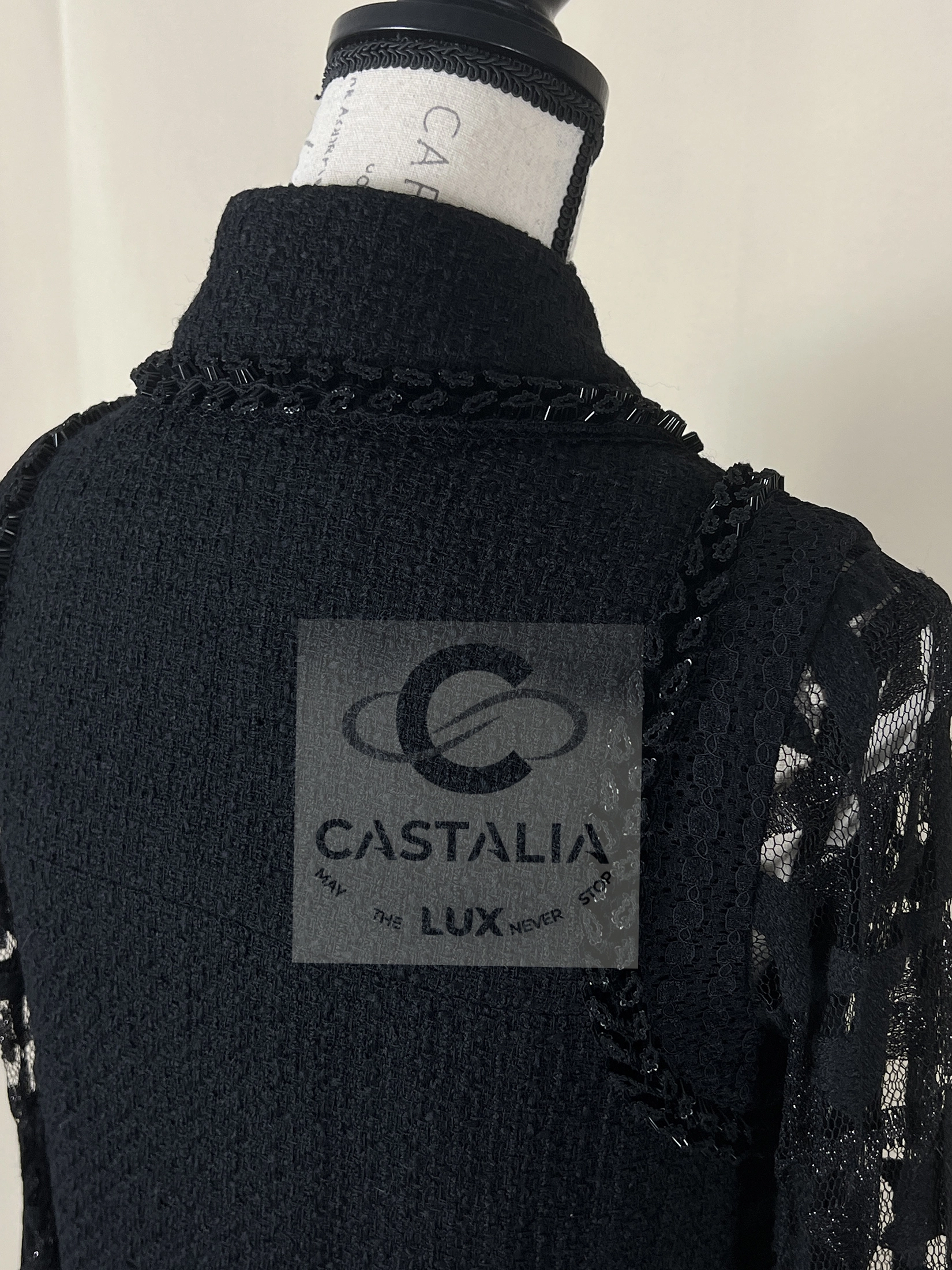 CHANEL Black Tweed & Lace Jacket with Jewel Trim