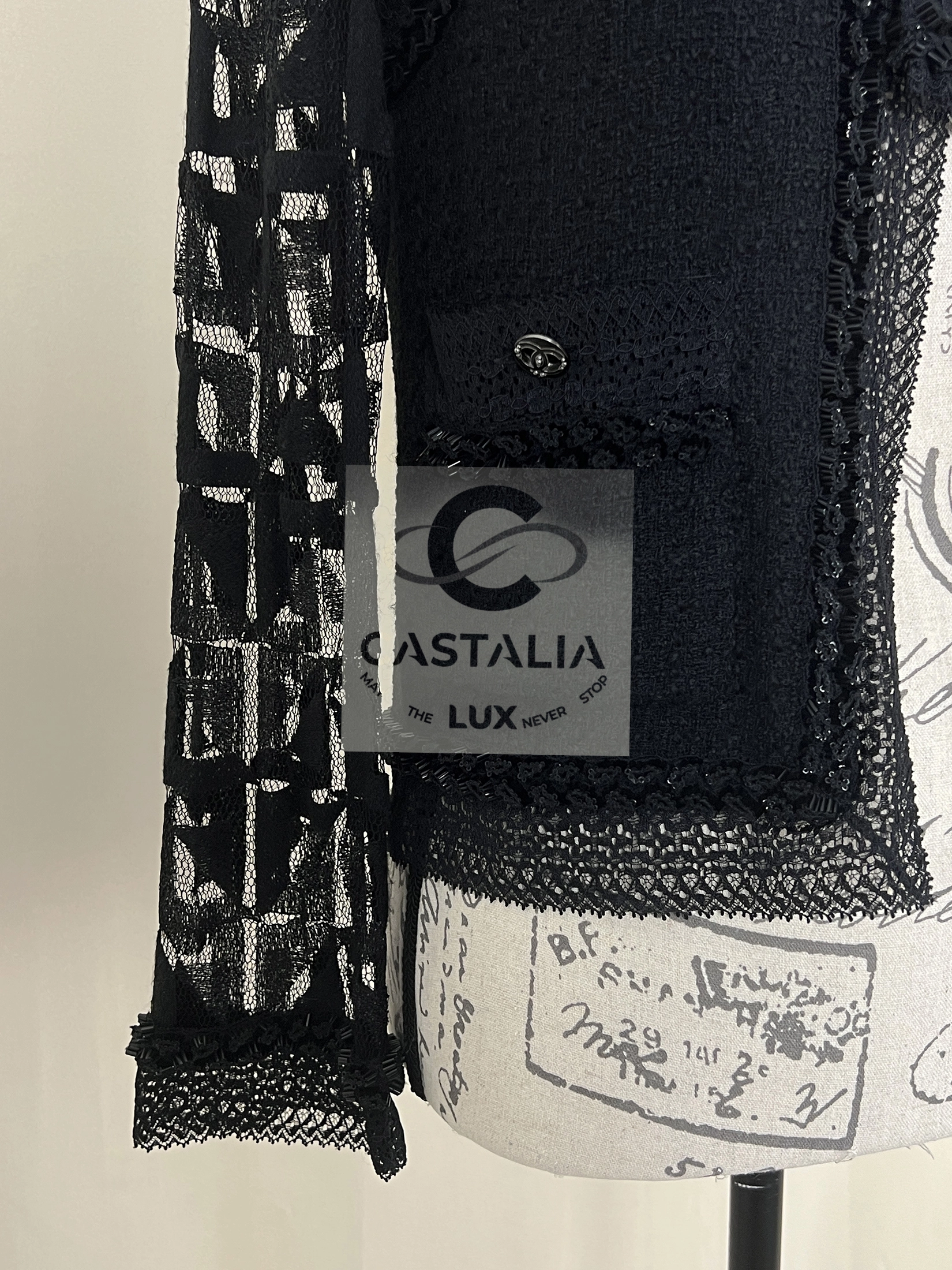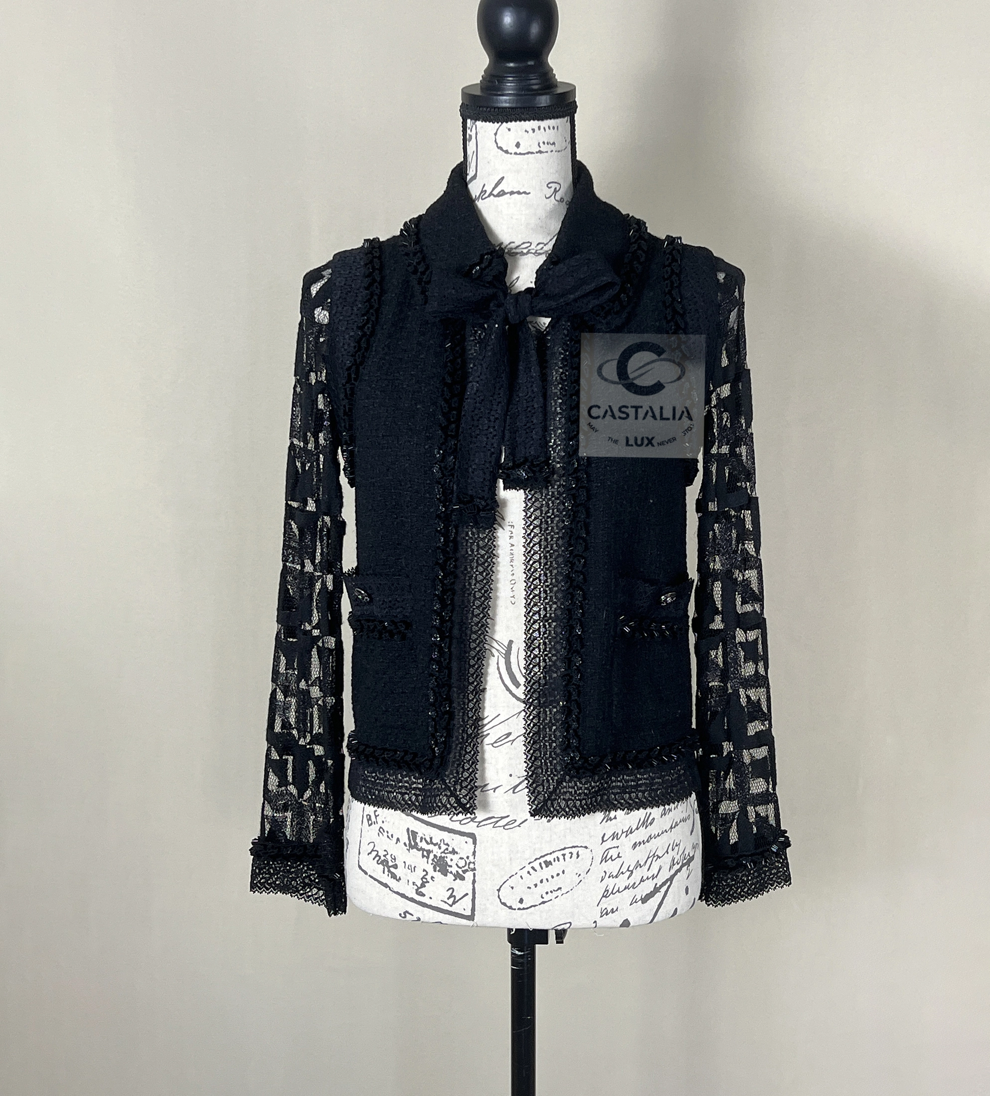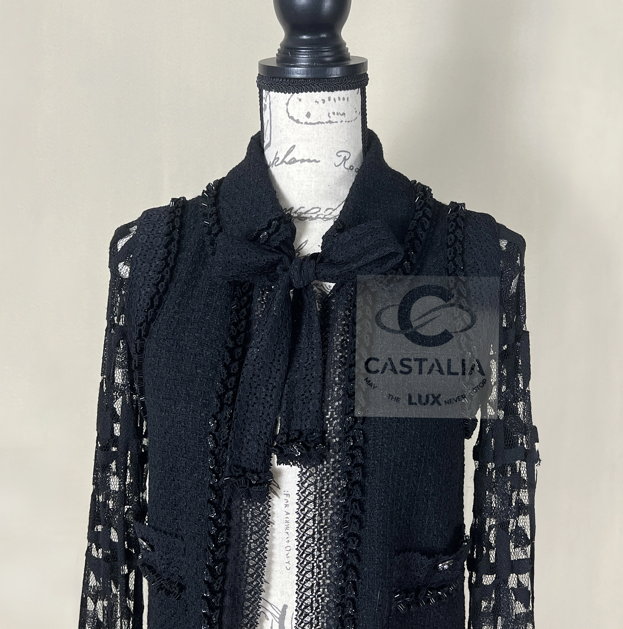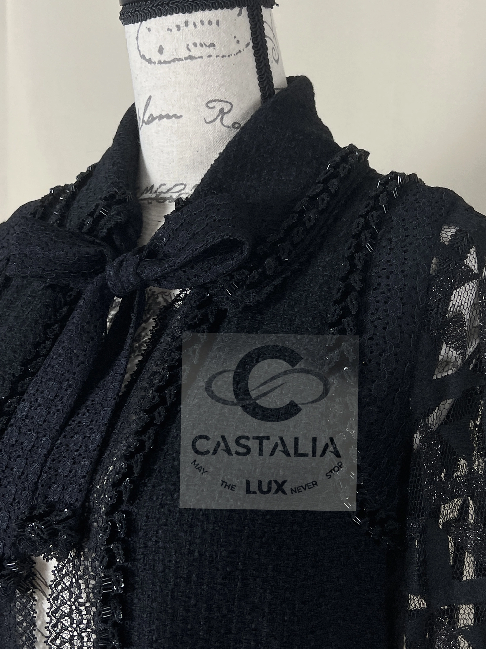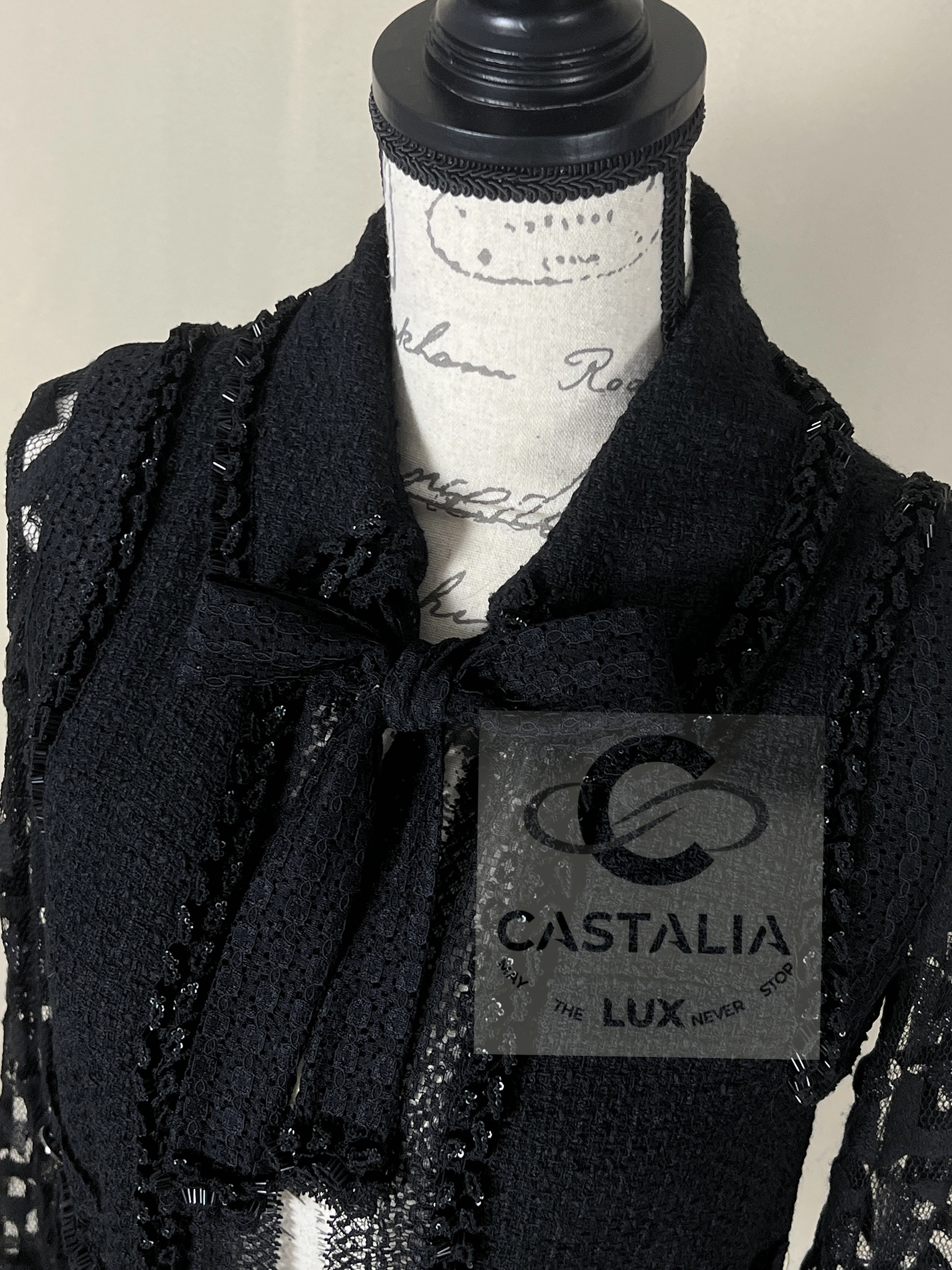 CHANEL Black Tweed & Lace Jacket with Jewel Trim