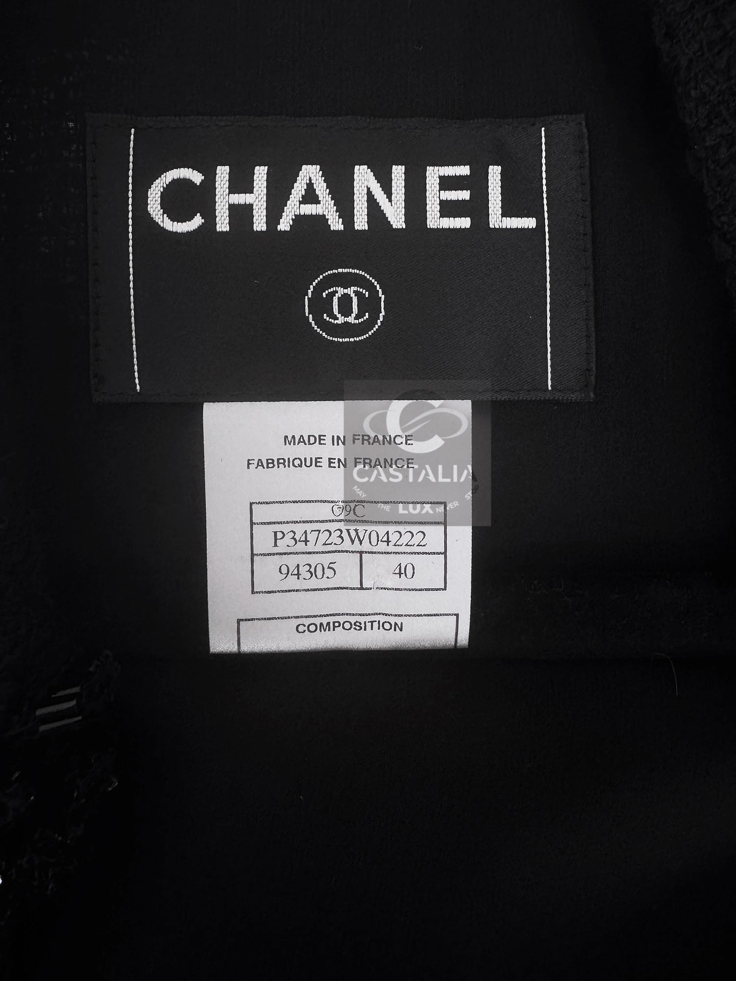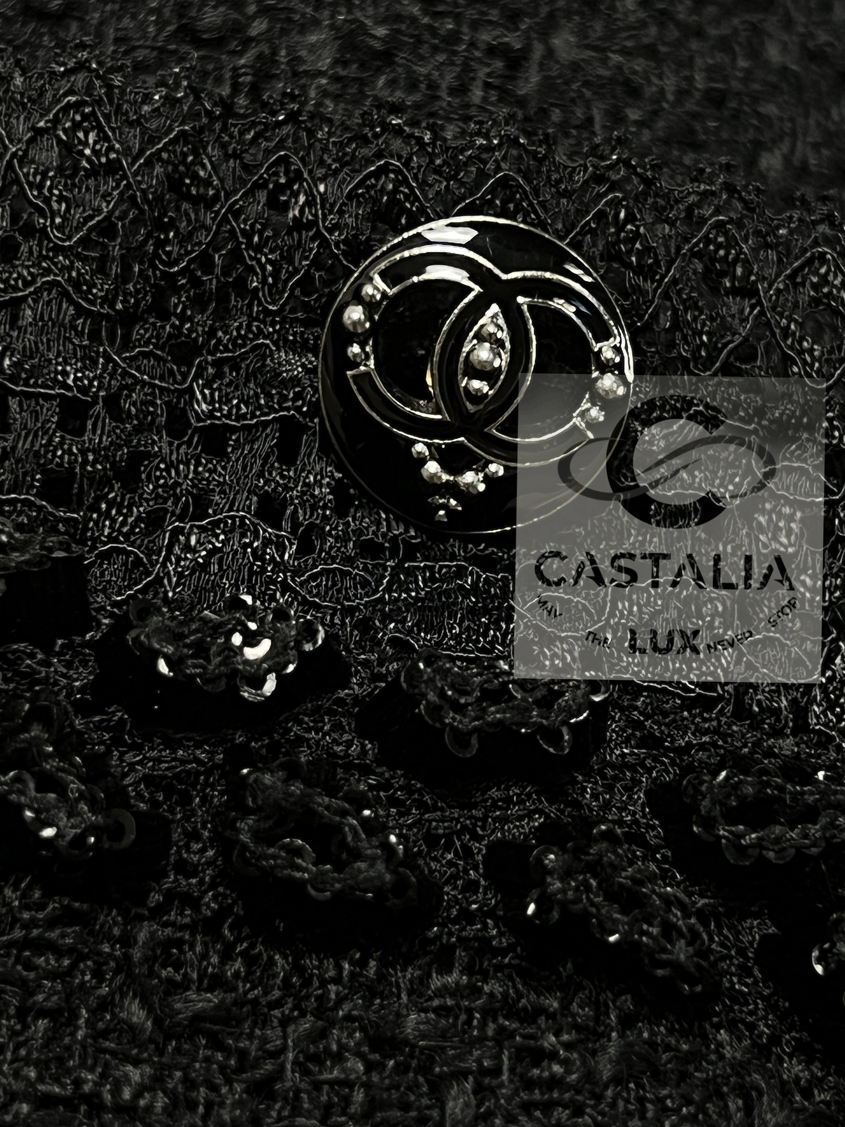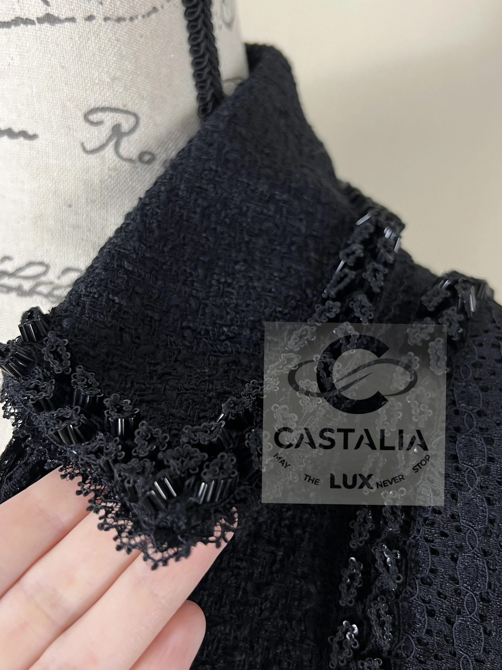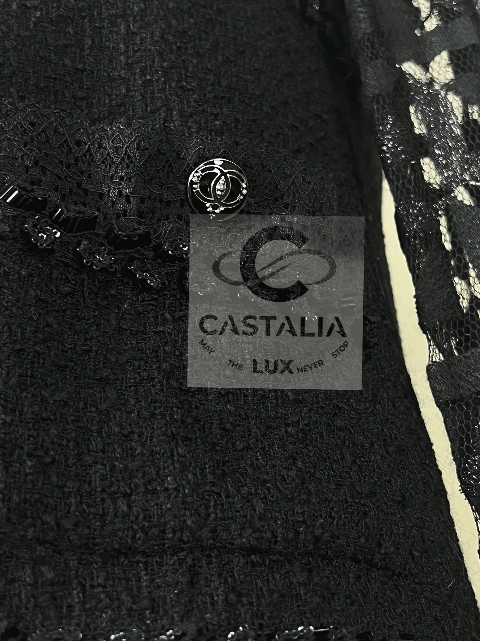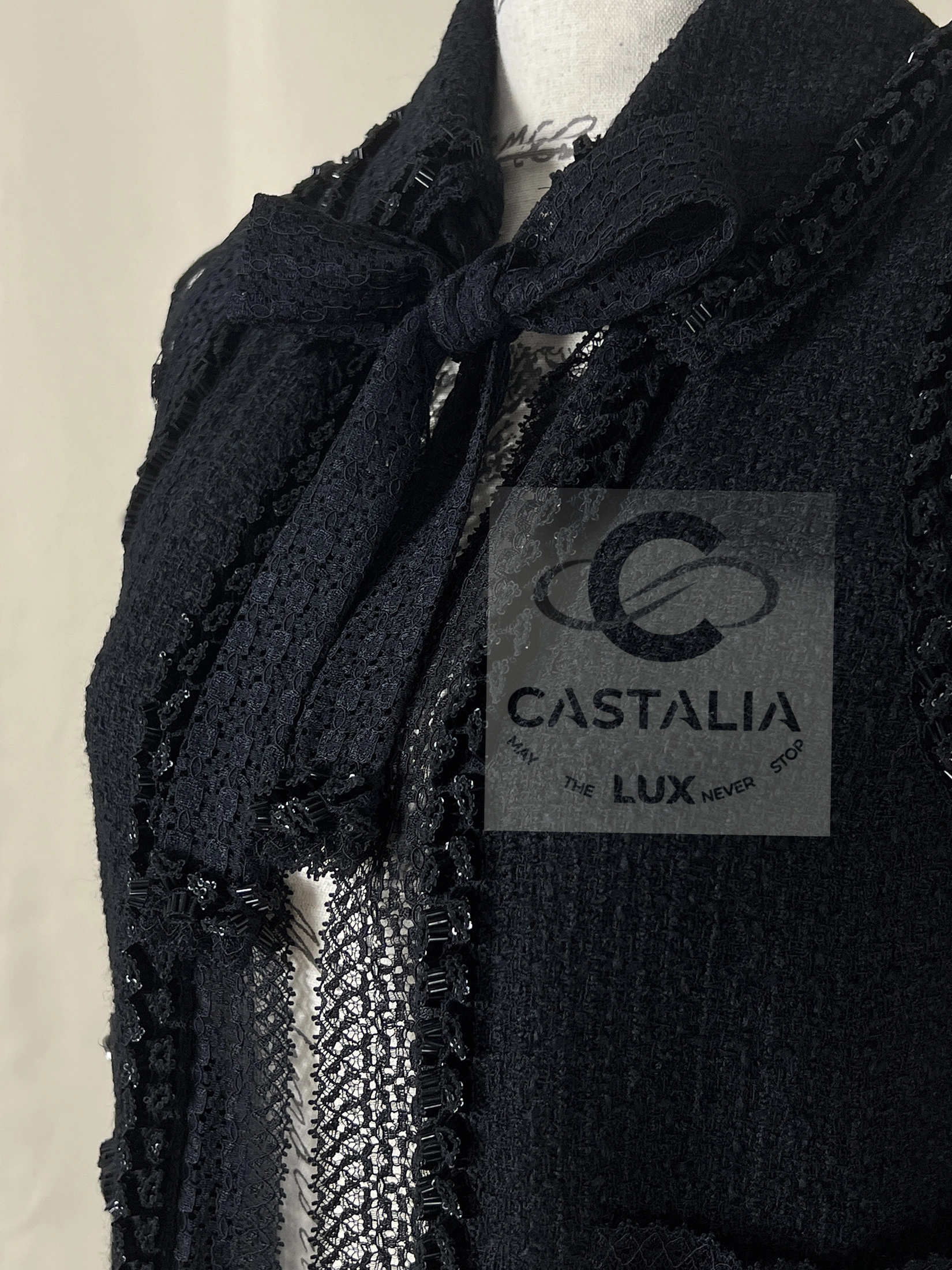 CHANEL Black Tweed & Lace Jacket with Jewel Trim