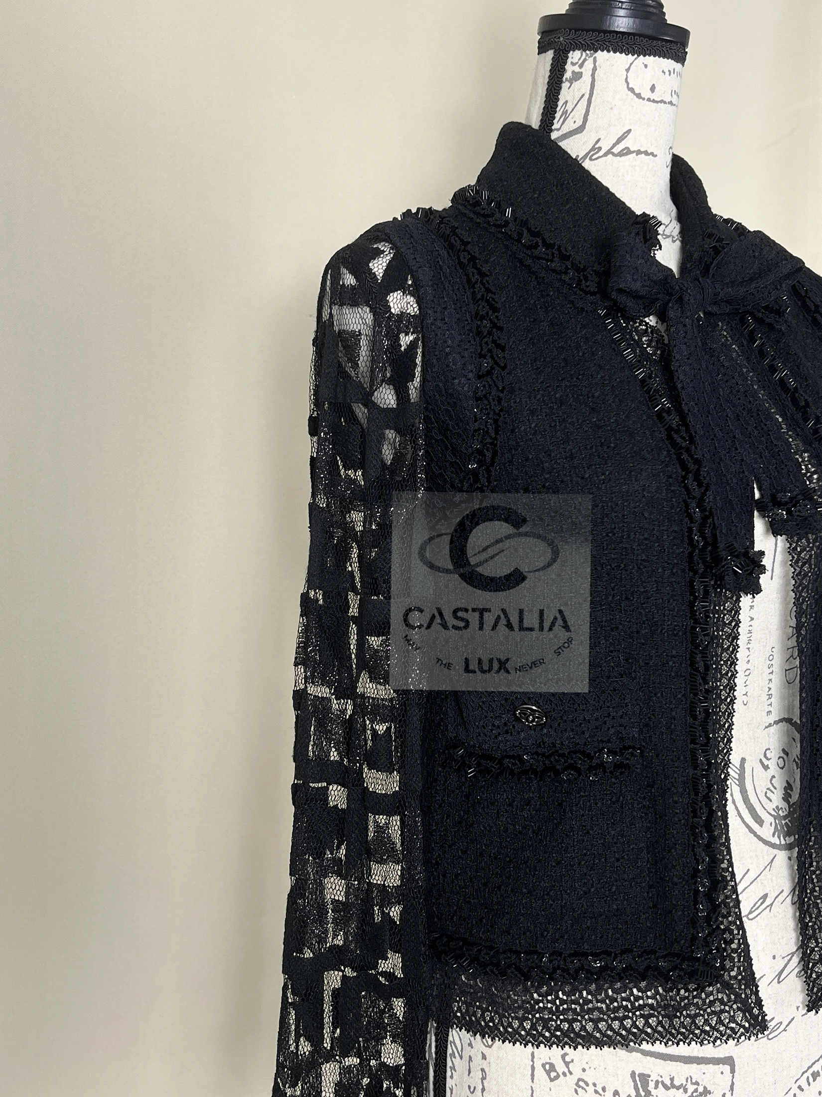 CHANEL Black Tweed & Lace Jacket with Jewel Trim Paris / MIAMI Cruise Collection by Karl Lagerfeld ~ Original boutique value over $12,000 ~ An opulent relic of twilight elegance, this rare Chanel jacket from the Paris–Miami Cruise runway is a collector’s talisman—where structure meets shadowplay ~ Every trim is hand-embellished, each bead a pulse in Chanel’s baroque rhythm ~ this piece speaks not only of fashion, but of ritual—refined, rare, and steeped in myth. // Size mark 40 FR / Condition: never worn // — Cut in rich black tweed and meticulously framed with jewel-like beadwork, it evokes the glimmer of city lights cast across dark ocean waters. — The chest is fastened by iconic heart-shaped CC logo buttons at the pockets, quiet emblems of devotion to house codes. — Intricate lace sleeves—etched with geometric clarity—lend transparency to the silhouette, echoing the porous beauty of moonlit facades — Finished with a black silk lining that moves like ink through water