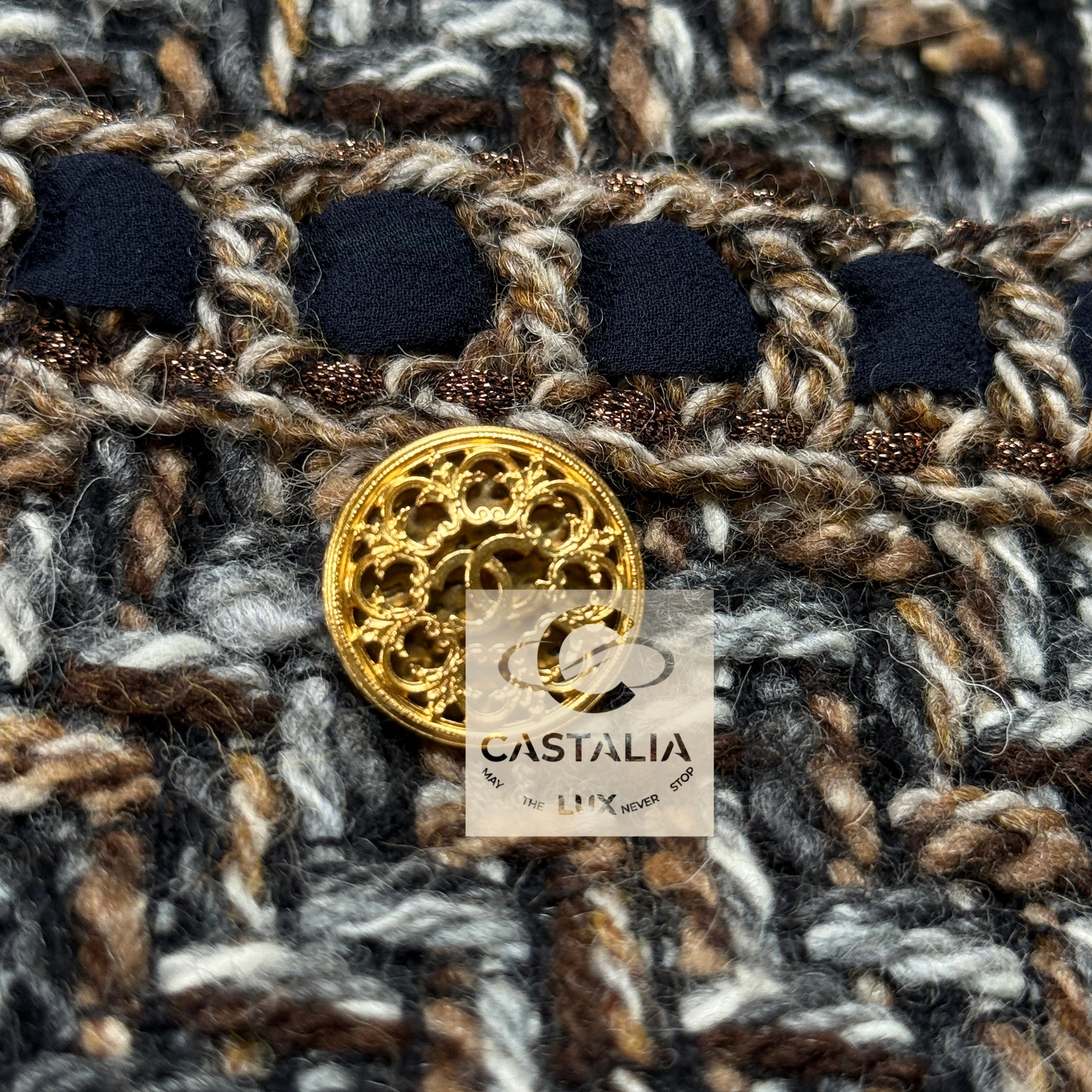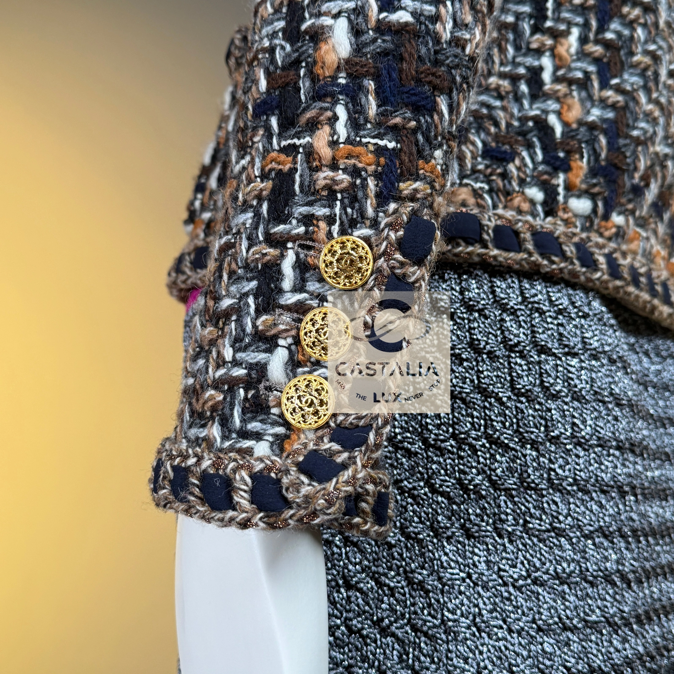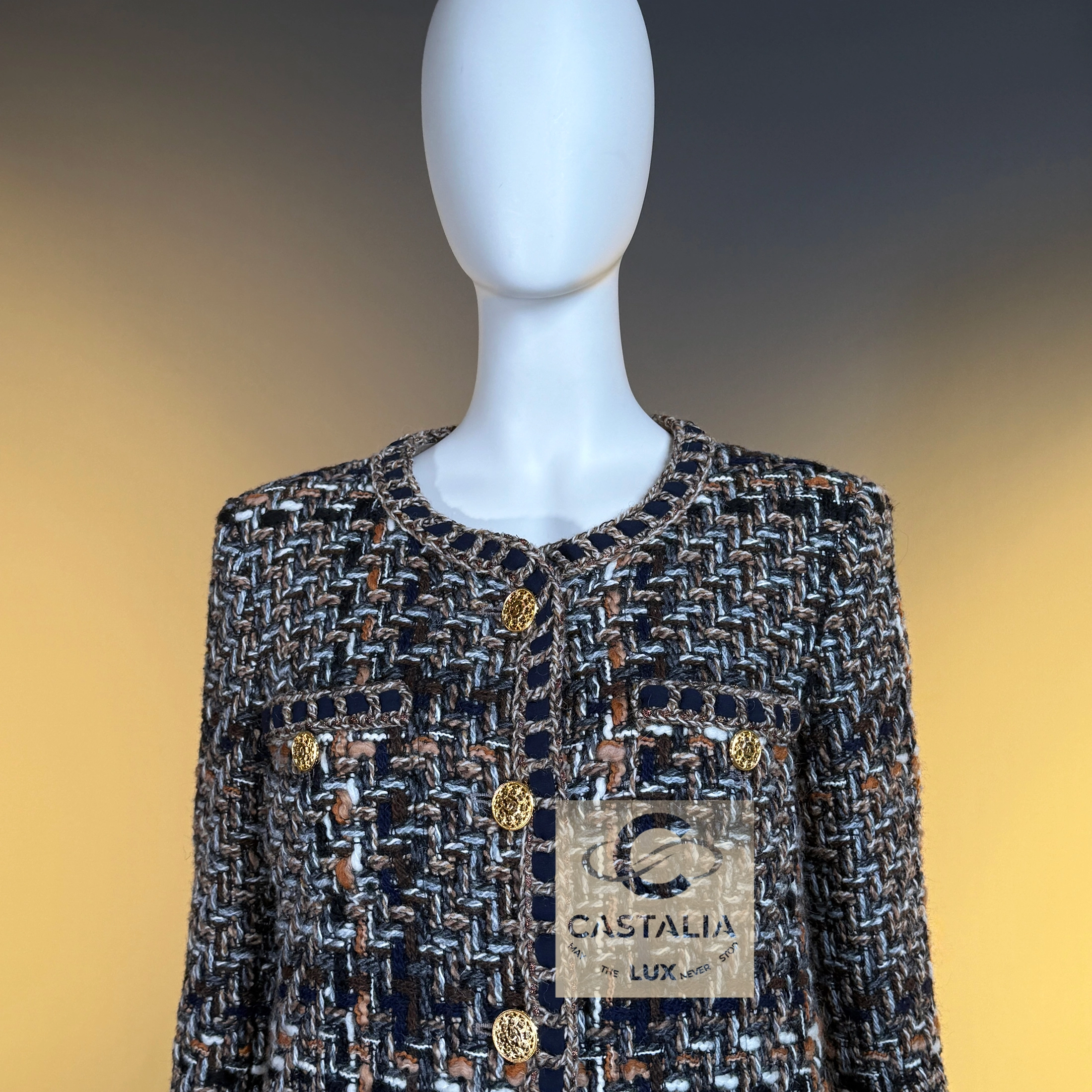 — Masterpiece jewel-like buttons in gold tone, embossed with the CC insignia, adorn the front and cuffs like miniature medallions of power