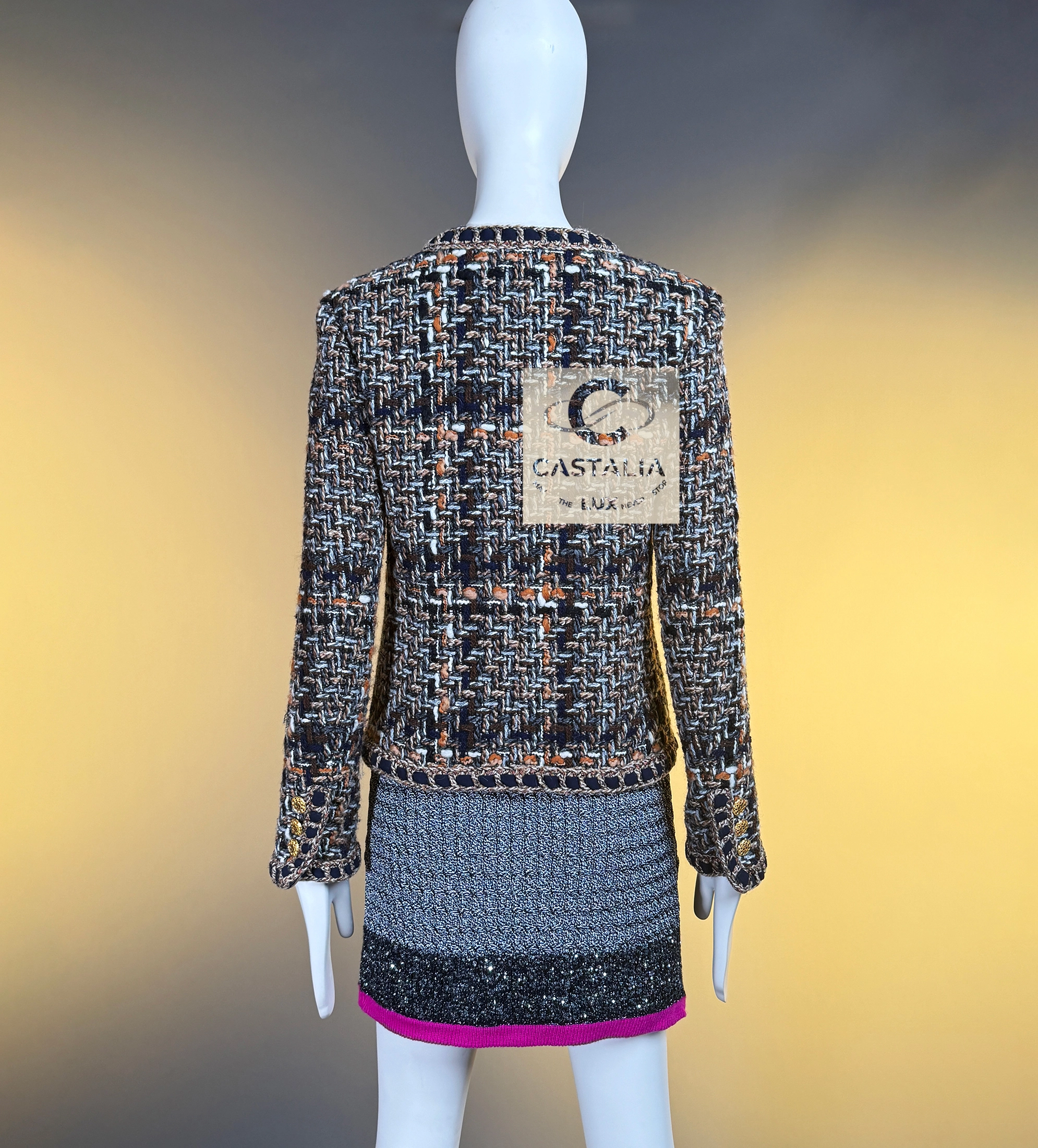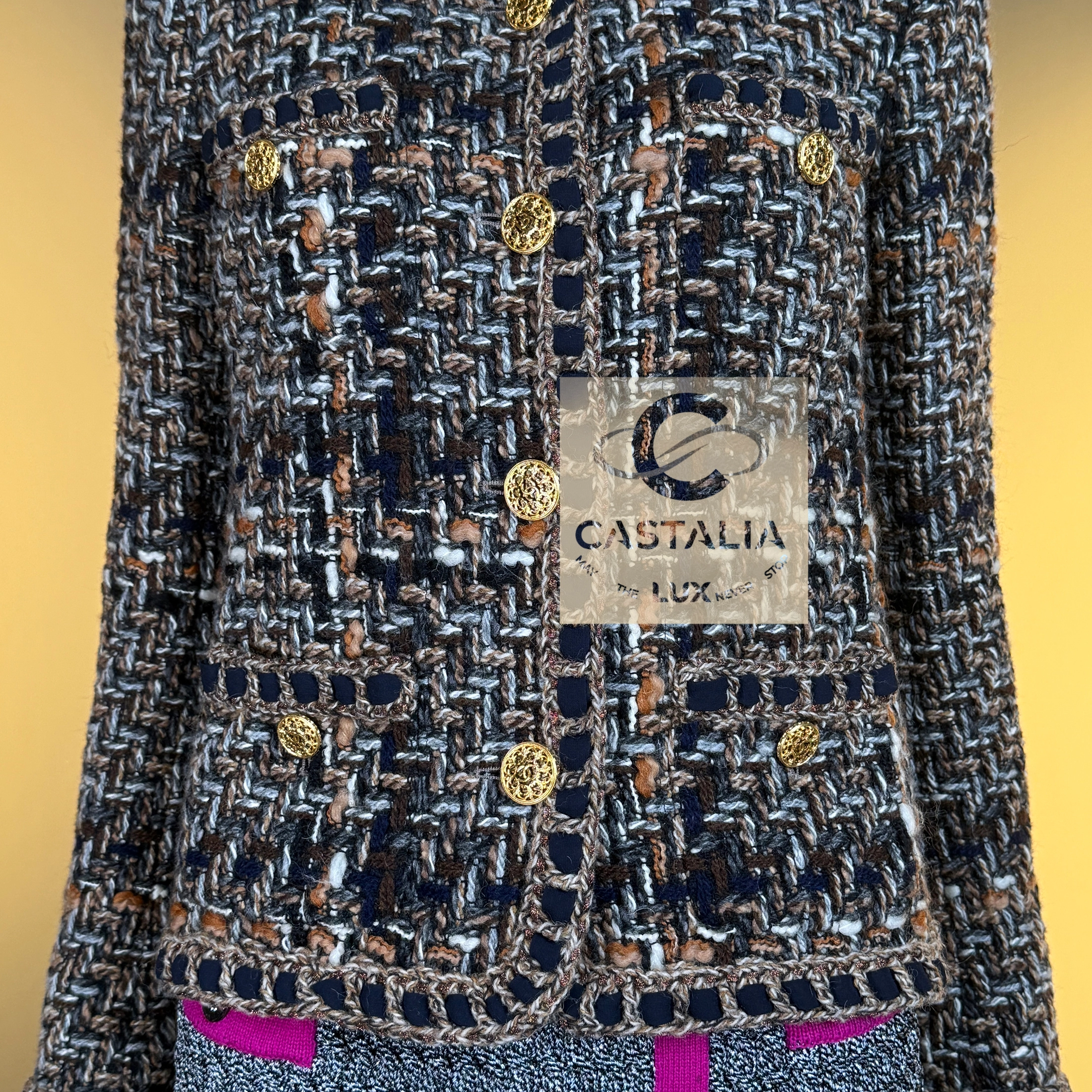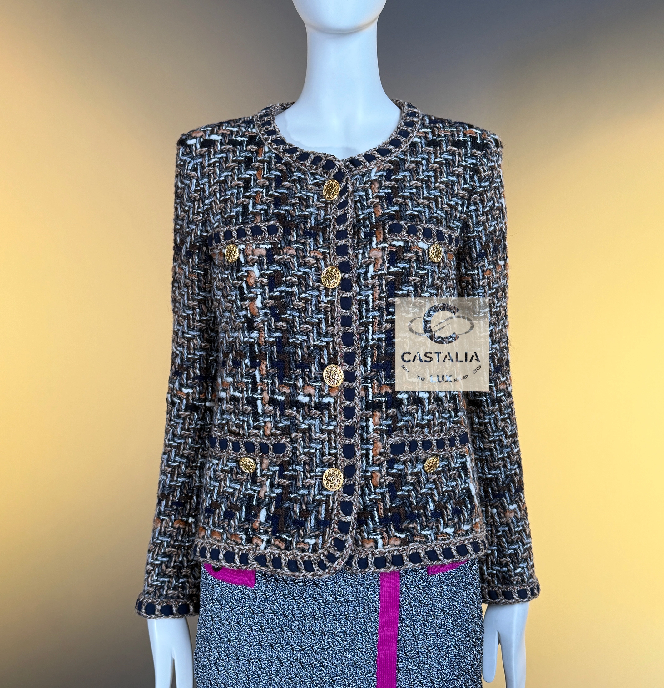 — Masterpiece jewel-like buttons in gold tone, embossed with the CC insignia, adorn the front and cuffs like miniature medallions of power