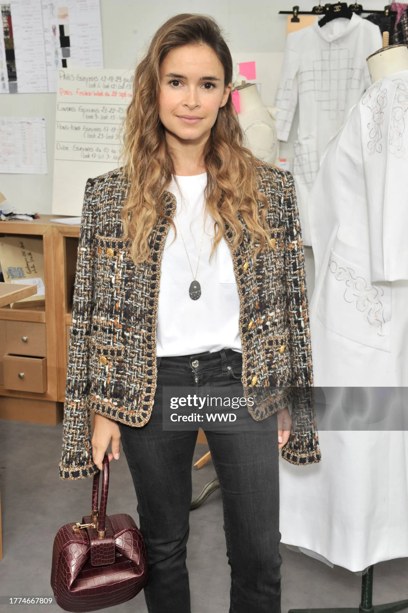 — Crafted from precious Lesage tweed, woven in interlaced shades of beige, black, and brown, the textile evokes both sepia film reels and eternal Roman stones