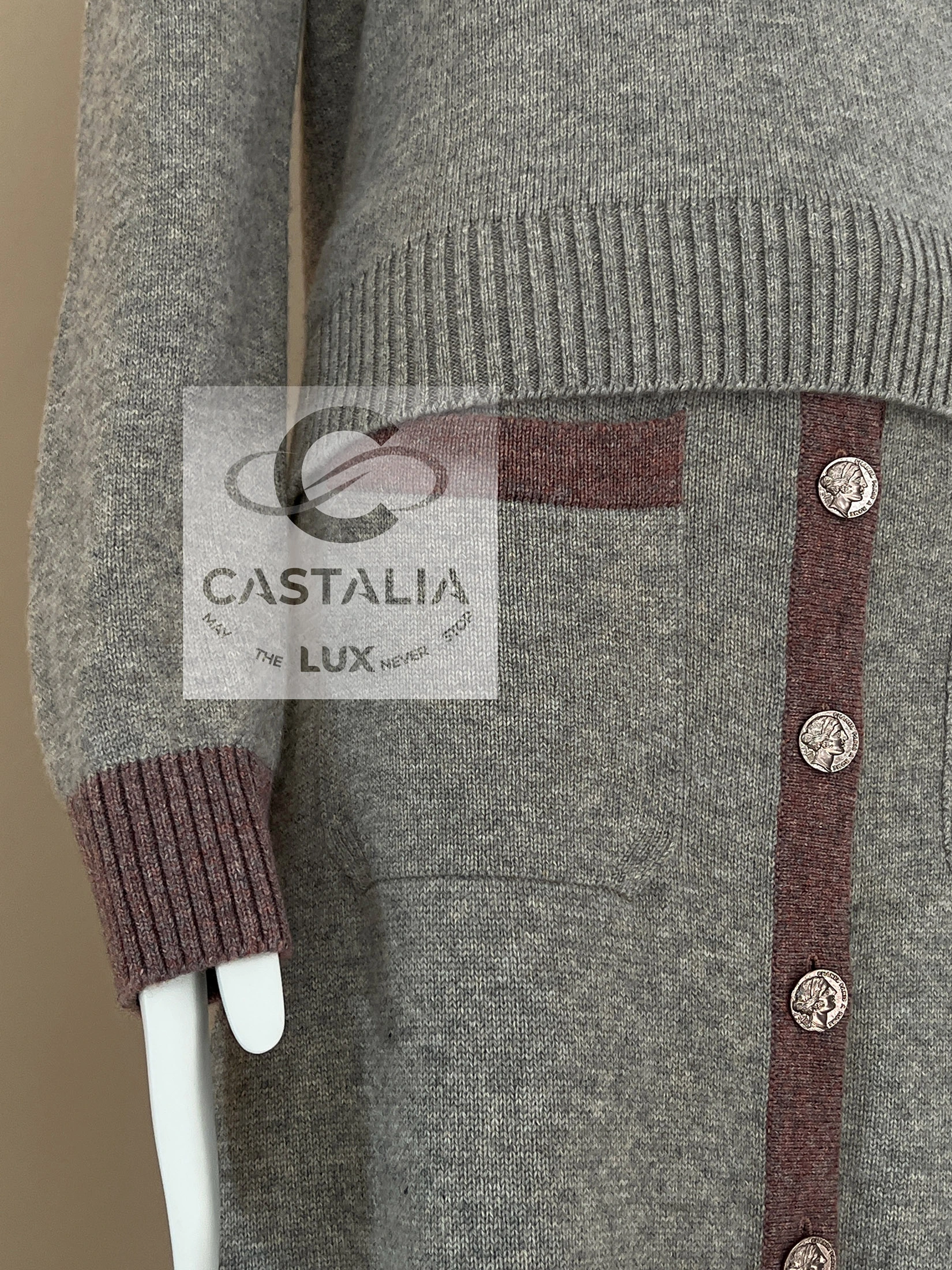~ V-neck sweater descends with monastic purity, framed by chestnut rib trims reminiscent of ancient fresco borders guarding forgotten truths