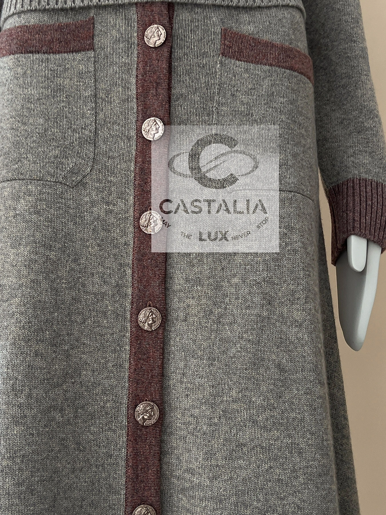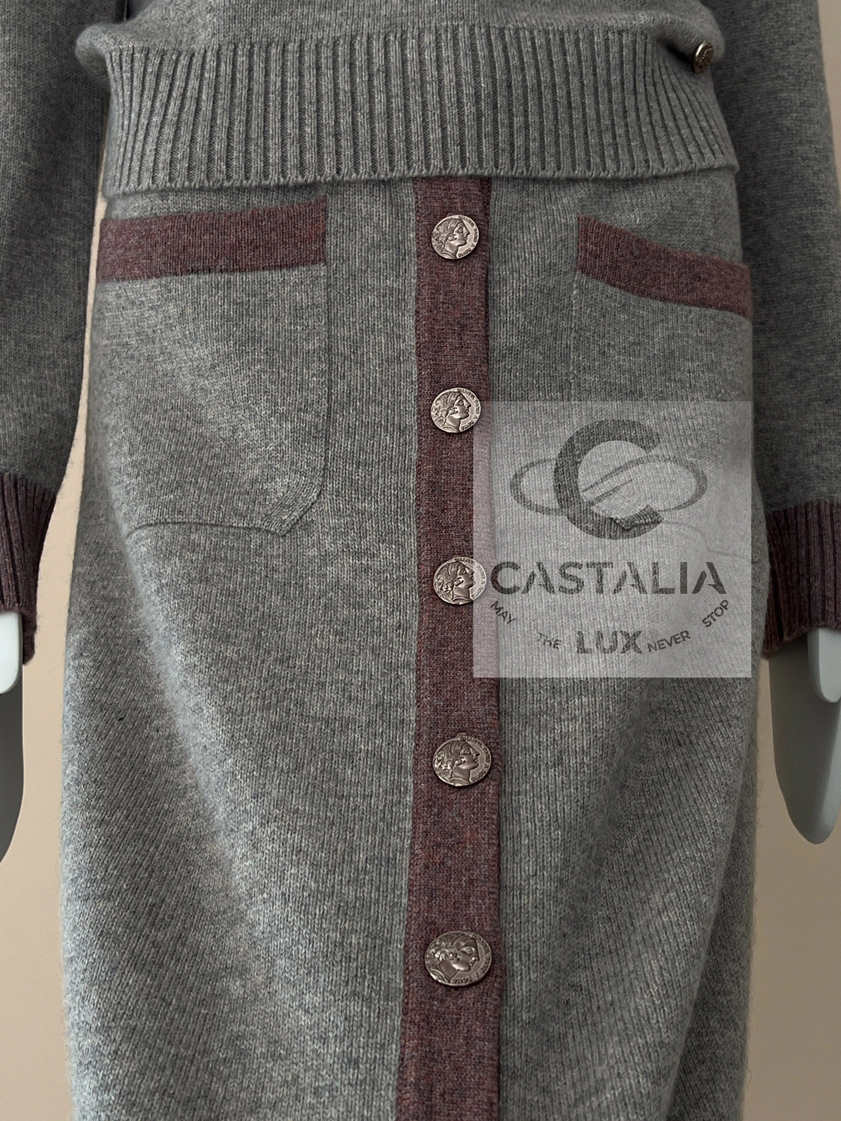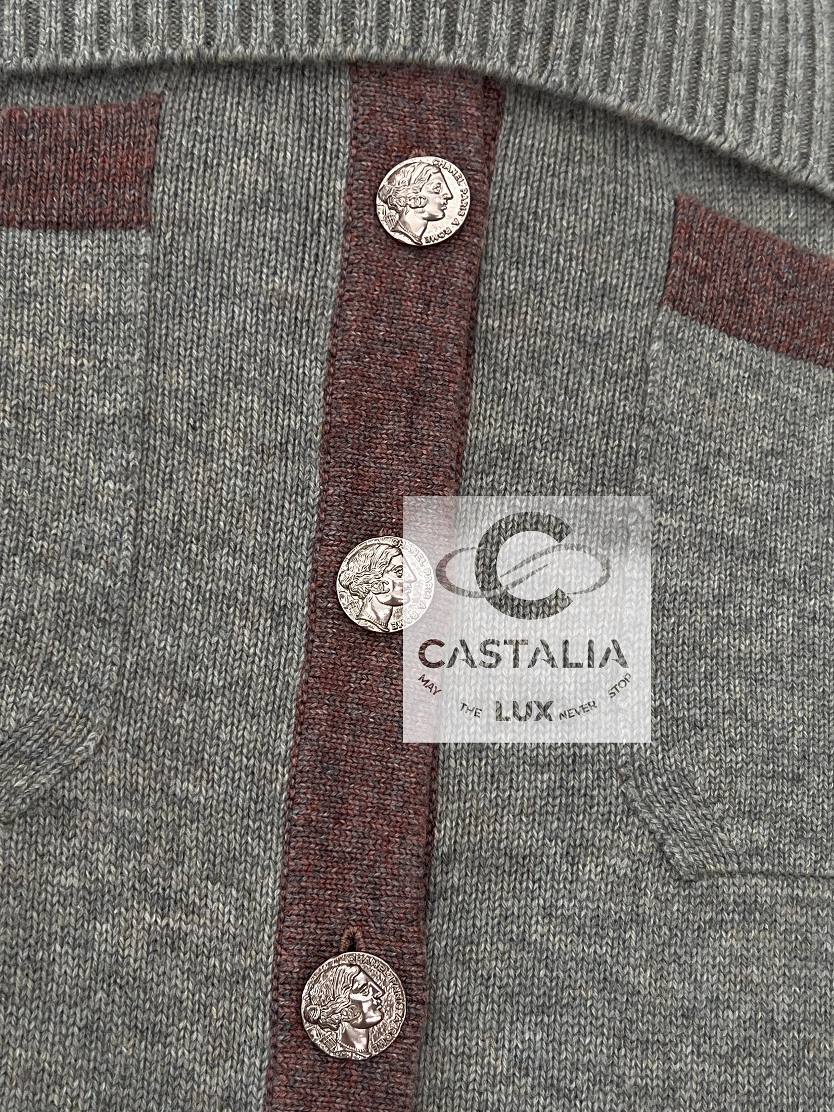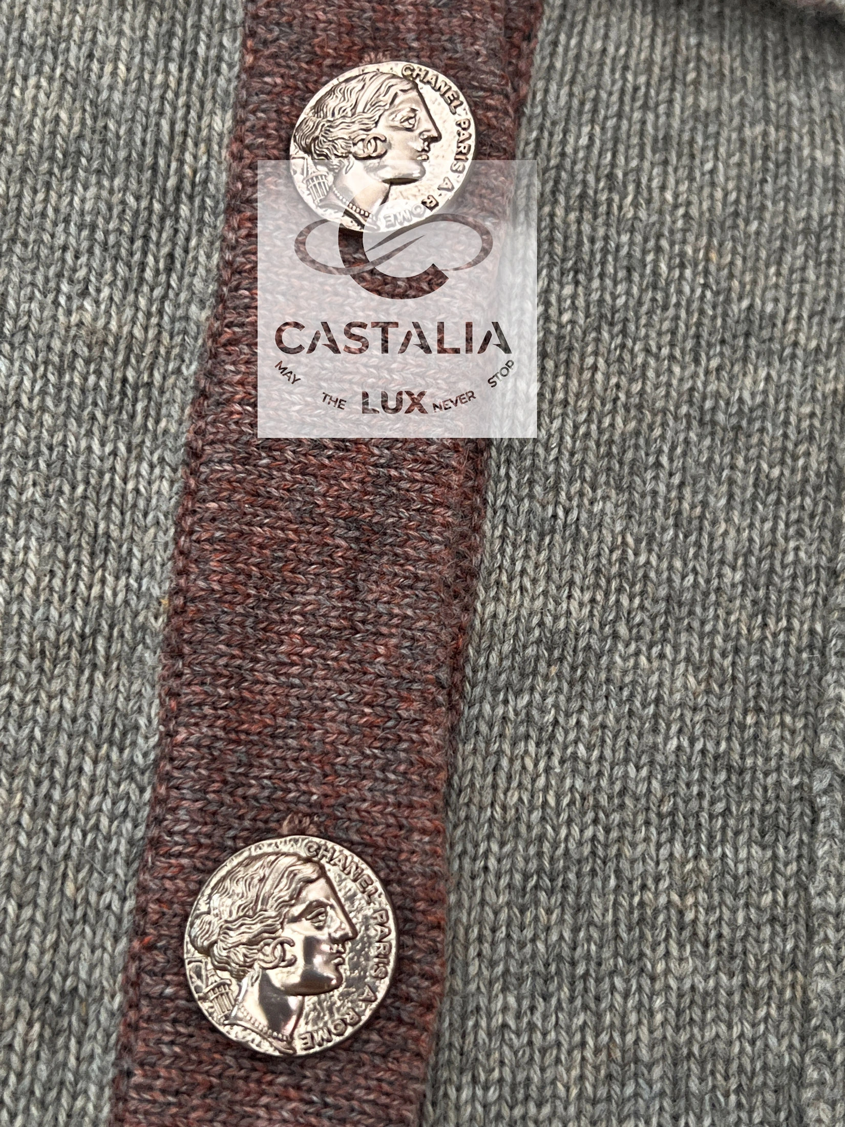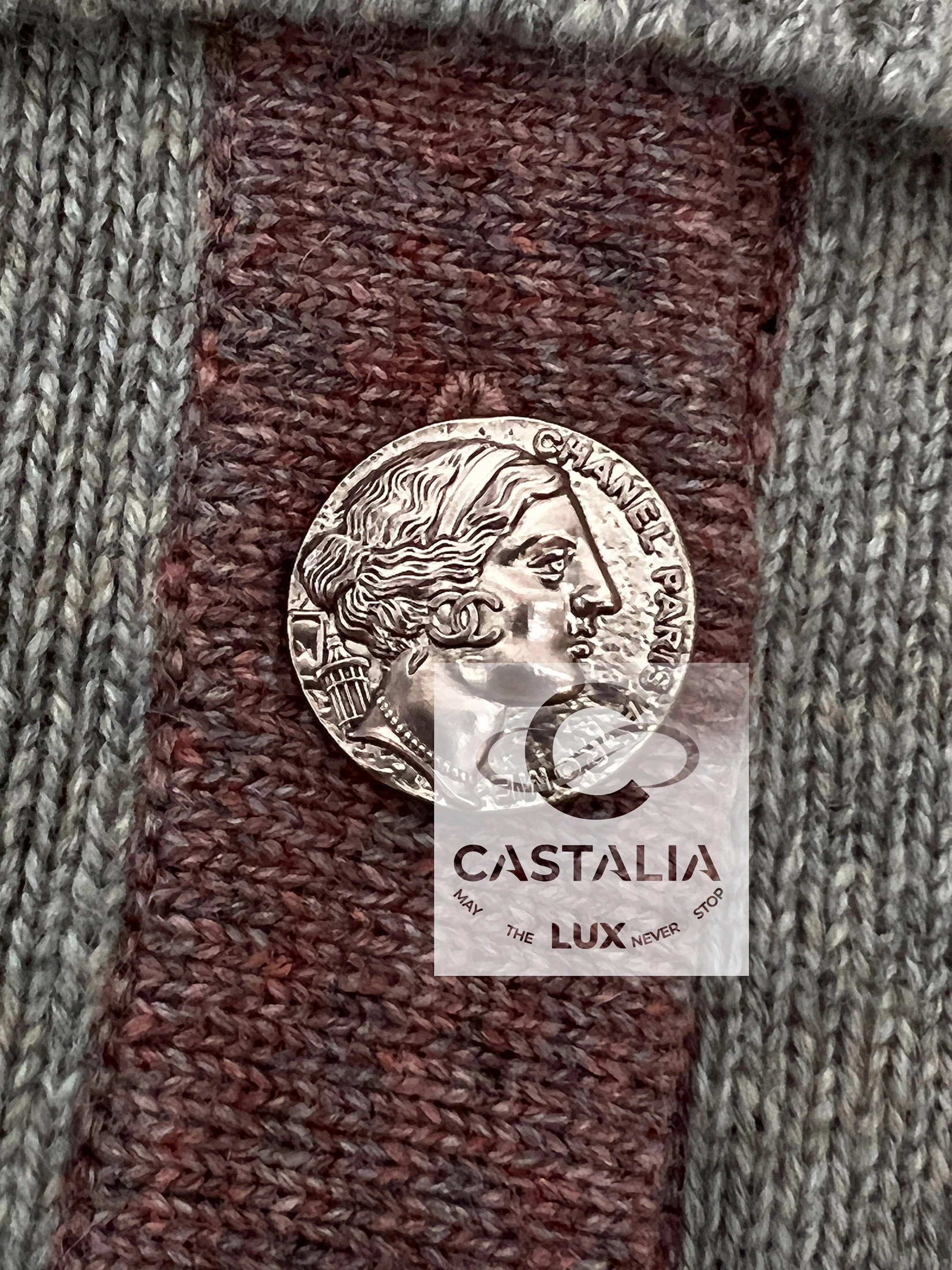 ~ Adorned with CC logo buttons sculpted in Roman profile reliefs – coins of Roman memory, talismans anchoring the wearer to a lineage beyond temporal decay and in parallel Lagerfeld’s cinematic homage to La Dolce Vita