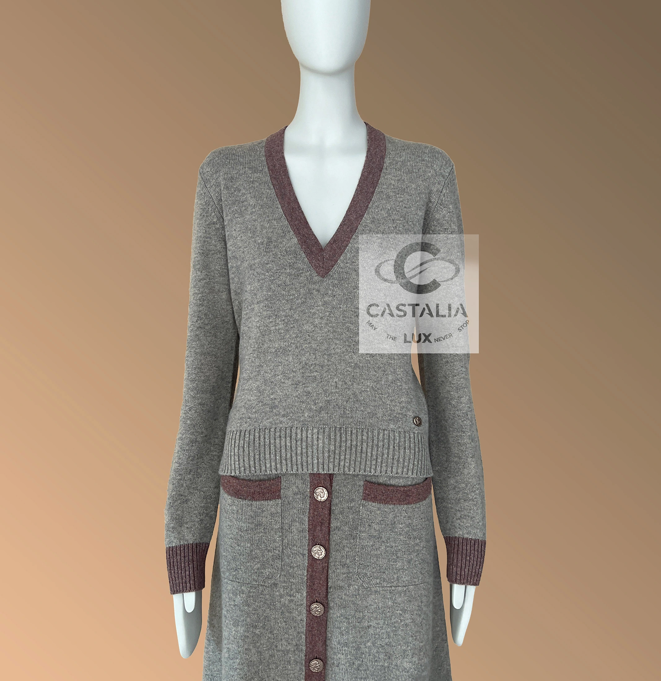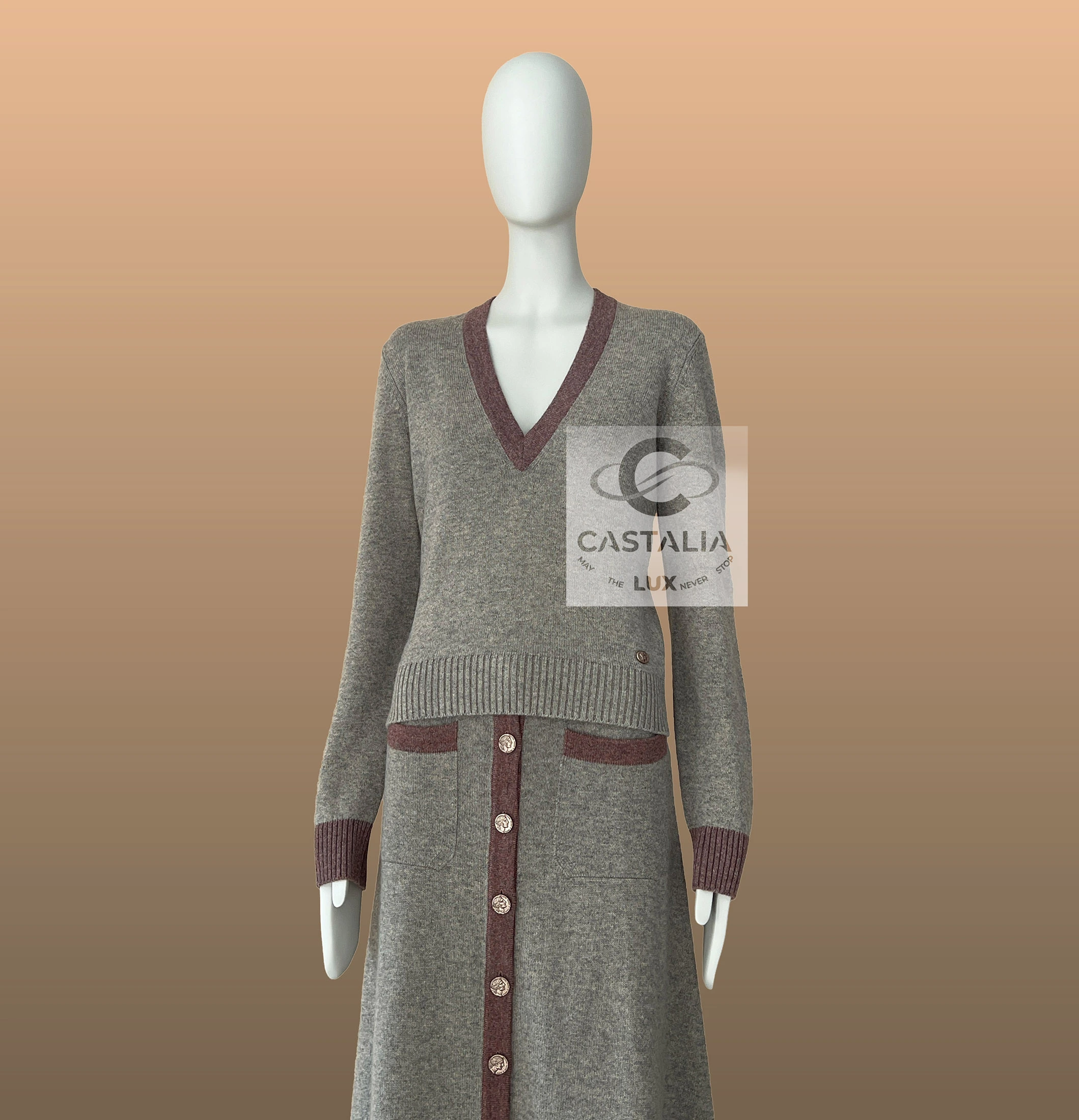 ~ Crafted in the softest beige cashmere knit, this two-piece suit embodies quiet inner strength and feminine grace