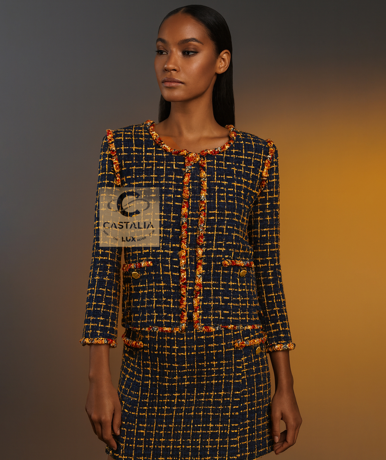 — Woven from the most precious Lesage ribbon tweed, a lattice of black interlaced with amber and marigold ribbons, its structure glows like a night sky threaded with embers